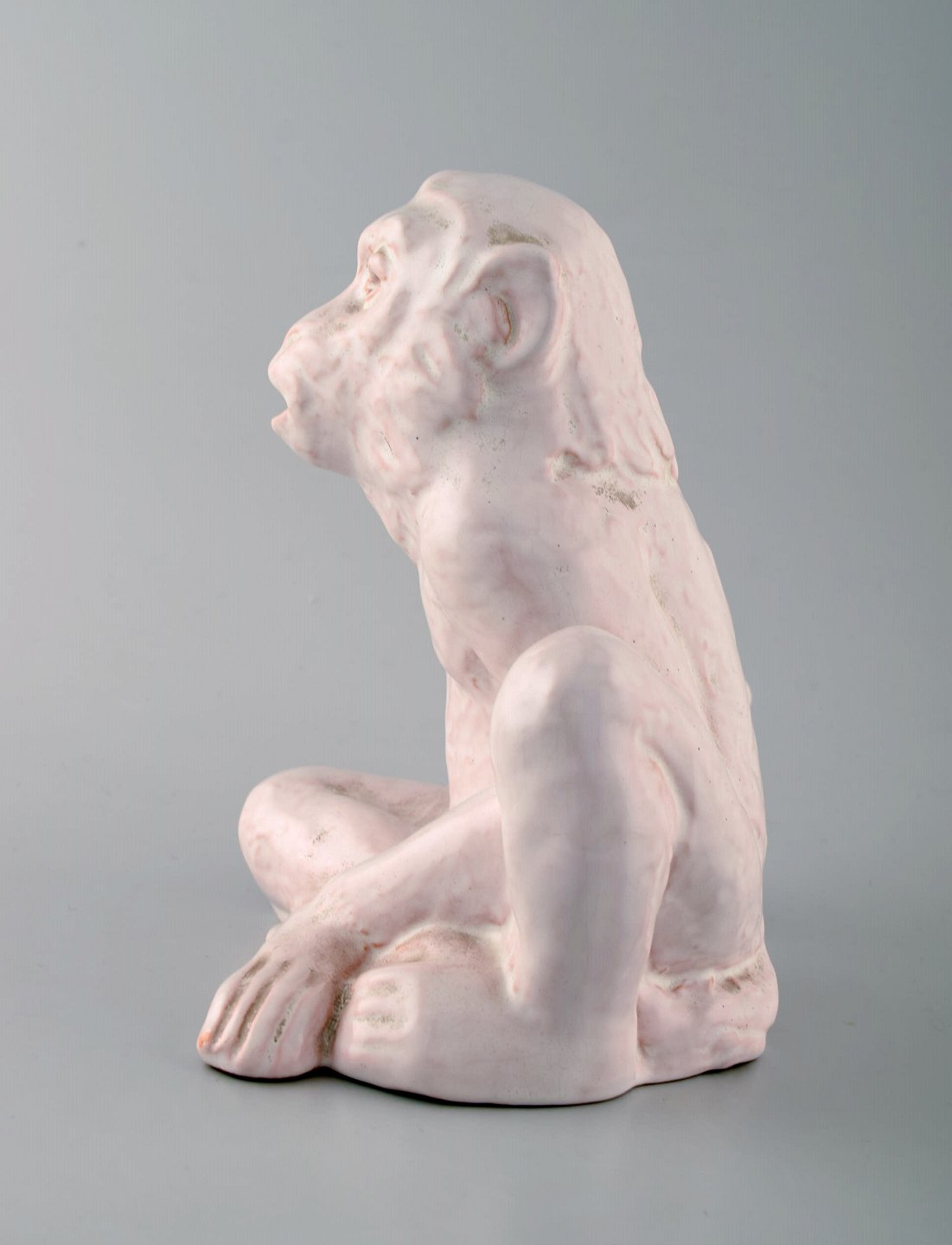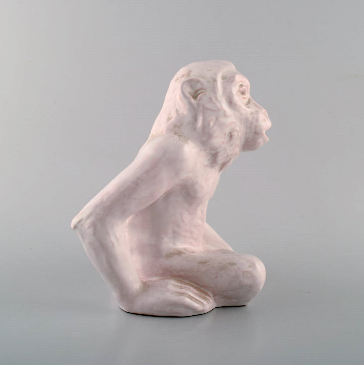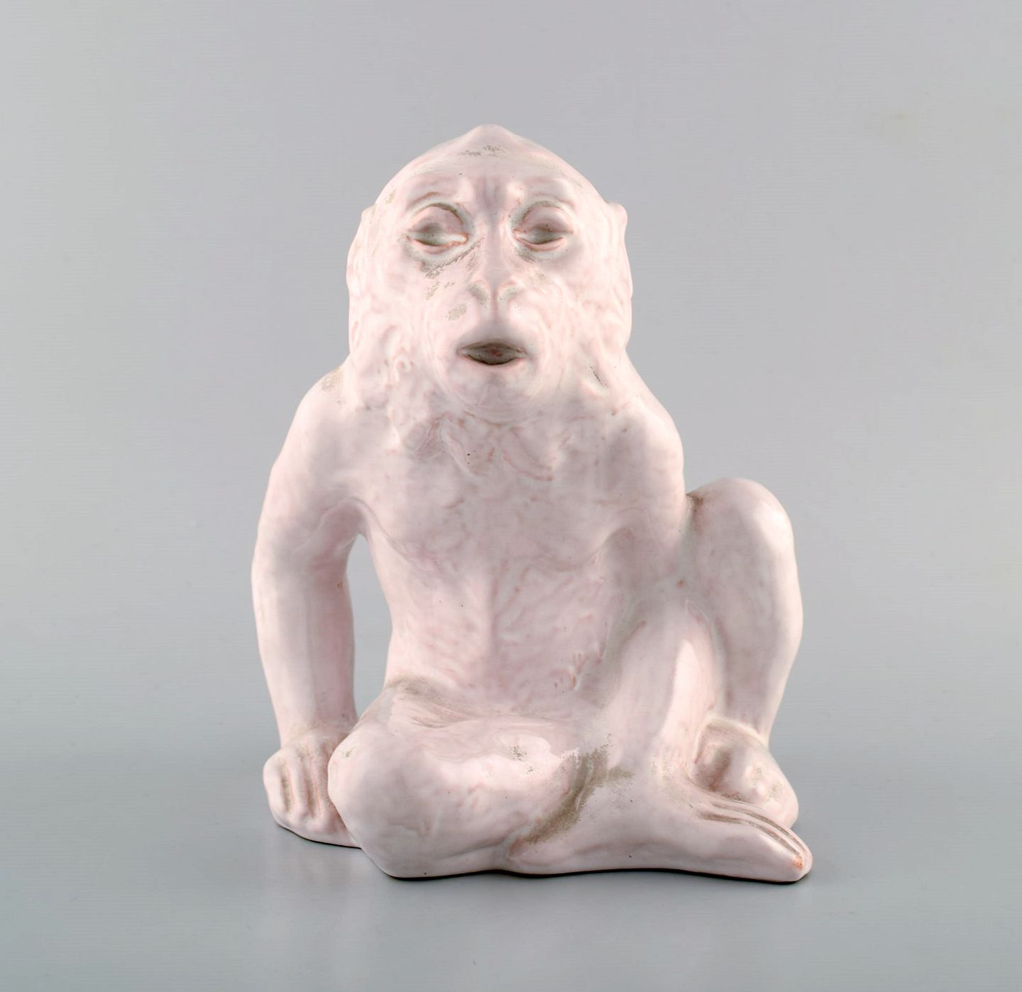 Hjorth (Bornholm) glaseret stentøjsfigur, siddende abe. Ca. 1950erne. Hvidglaseret glasur.