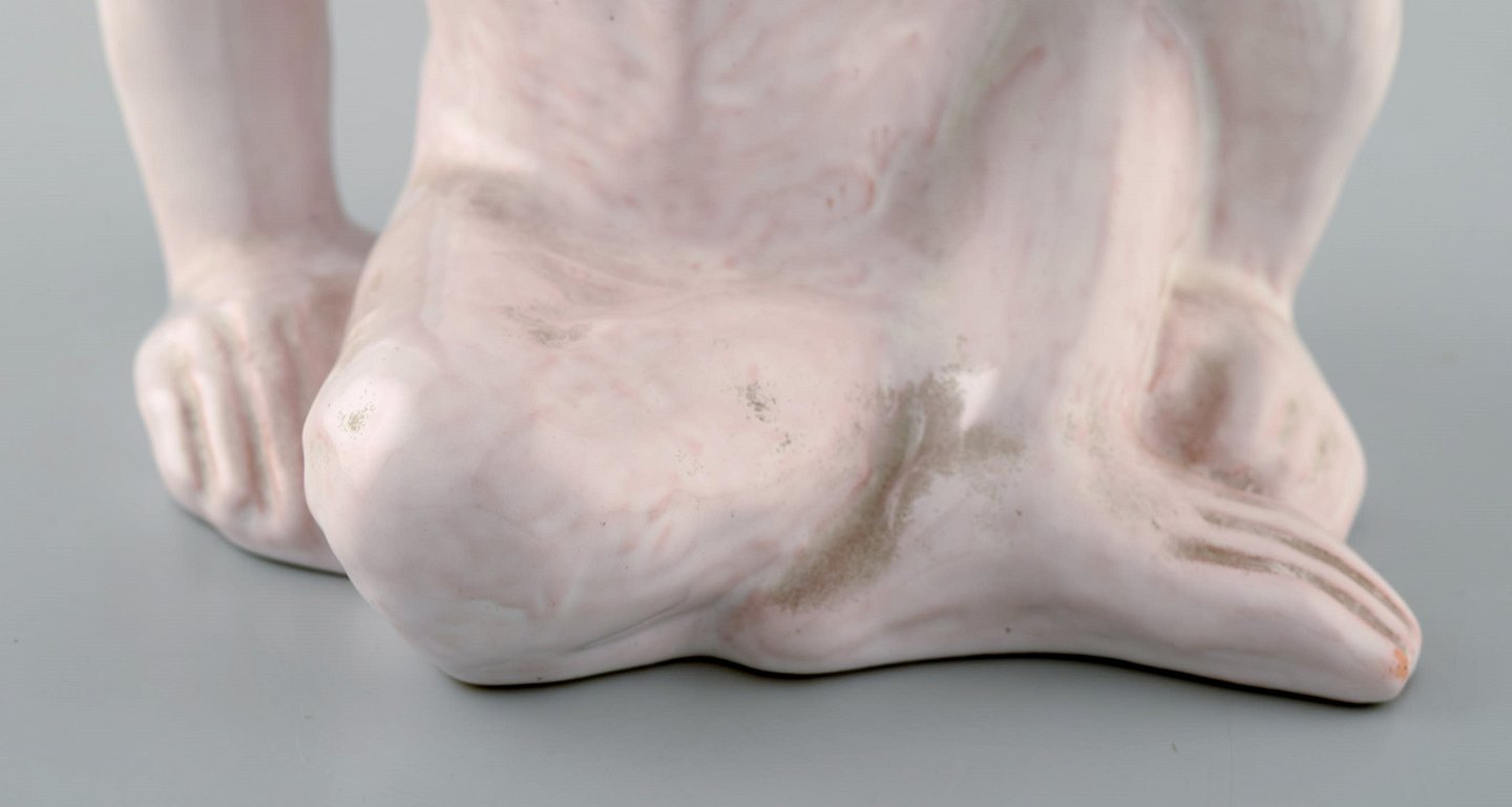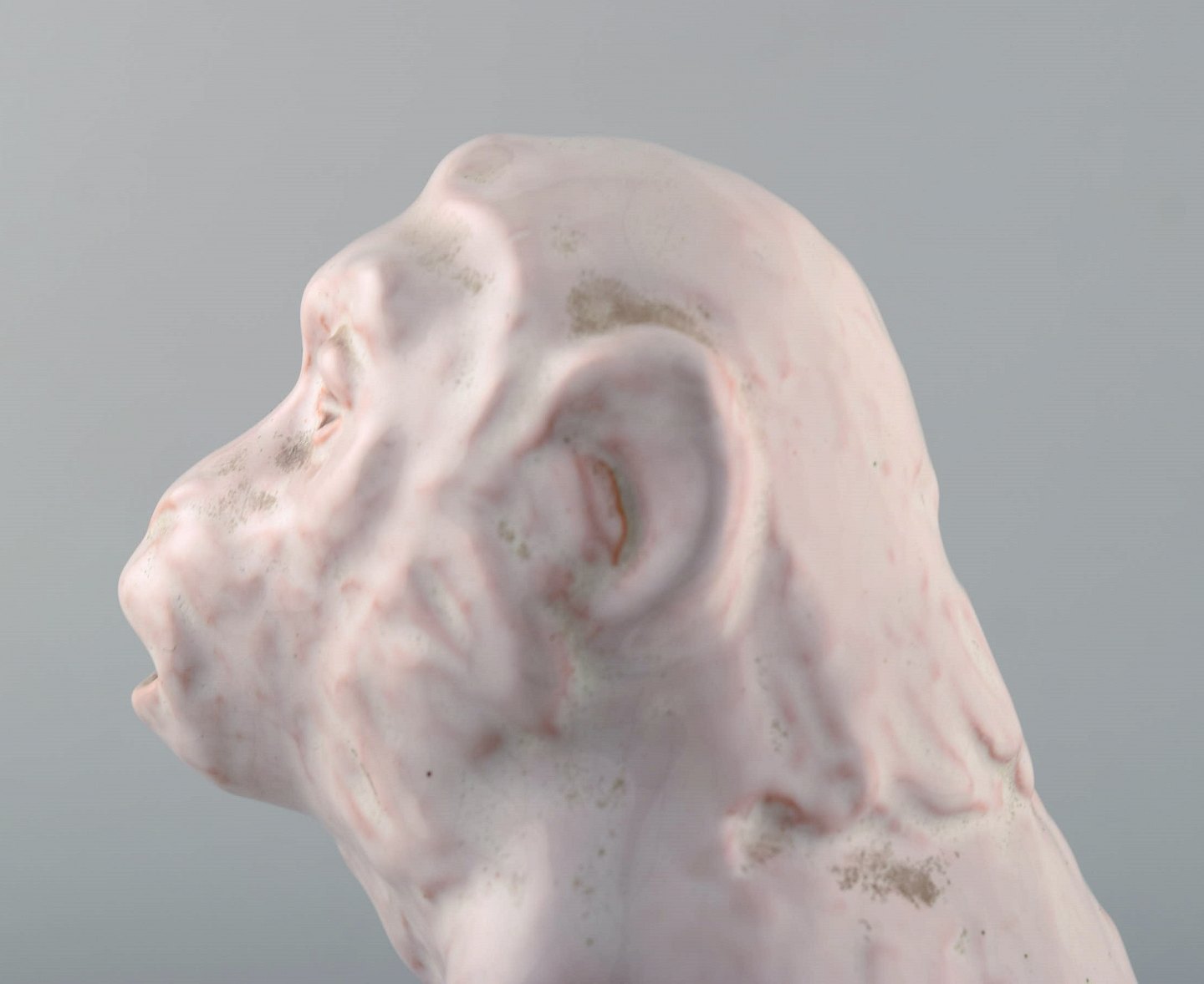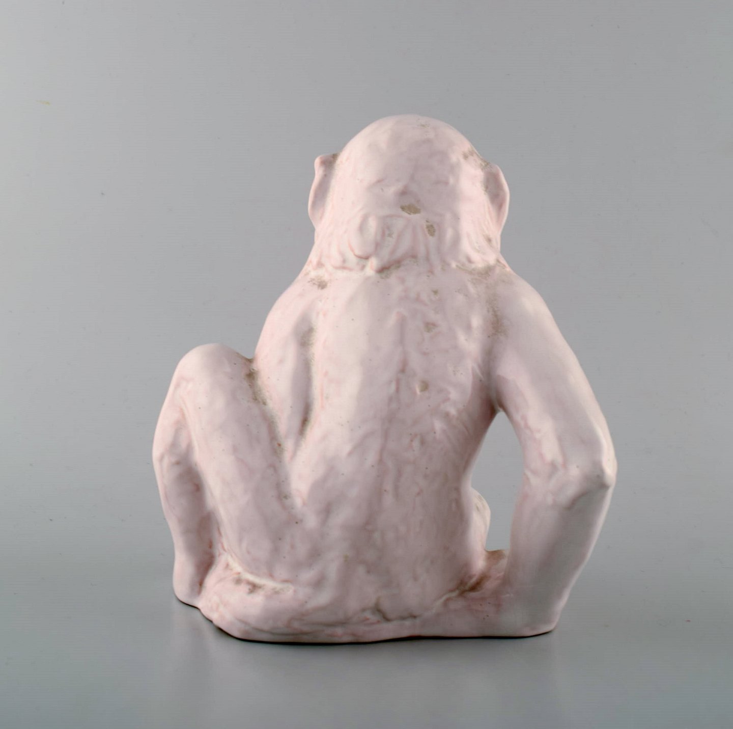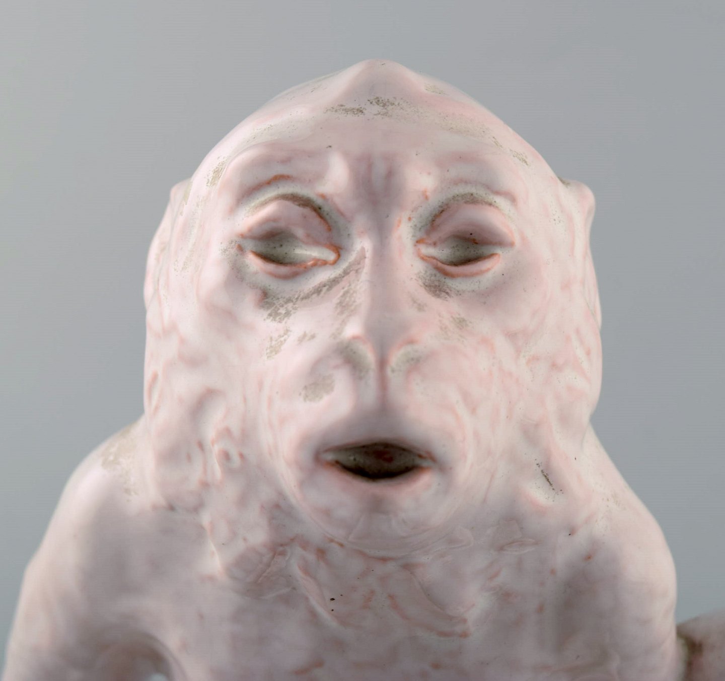 Hjorth (Bornholm) glaseret stentøjsfigur, siddende abe. Ca. 1950erne. Hvidglaseret glasur.