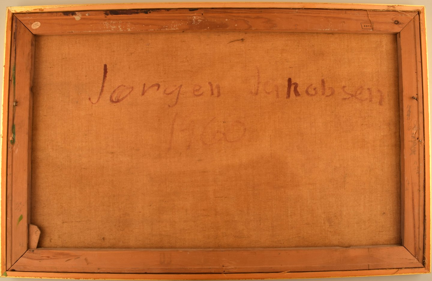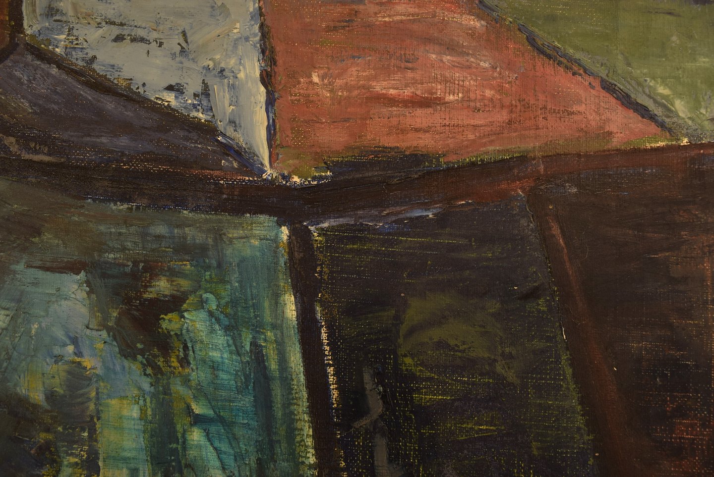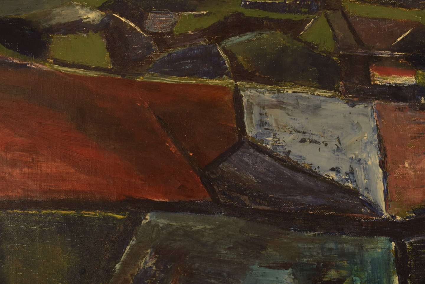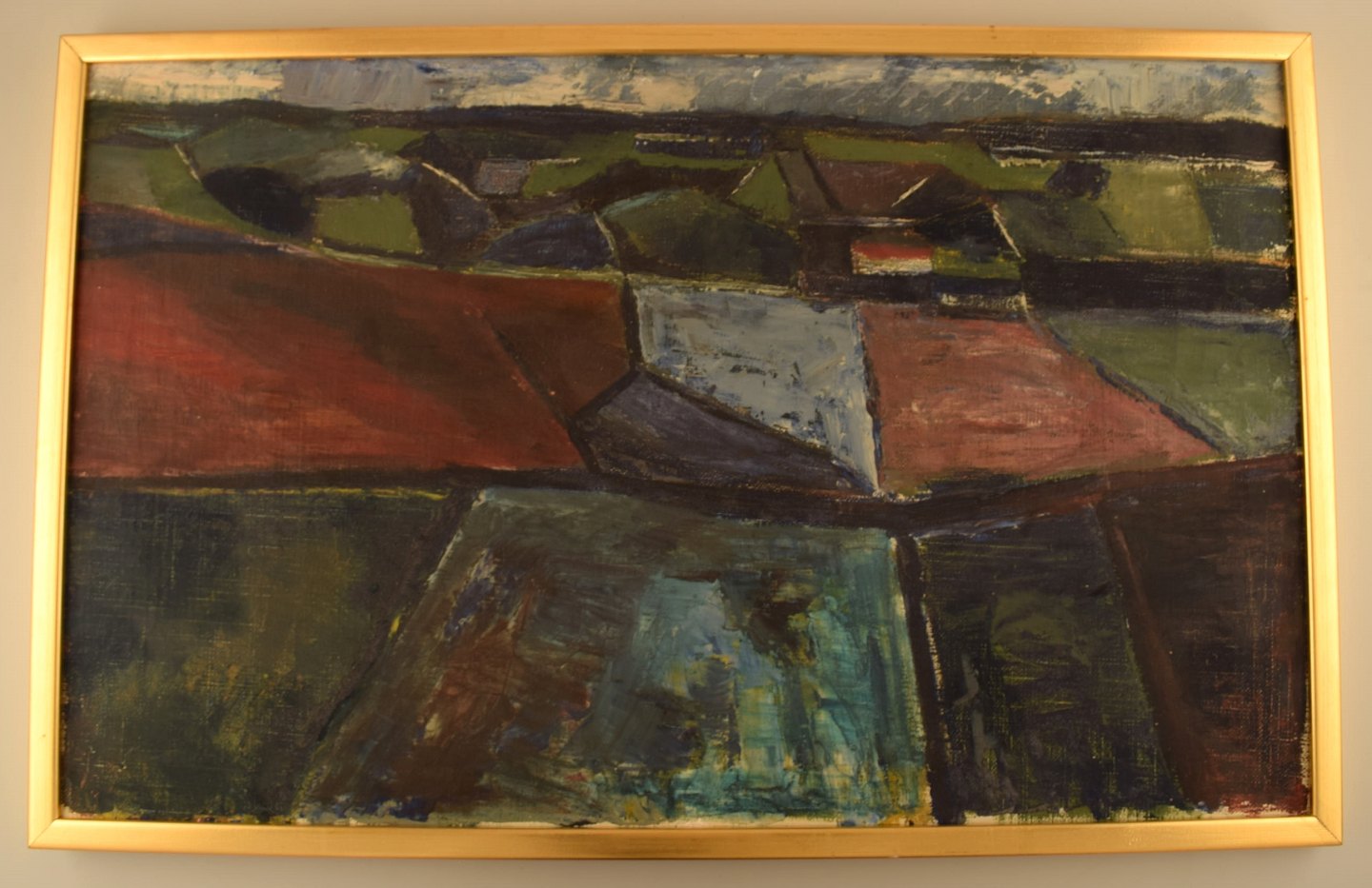 Jørgen Jakobsen. Dansk maler. Modernistisk landskab med marker. Olie på lærred. I flot stand. Signeret og dateret på bagsiden: Jørgen Jakobsen, 1960. Lærredet måler: 79 cm x 49 cm. Rammen måler: 2 cm.