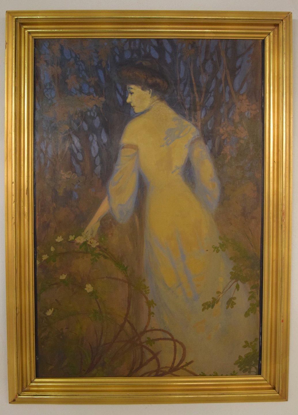 Ung kvinde i hvid kjole i skov. Symbolistisk stil. Høj kvalitet.