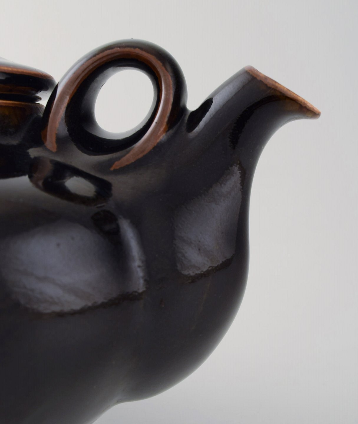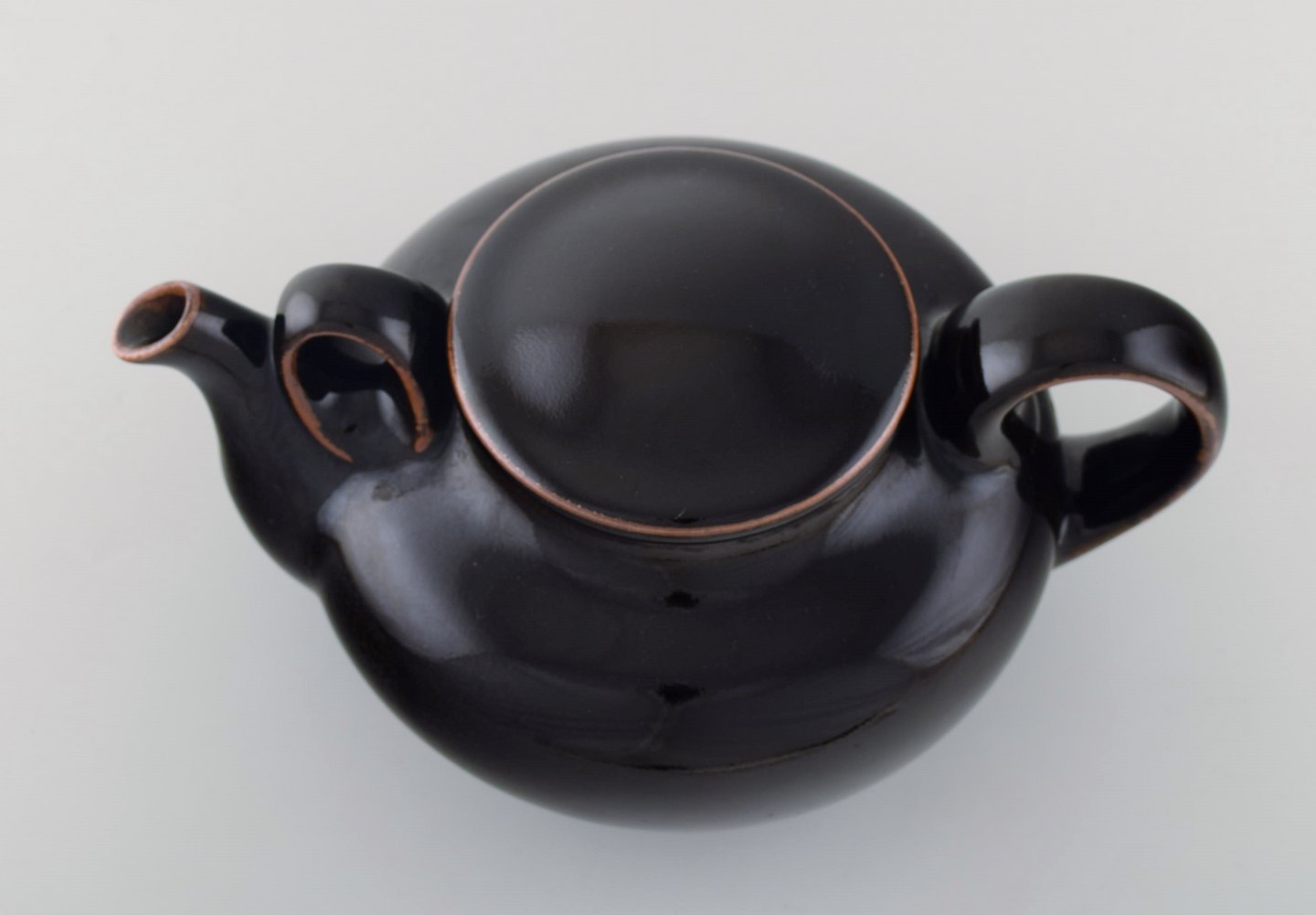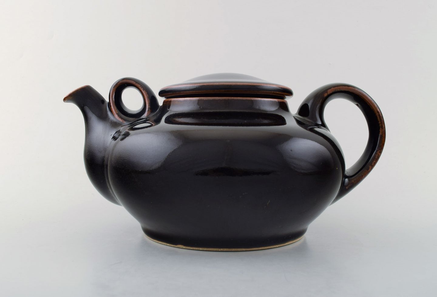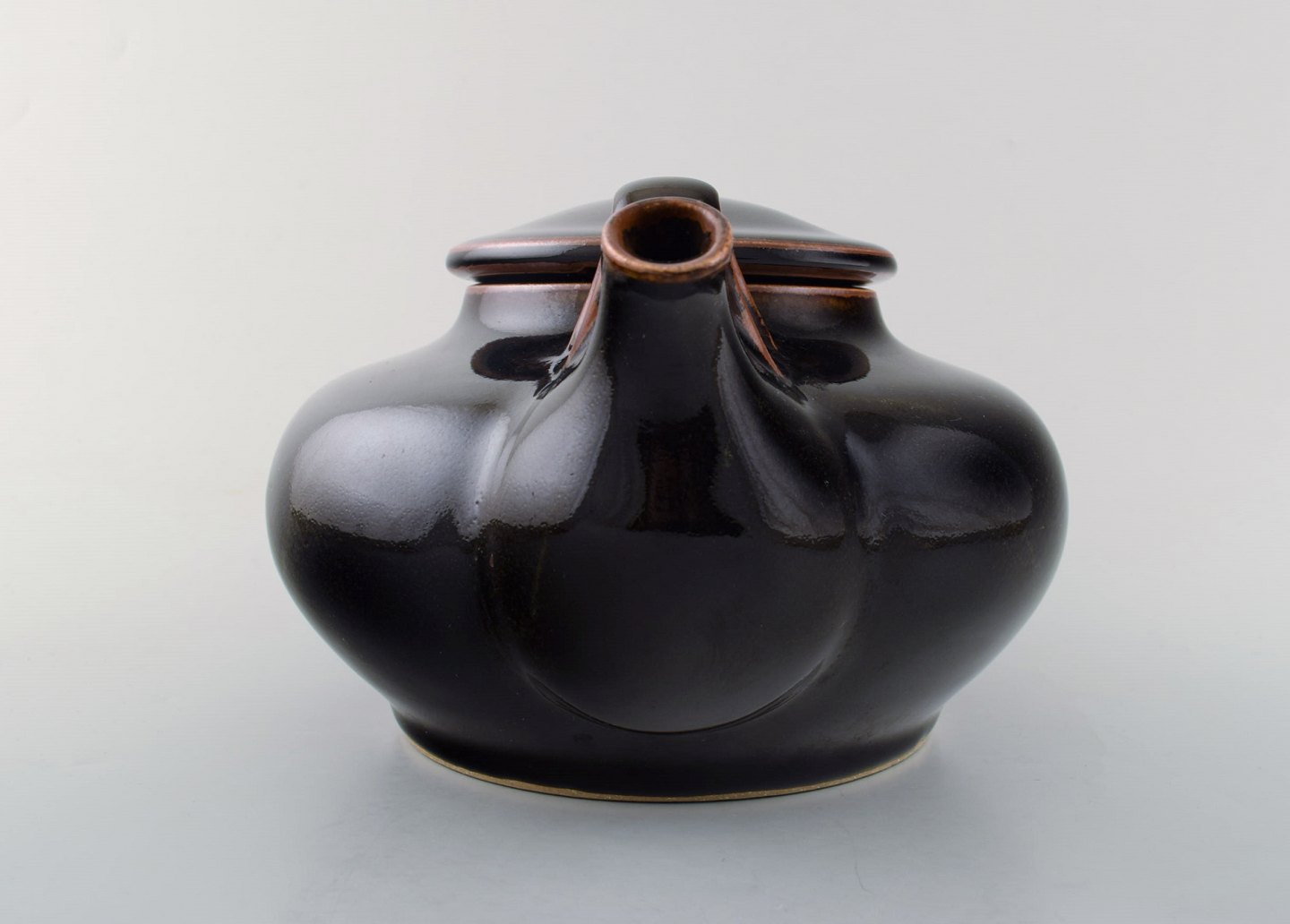 Edith Sonne Bruun for Bing & Grøndahl / B&G. Stor thekande i stentøj, dekoreret i brune nuancer. 1960'erne. I flot stand. måler: 29 x 20 x 14 cm. Stemplet. 2. Sortering.
