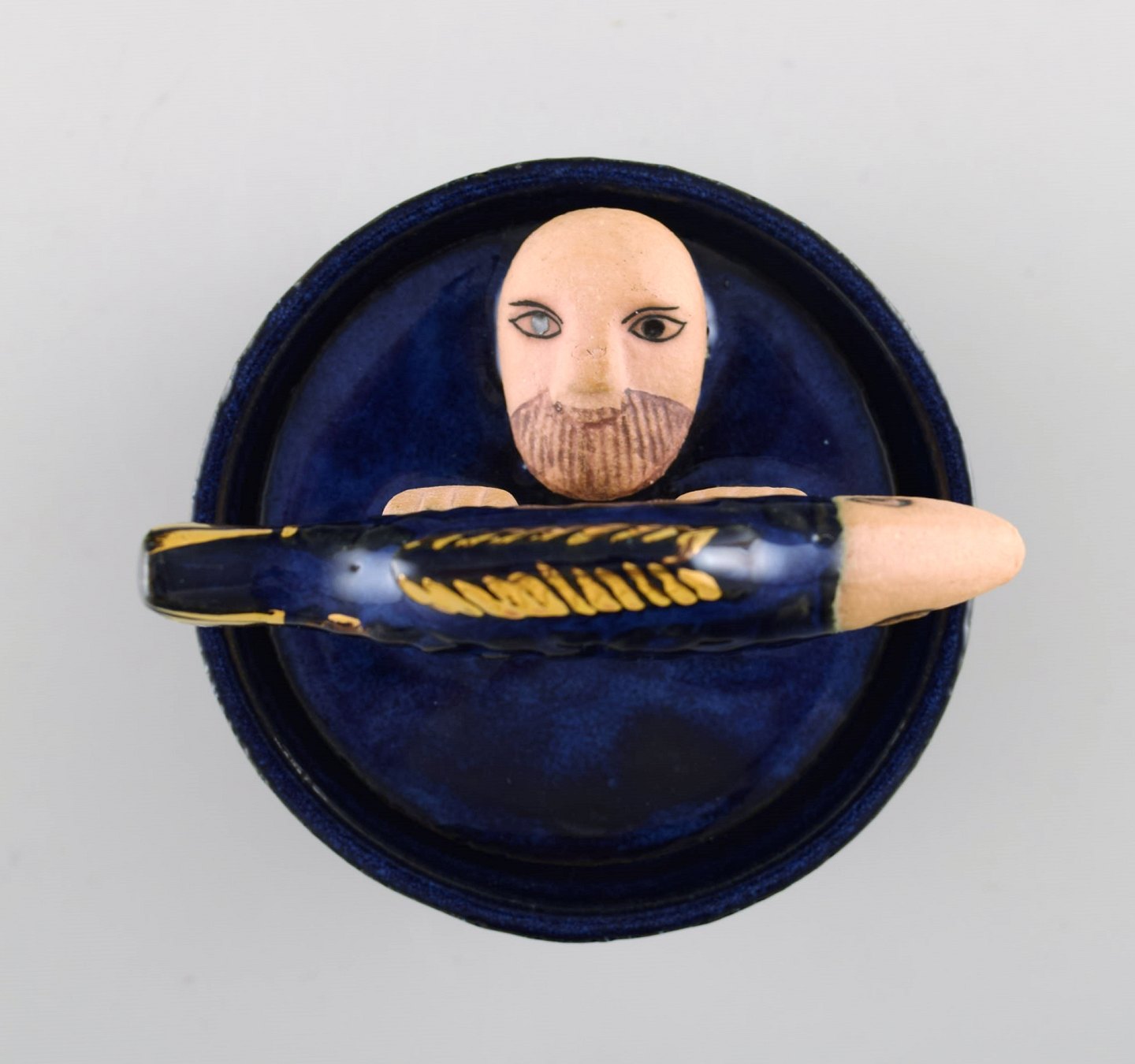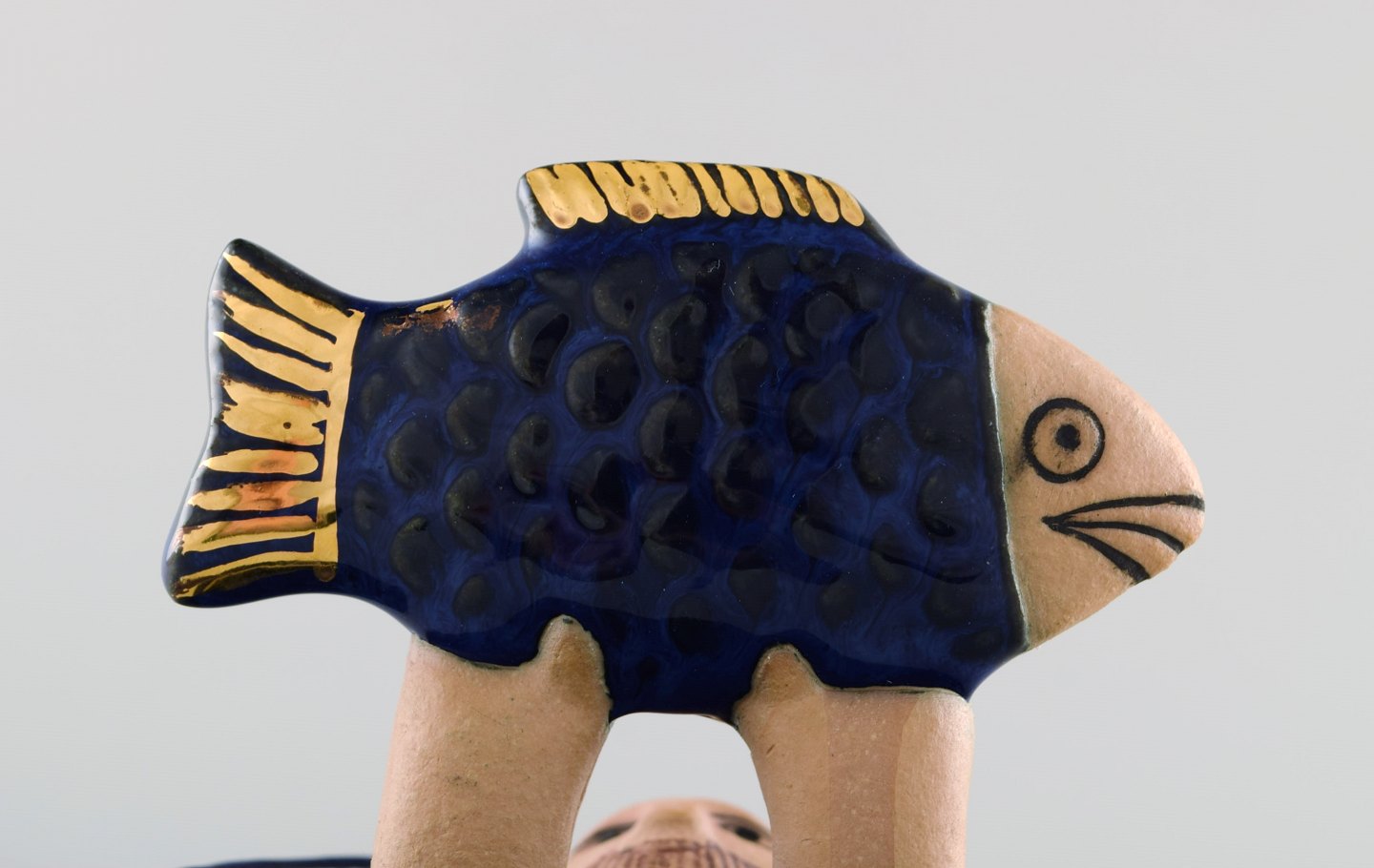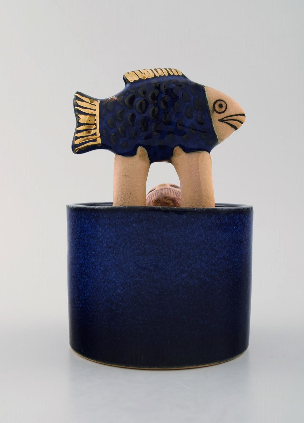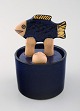 Lisa Larson for K-Studio/Gustavsberg. Lågkrukke i dyb blå glasur med mand og fisk. Signeret. Måler: 14,5 x 10 cm. I perfekt stand.