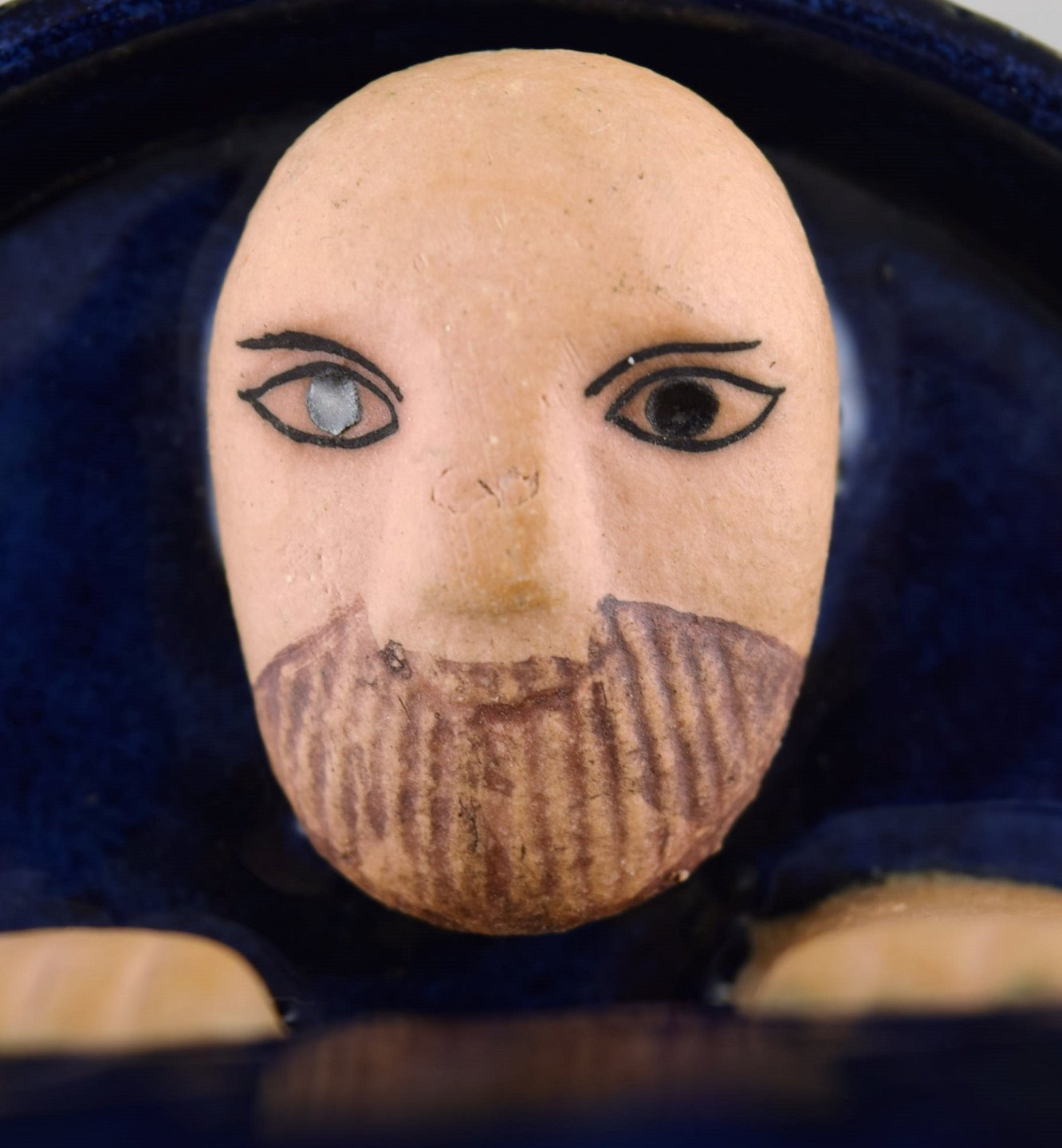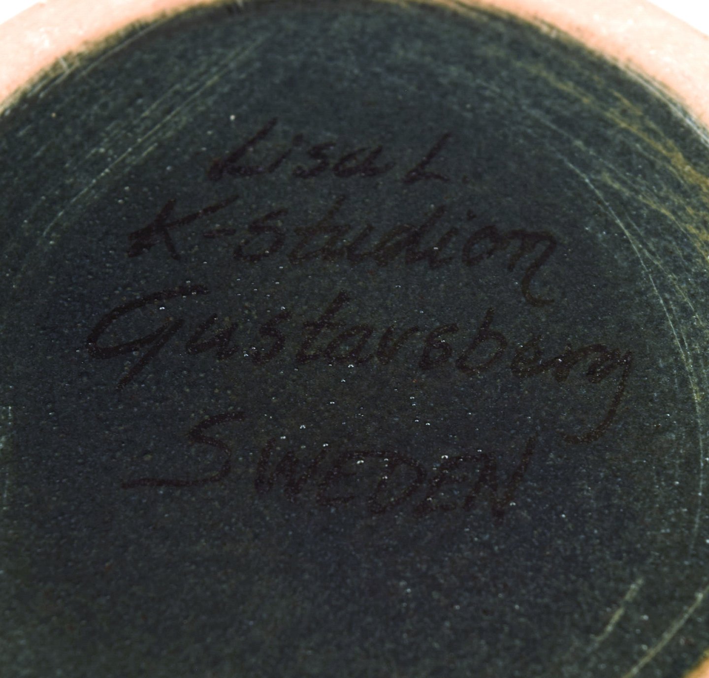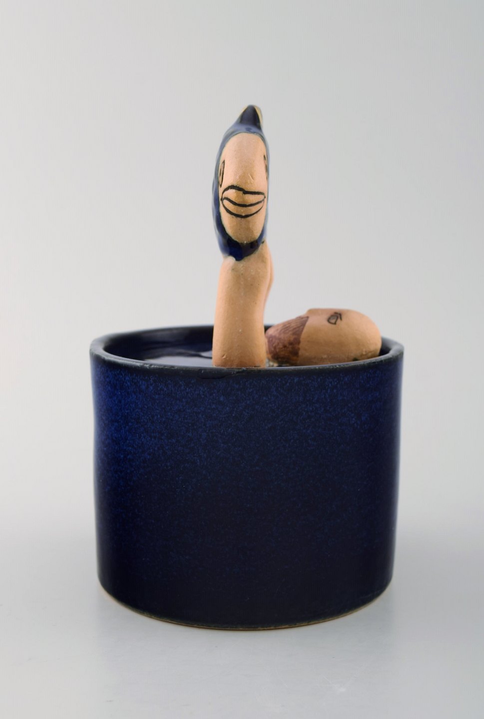 Lisa Larson for K-Studio/Gustavsberg. Lågkrukke i dyb blå glasur med mand og fisk. Signeret. Måler: 14,5 x 10 cm. I perfekt stand.