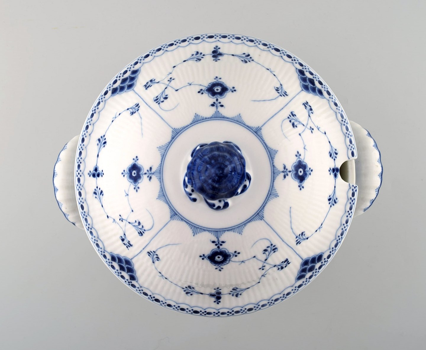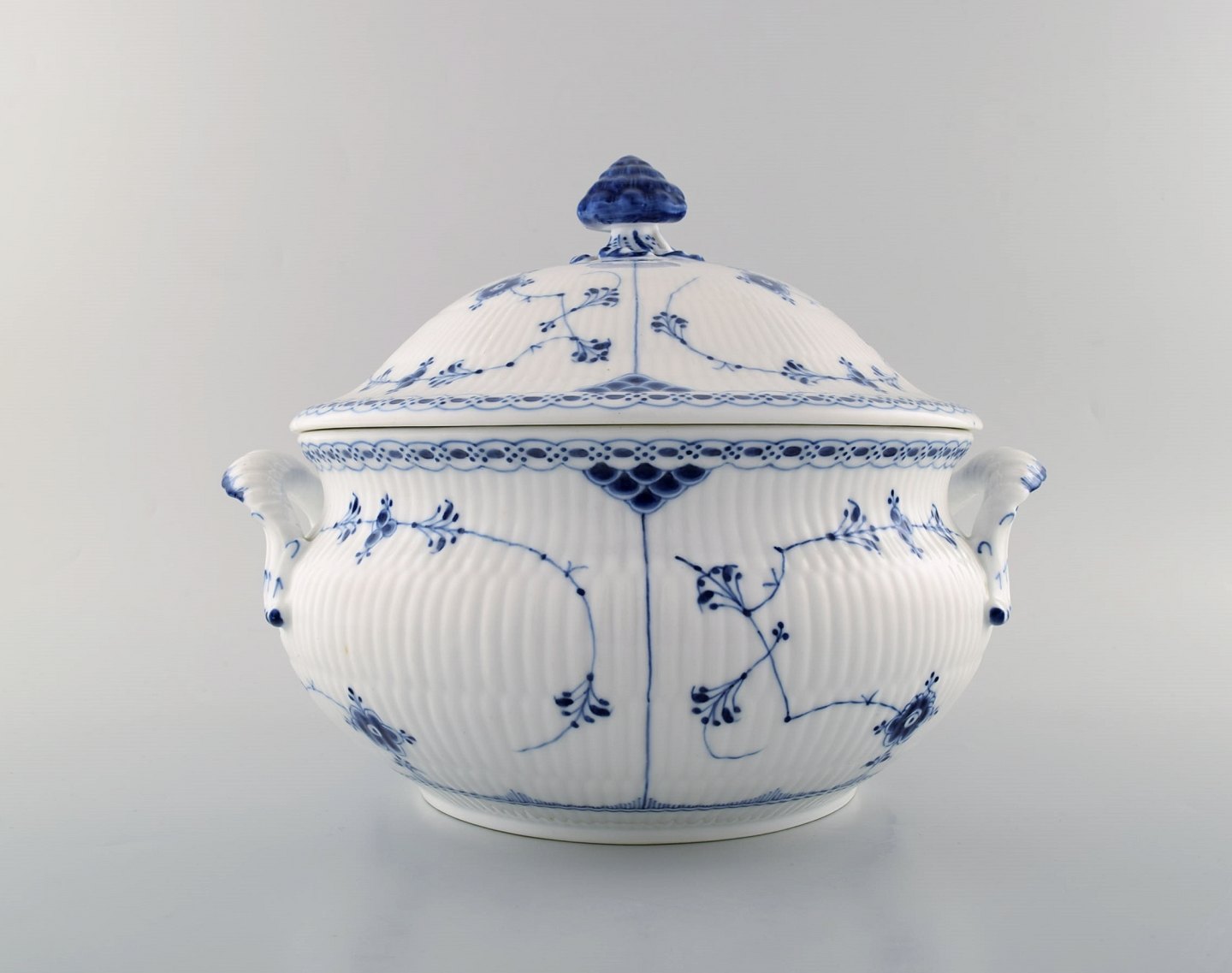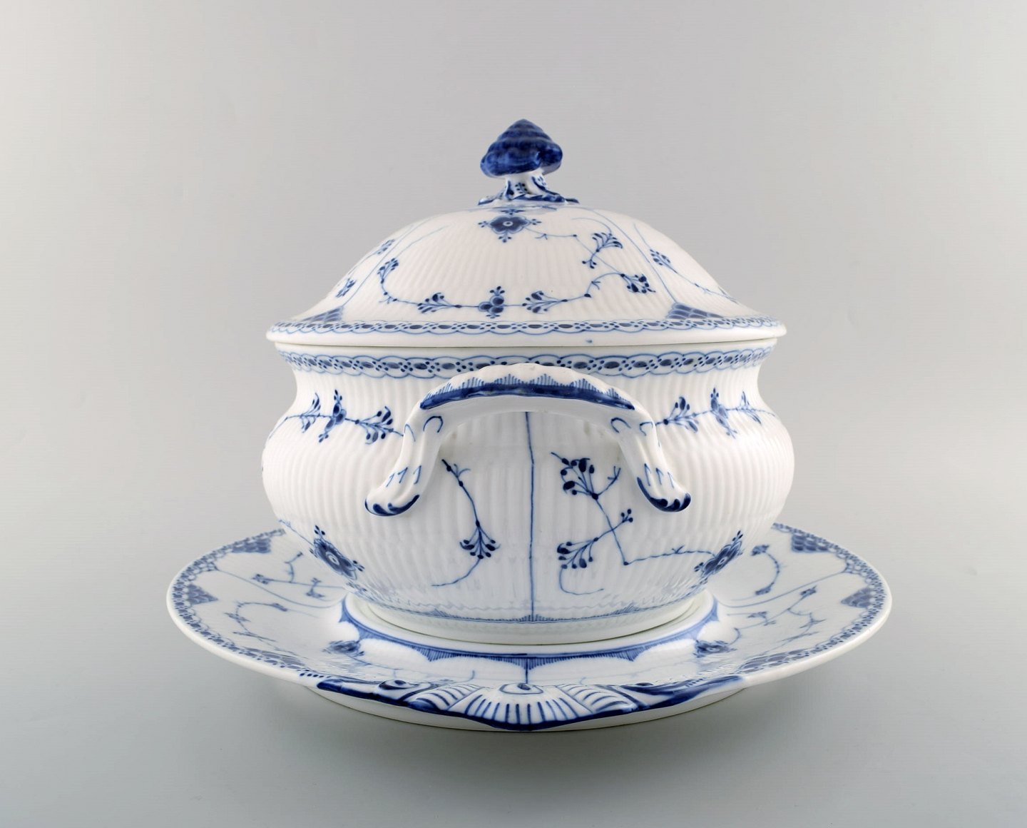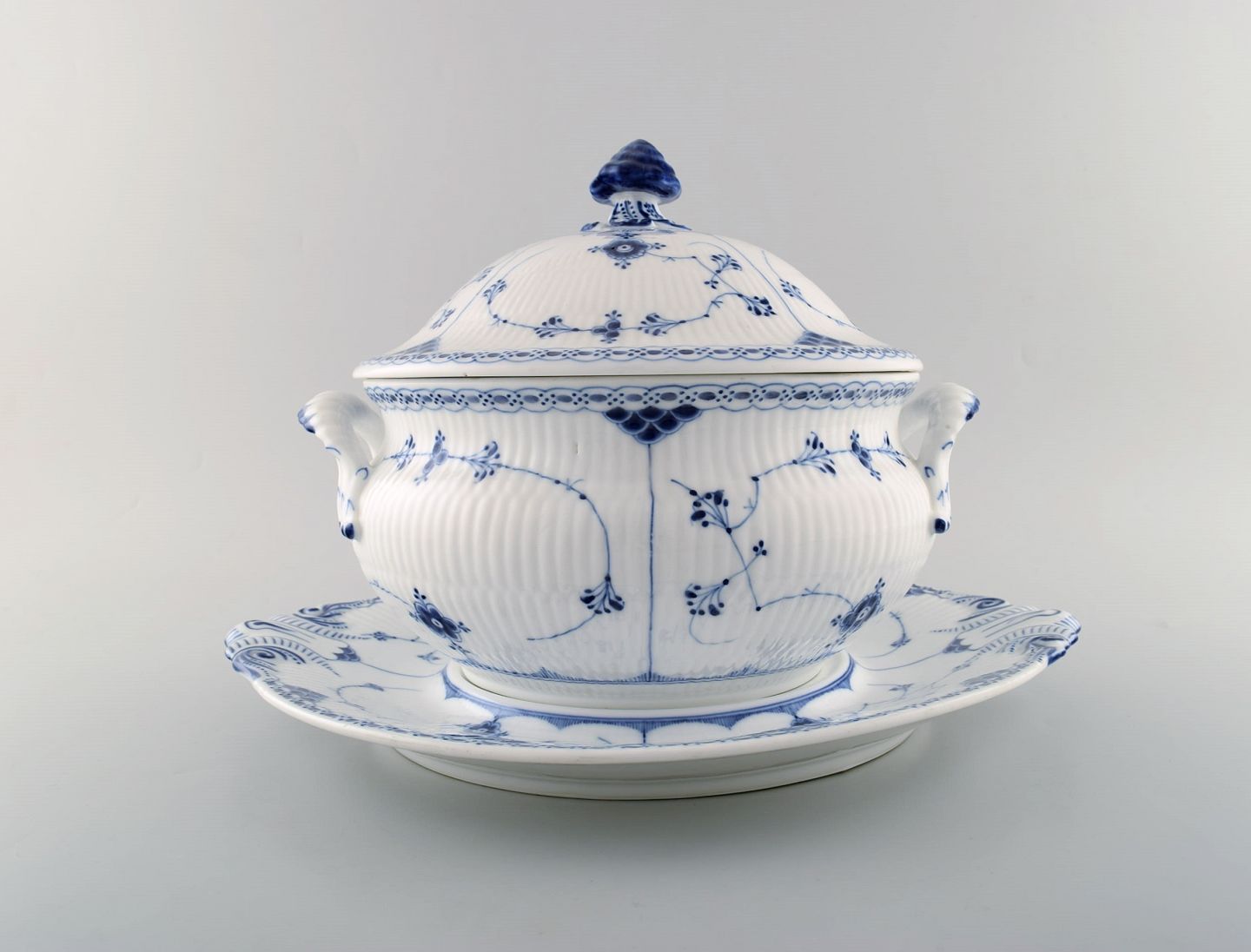 Royal Copenhagen Musselmalet Halvblonde stor lågterrin # 1/602 med underfad. Stemplet ca. 1900. Terrin måler: 30 x 25 cm. Underfad måler: 39 x 34 cm. 1. sortering. I flot stand.