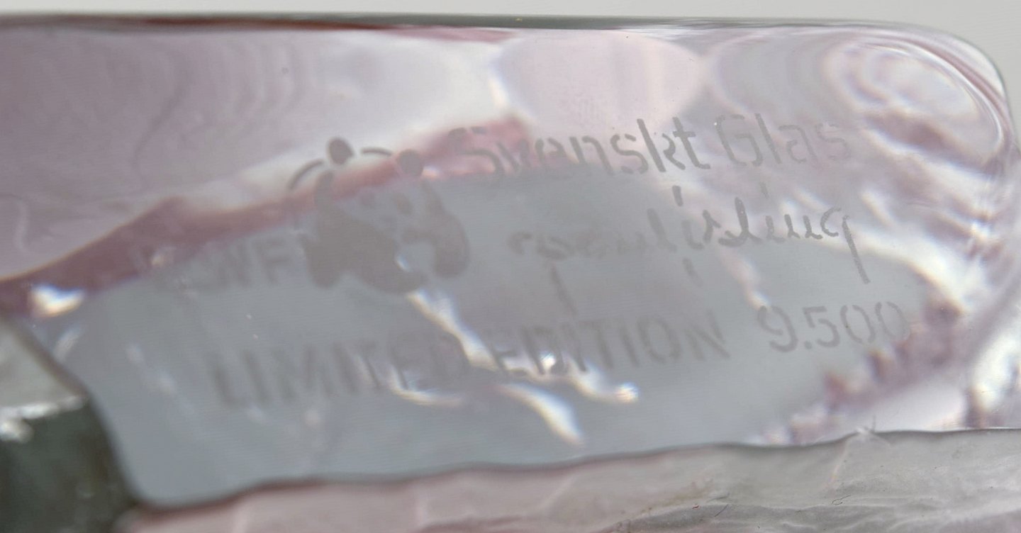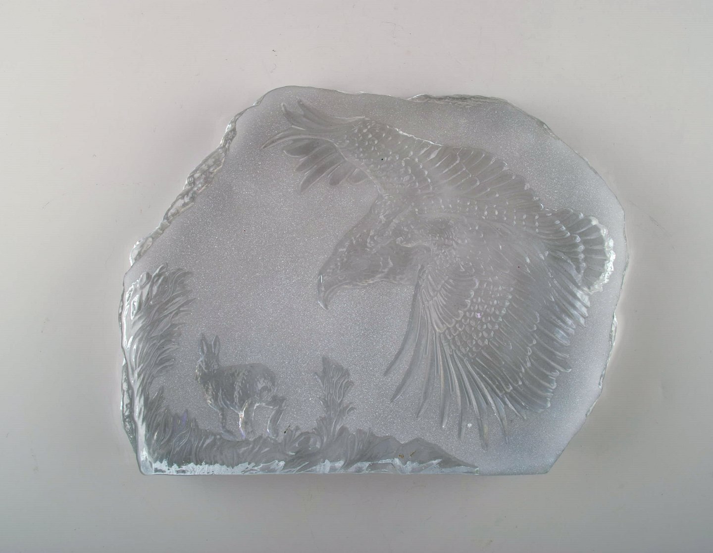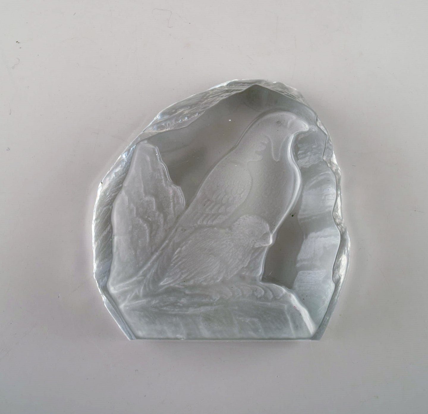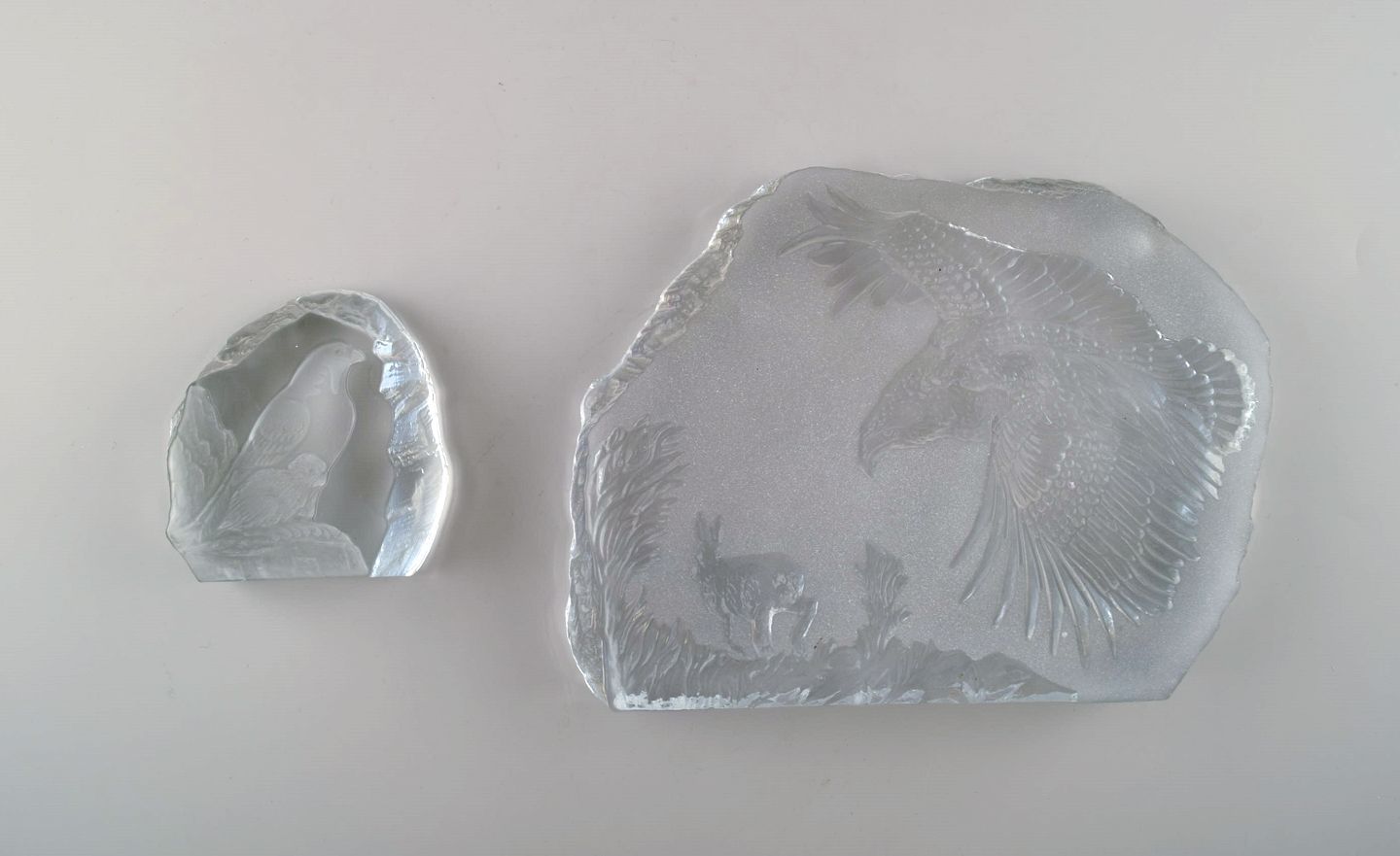 Paul Hoff for Svenskt glas m. fl. 2 glasblokke med motiver af rovfugle udført i kunstglas. WWF. World wildlife foundation. Største måler: 23,5 cm x 17 cm. I perfekt stand. Stemplet.
