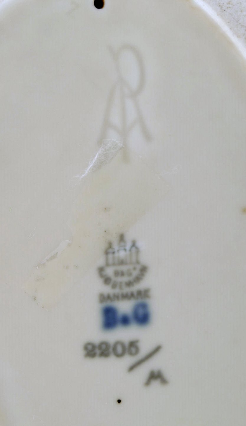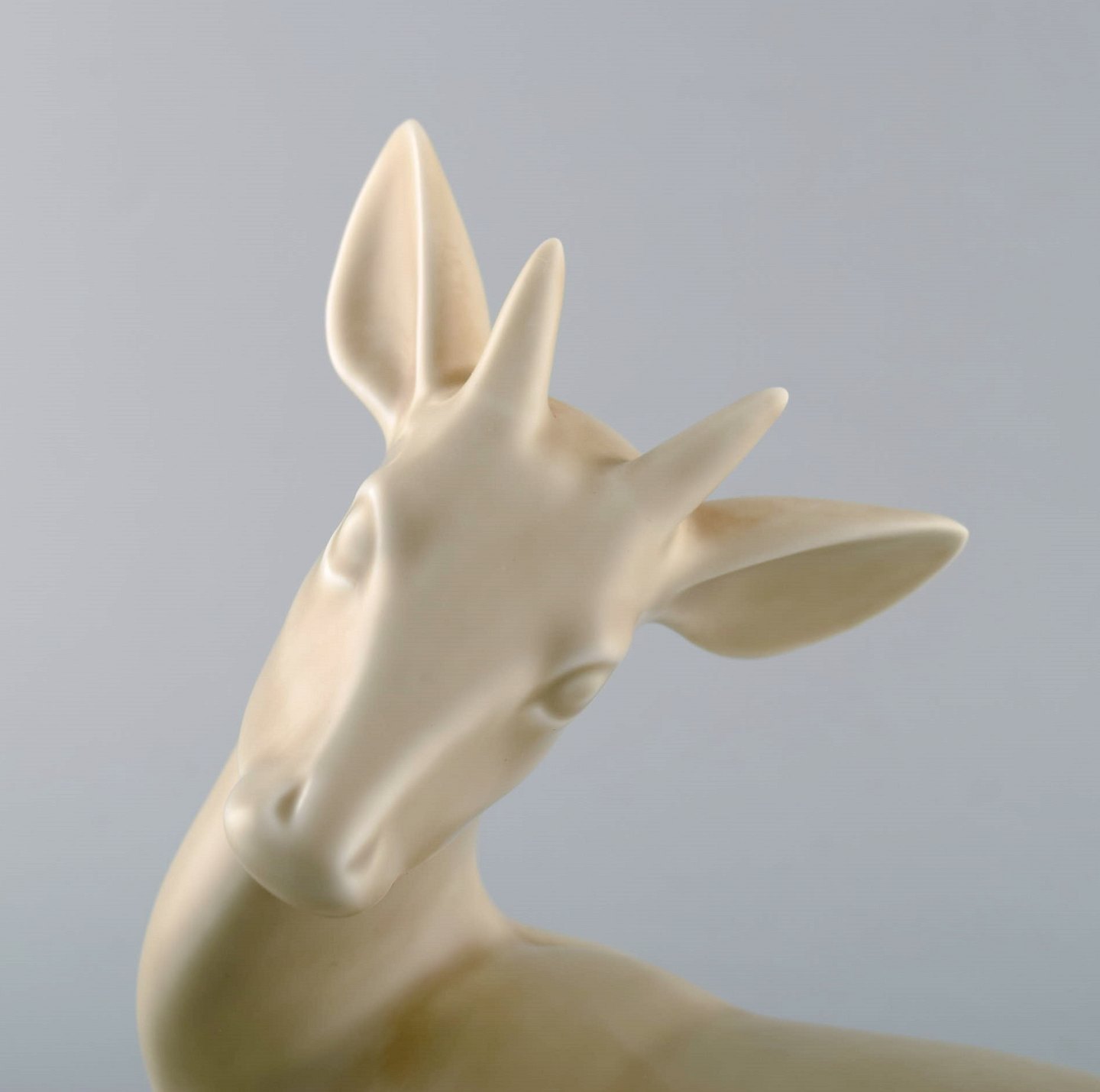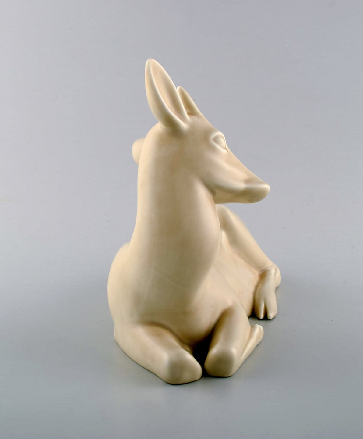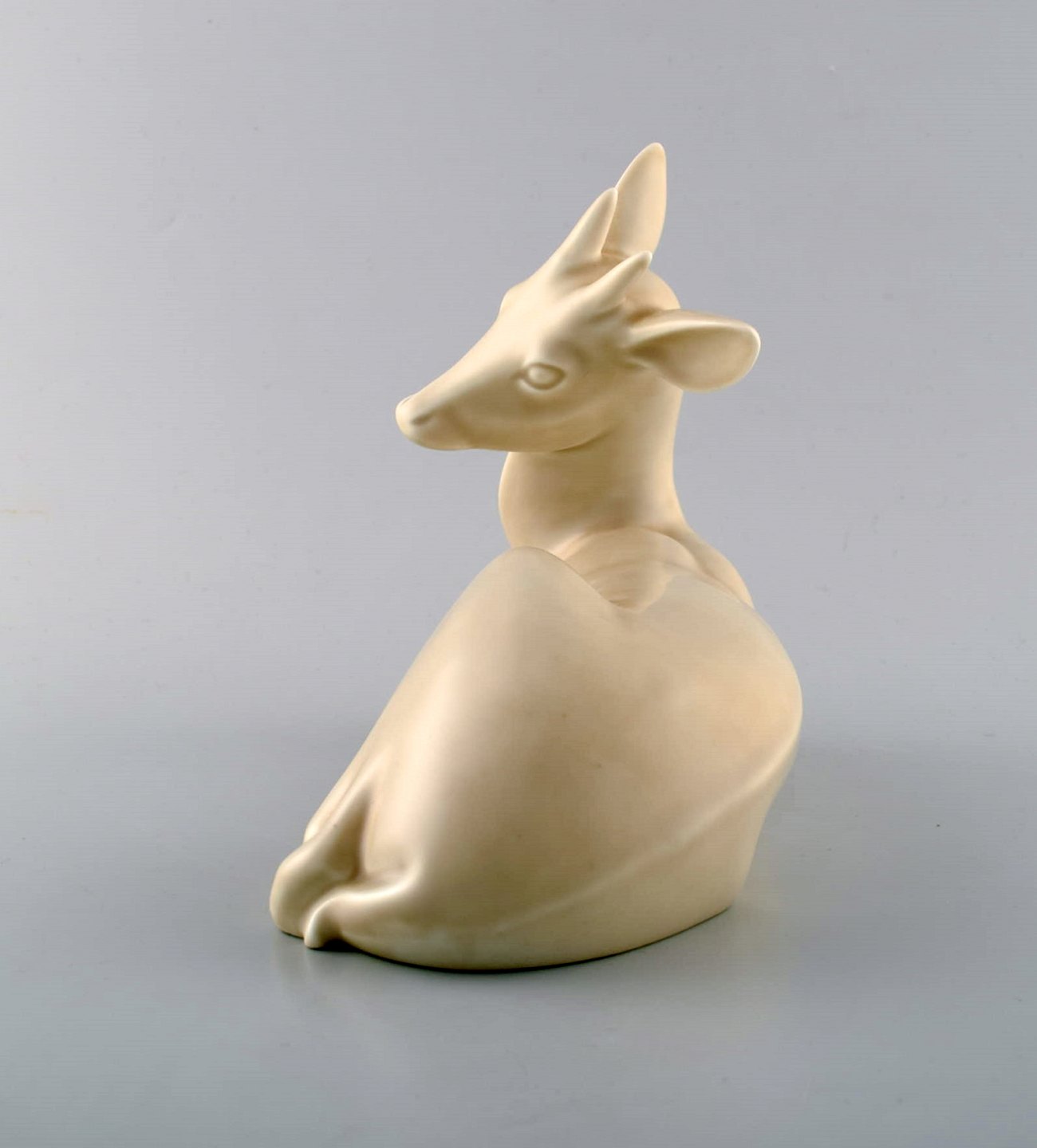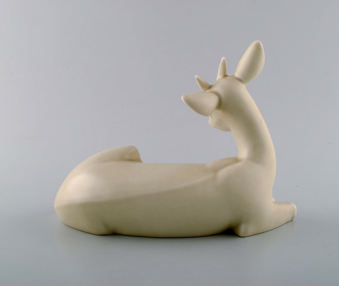 Armand Petersen for B&G (Bing & Grøndahl). Sjælden art deco porcelænsfigur i form af liggende hjort. 1930'erne. Modelnummer 2205. I flot stand. 2. Sortering. Stemplet. Måler: 24 x 17 cm.