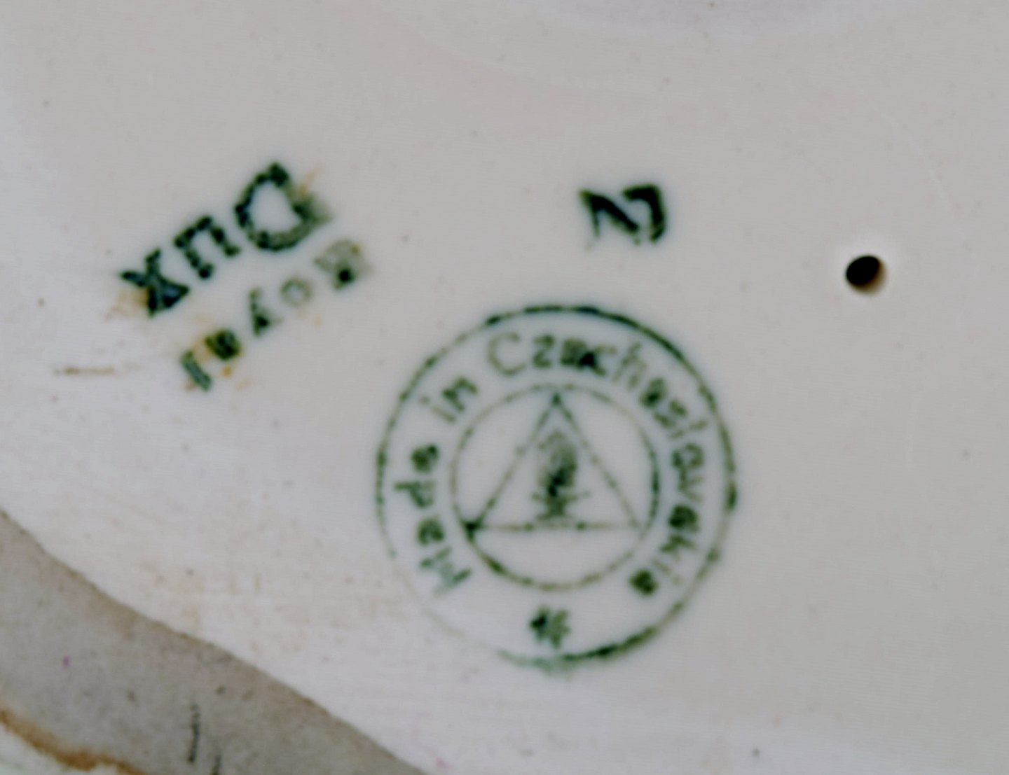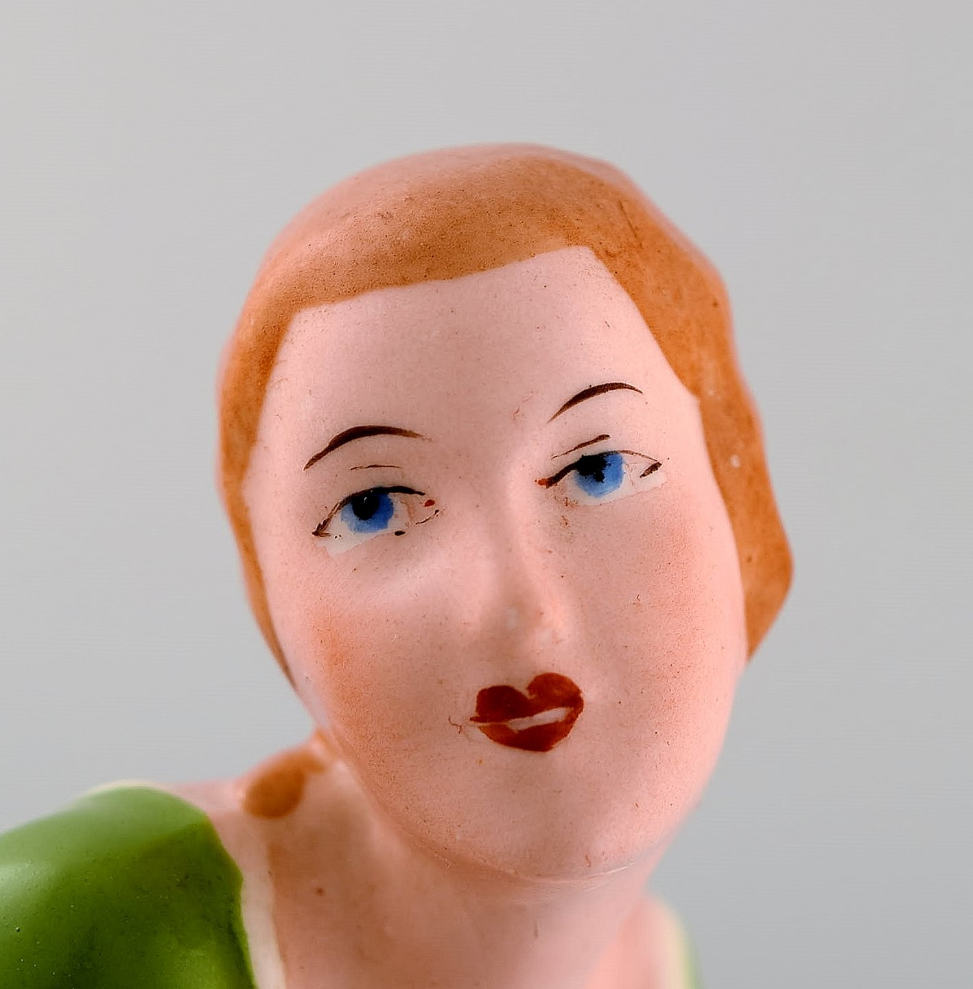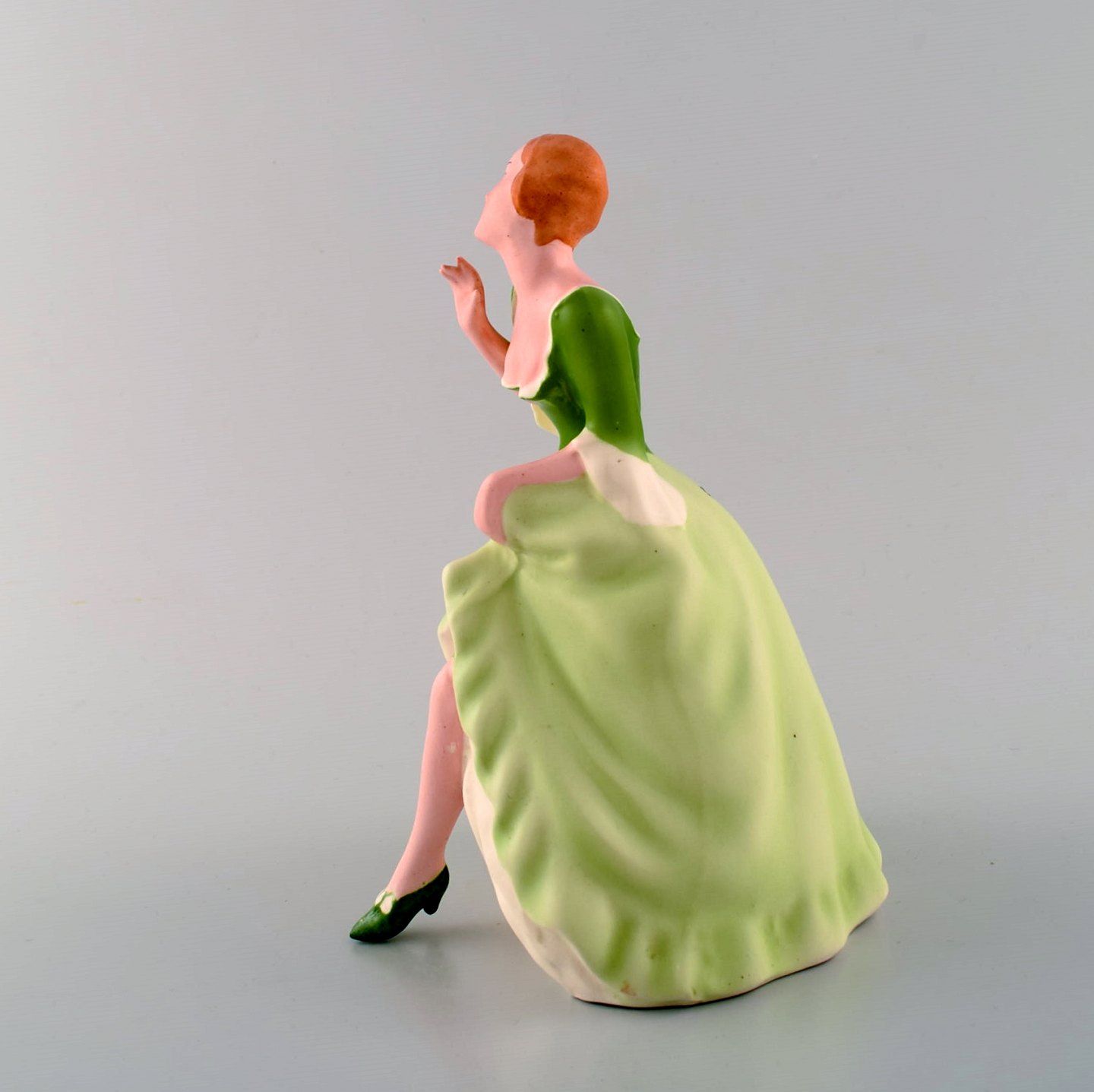 Art deco Royal Dux håndmalet porcelænsfigur. Kvinde i lysegrøn kjole med strutskørt. Tjekkiet, 1940'erne. Måler 19,5 x 15 cm. Stemplet. I perfekt stand.
