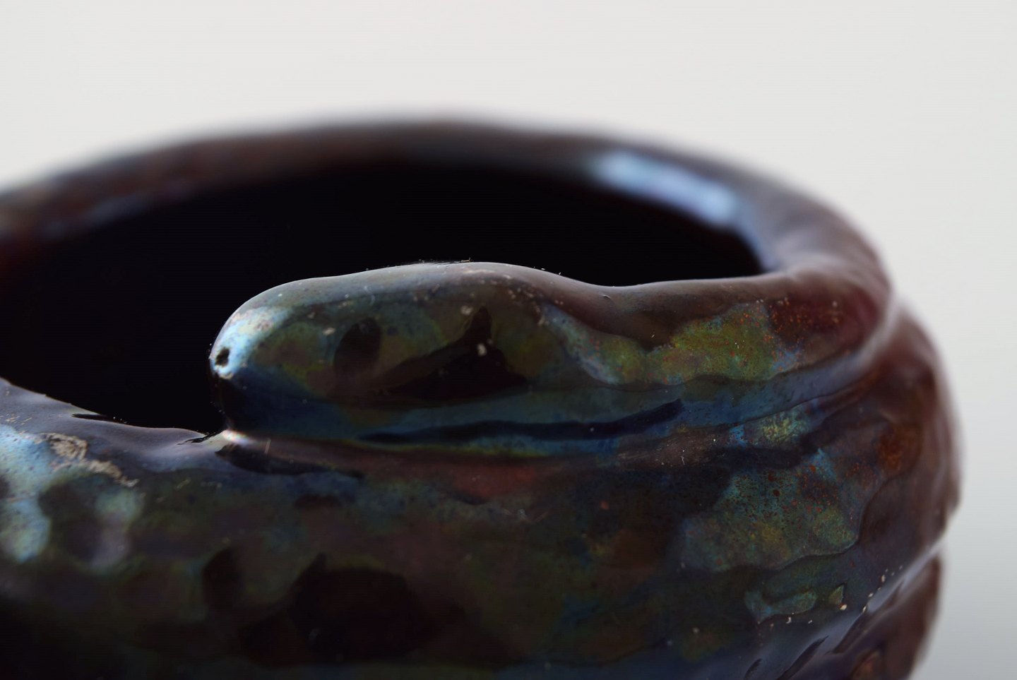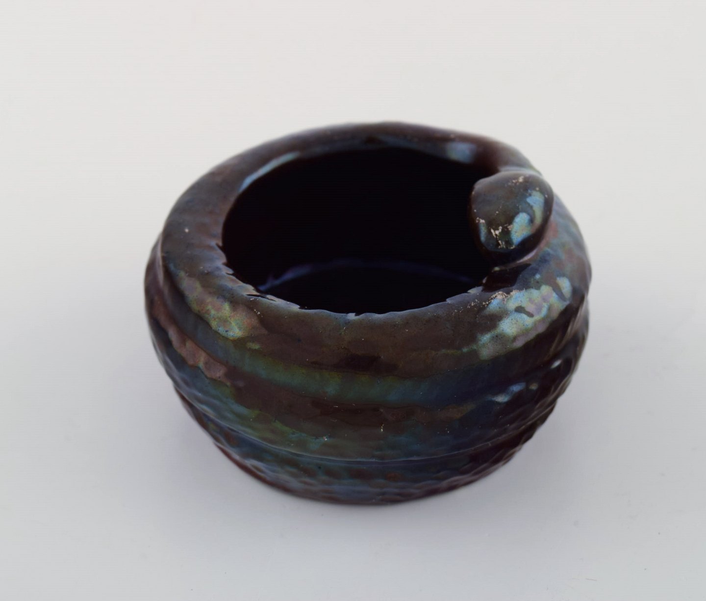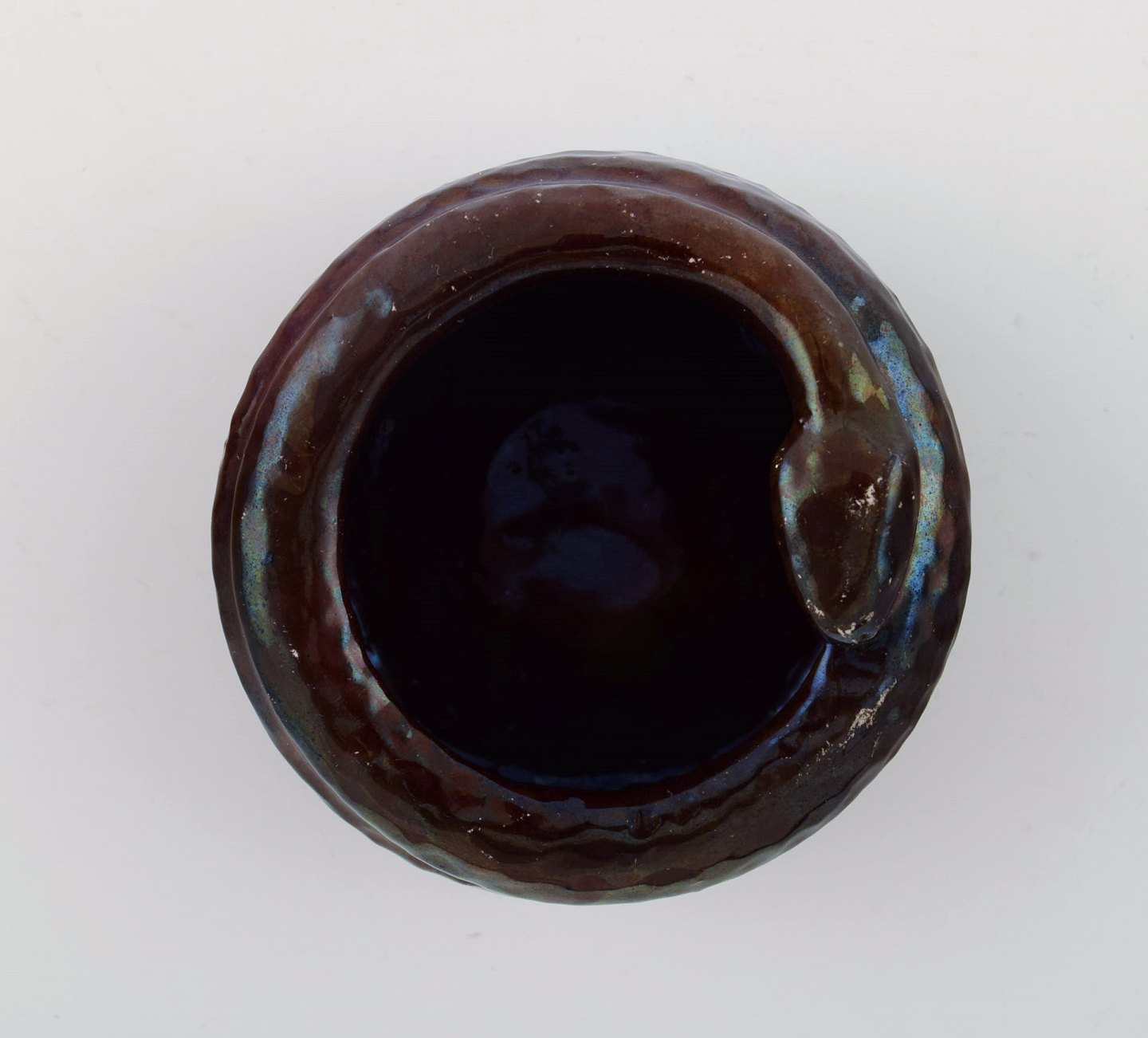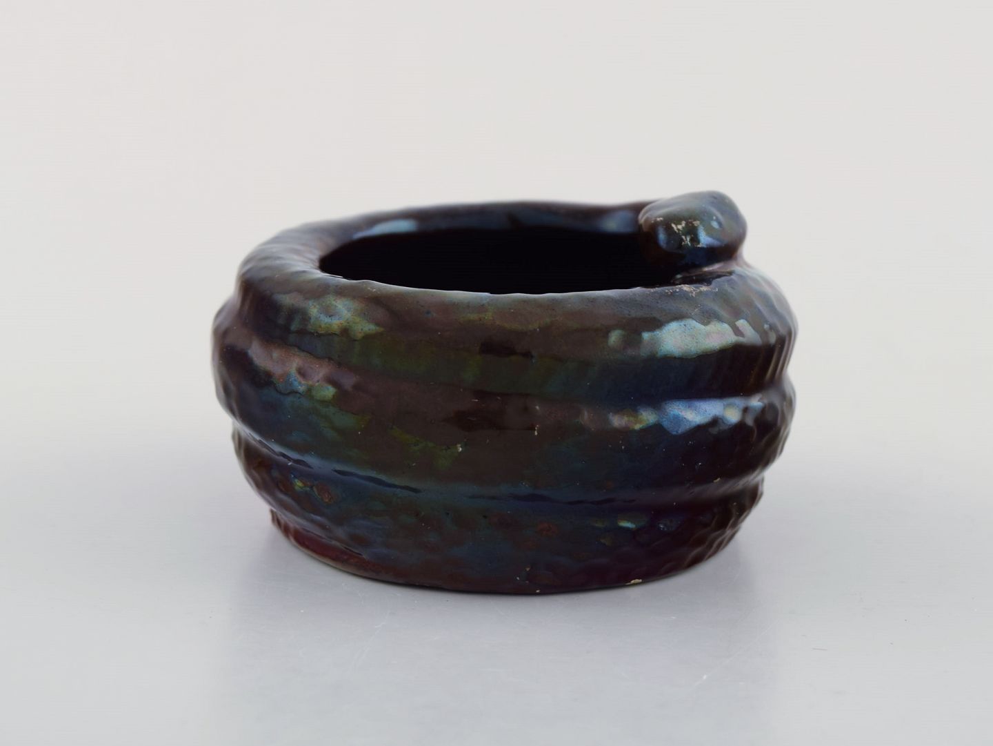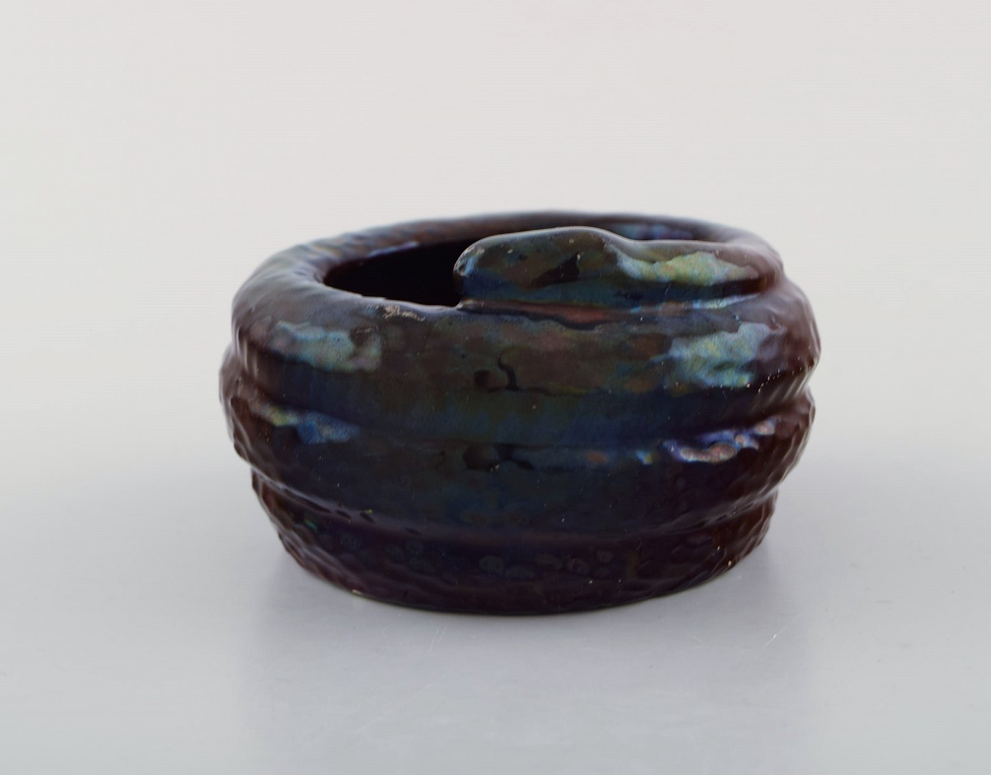 Karl Hansen Reistrup for Kähler. Sjælden slange skål i smuk lustre glasur. 1890'erne. Måler: 9 x 5 cm. I flot stand. Utydeligt stemplet.