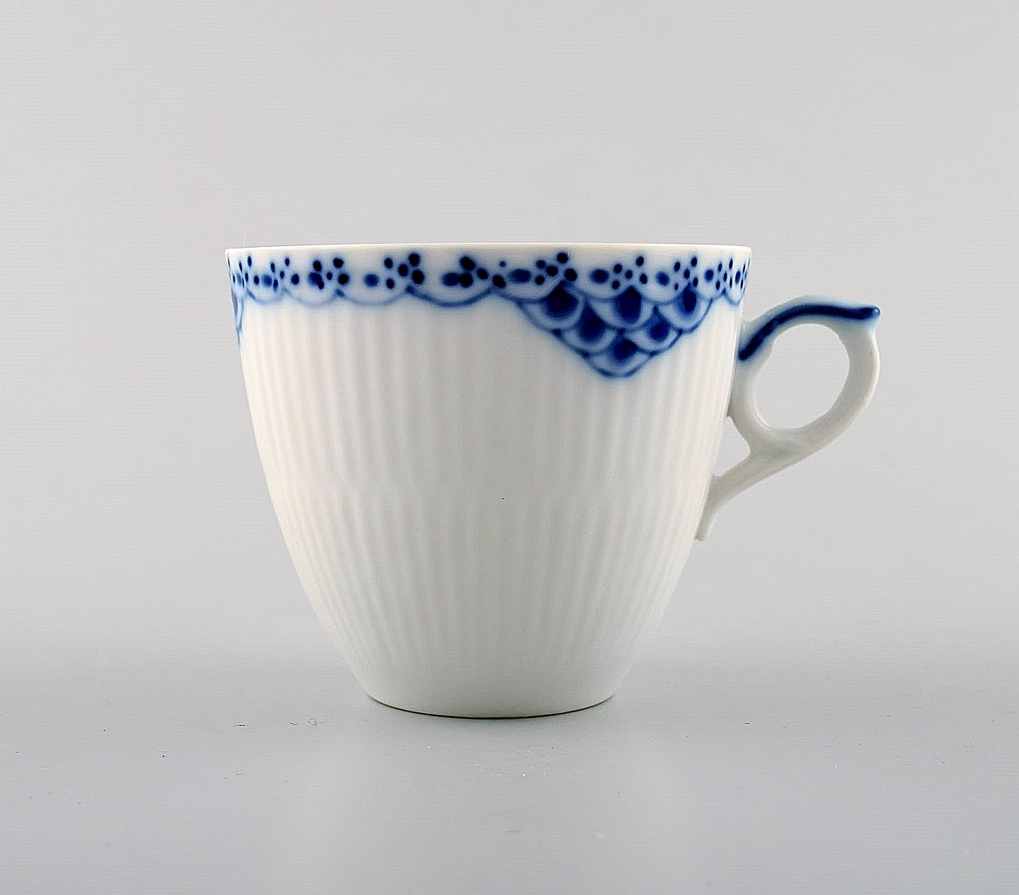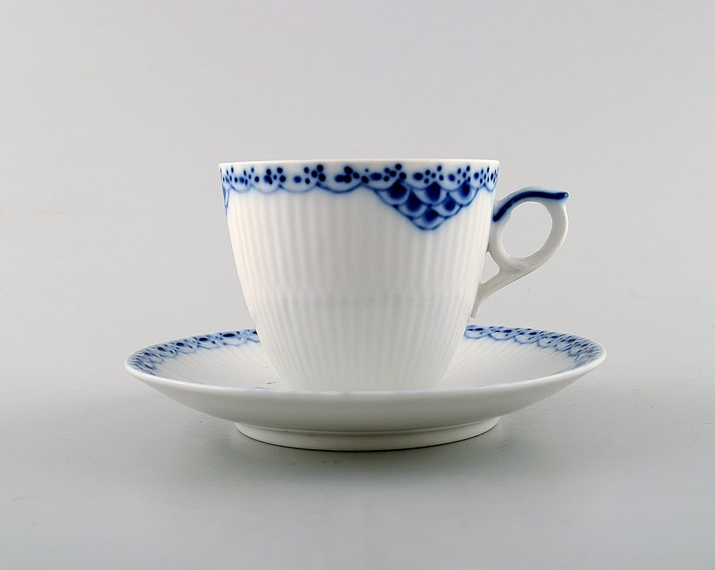 Royal Copenhagen blåmalet Prinsesse kaffekop med underkop i porcelæn. Sæt på 6 stk. Modelnummer 719. 2. sortering. I perfekt stand. Koppen måler: 7 x 6,5 cm. Underkoppen: 12,5 cm.