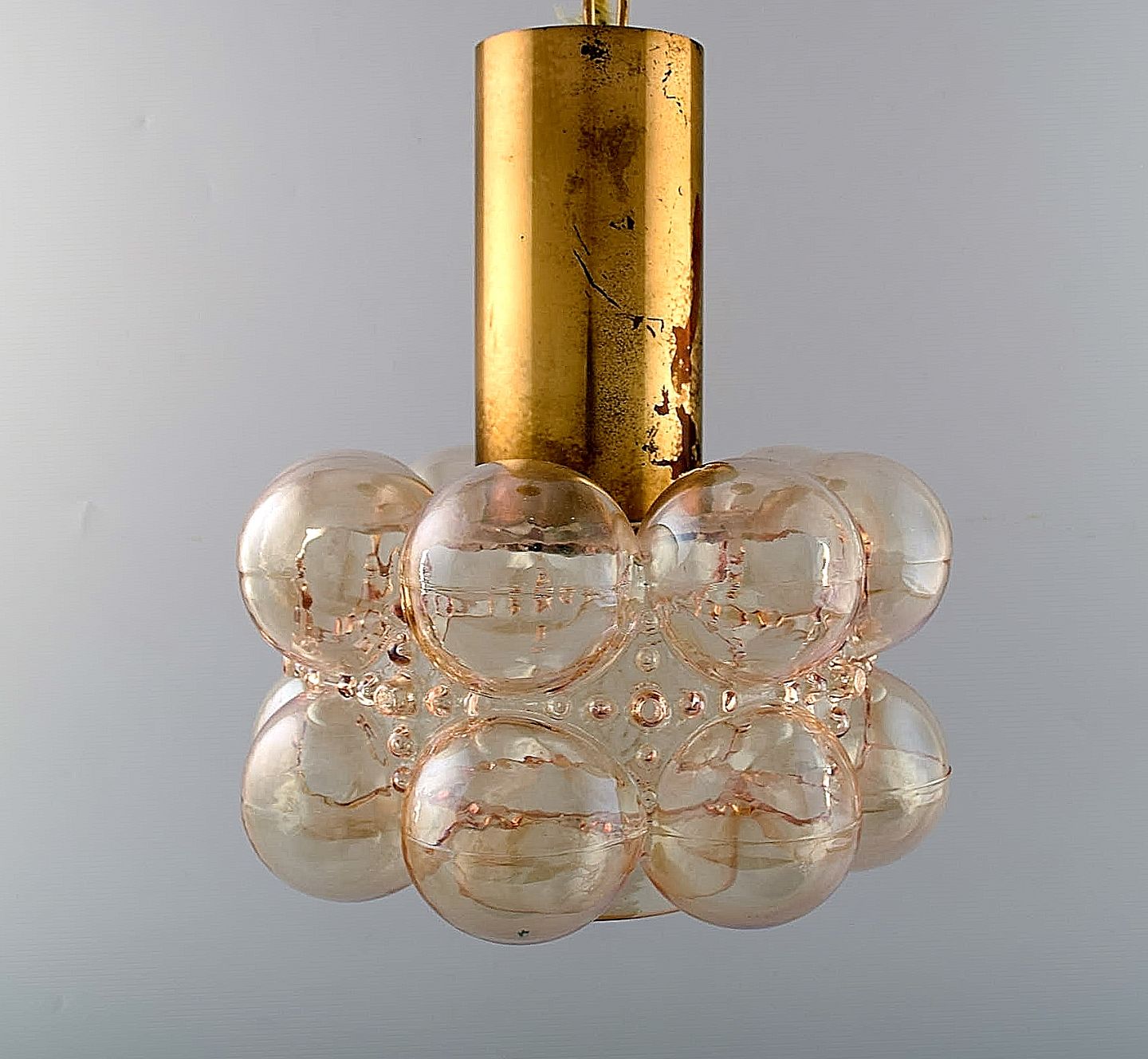 Helena Tynell (f. 1918, d. 2016) for Limburg. Loftpendel, Model: Bubble. Finsk design, 1970'erne. Messingkonstruktion med skærm af bobleformet røgfarvet mundblæst kunstglas.
