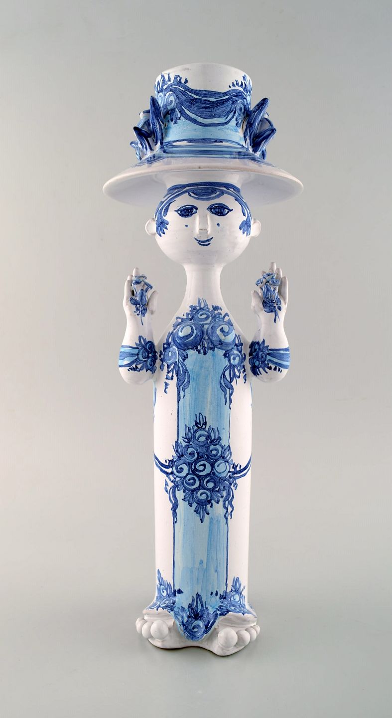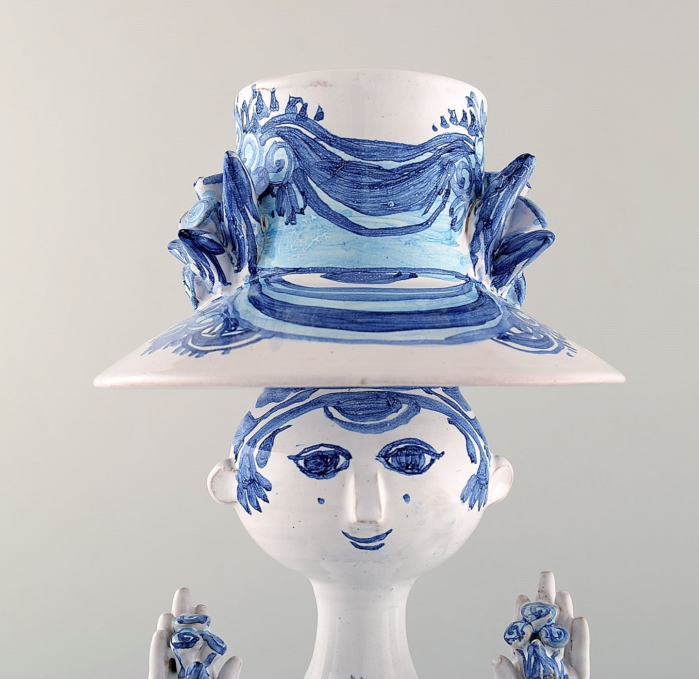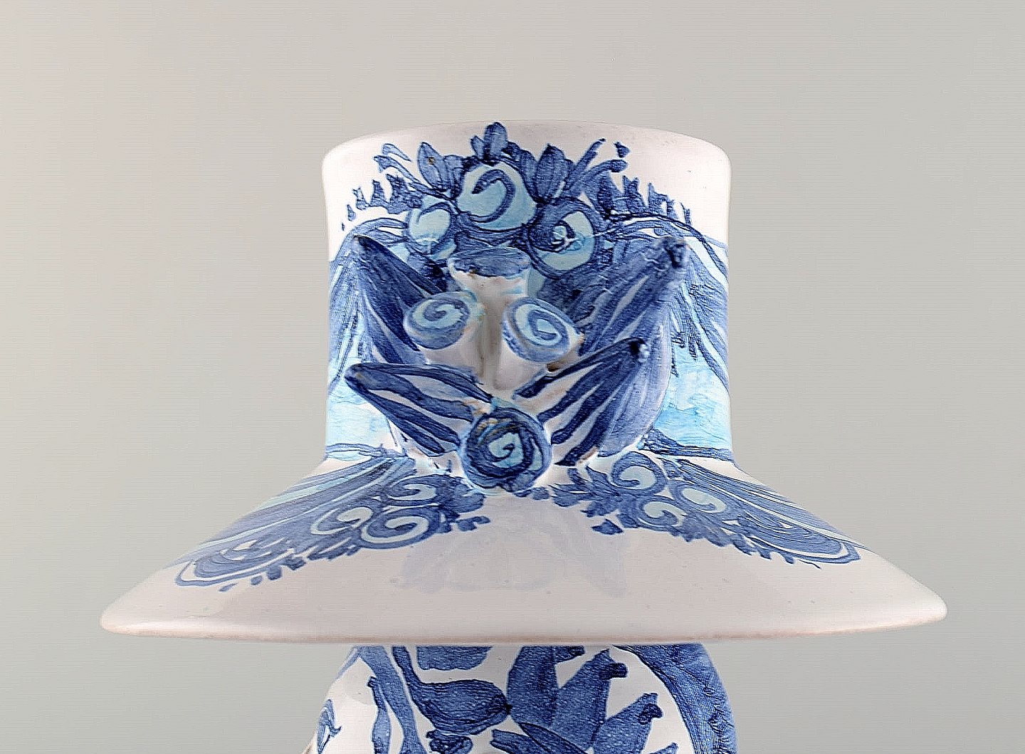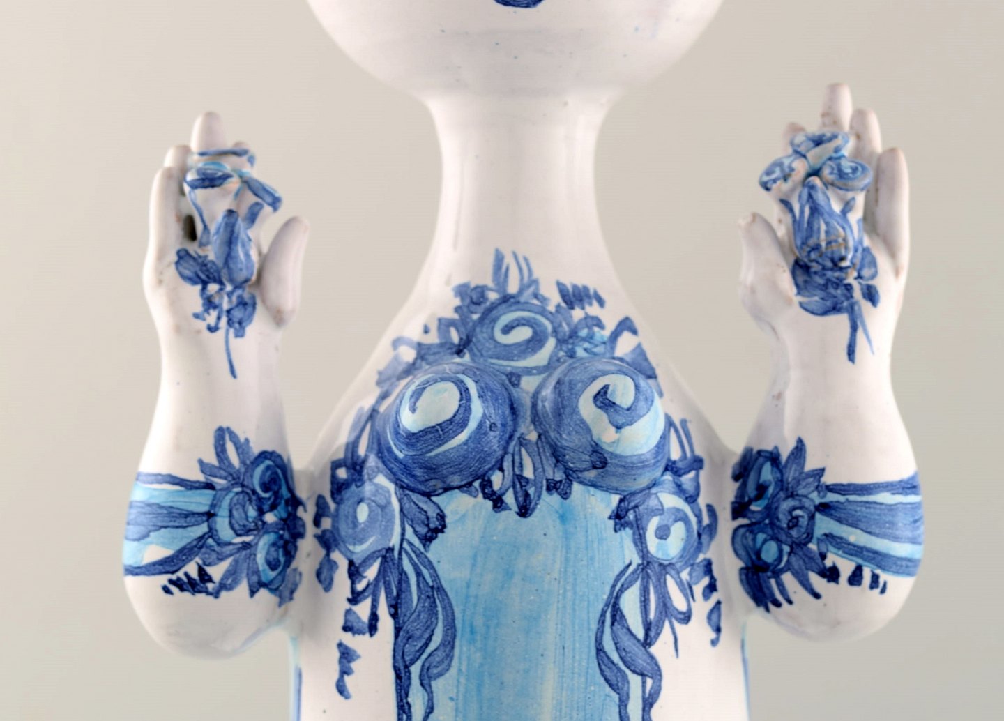 Bjørn Wiinblad keramik, blå dame med to fugle. Dekorationsnummer M36. Fra 2003. Højde 39 cm. Diameter 15 cm. I perfekt stand.