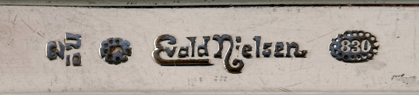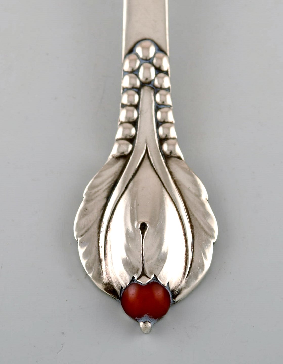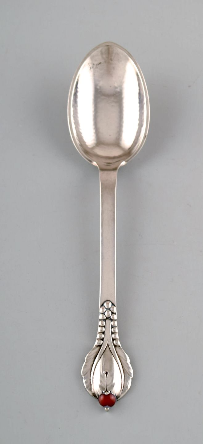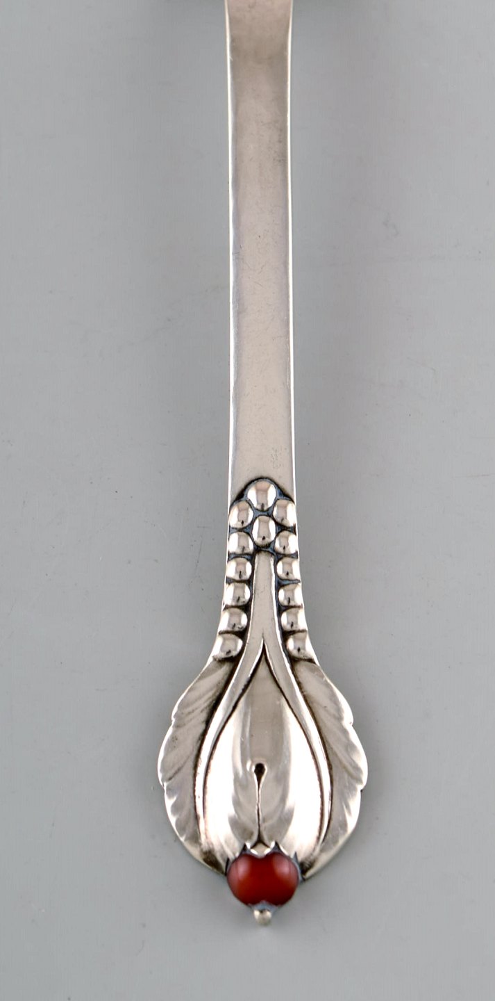 Evald Nielsen nummer 3, middagsske i hammerslået tretårnet sølv med cabochon sten. 1920'erne. Måler 19 cm. Stemplet. I perfekt stand.