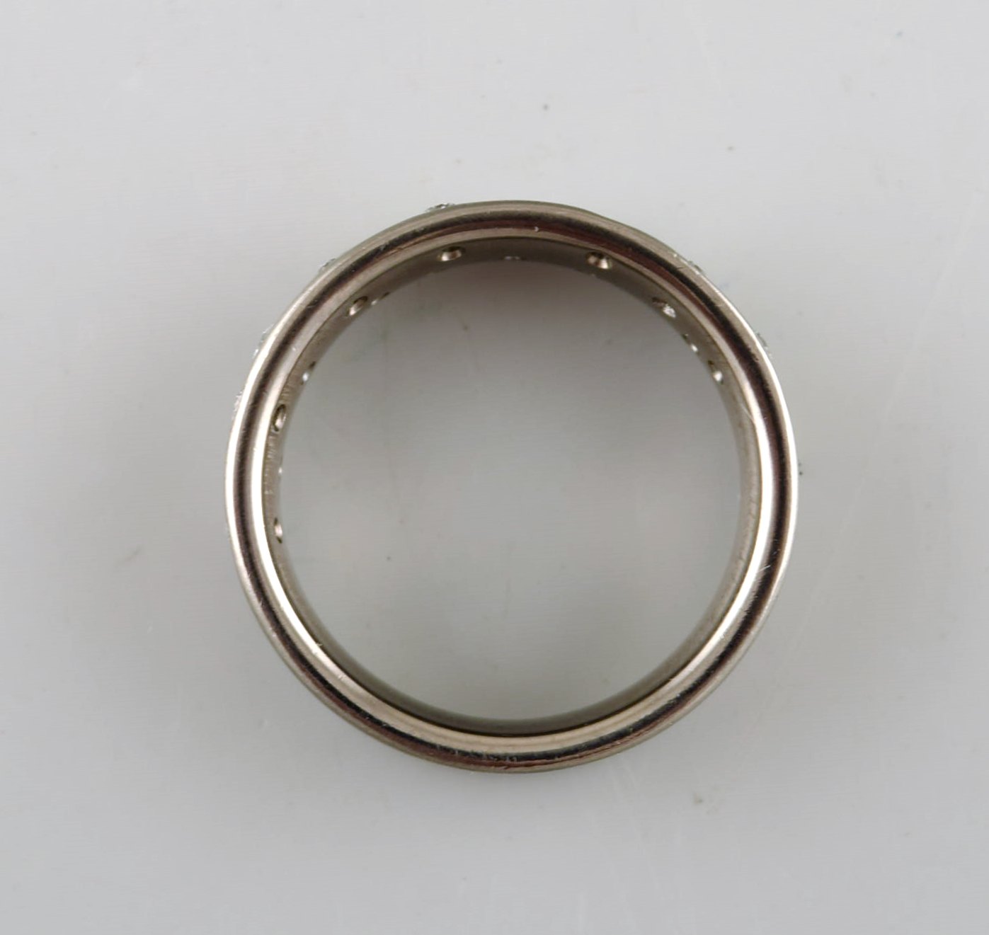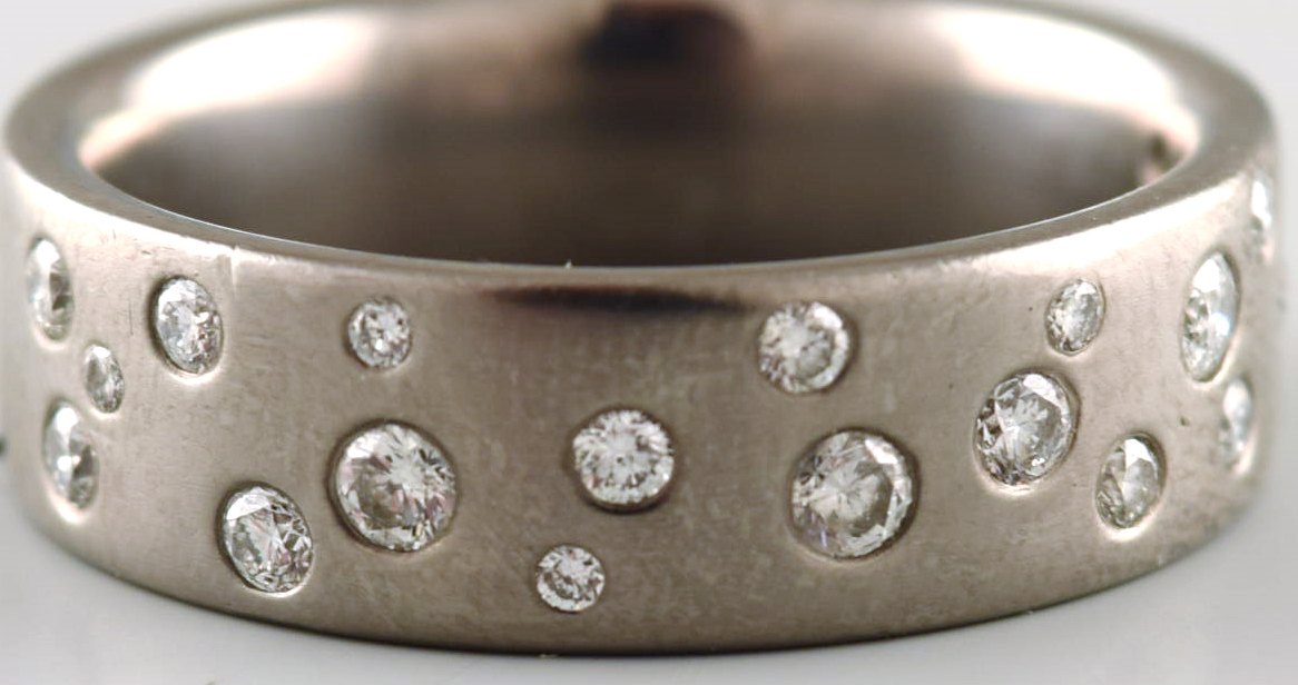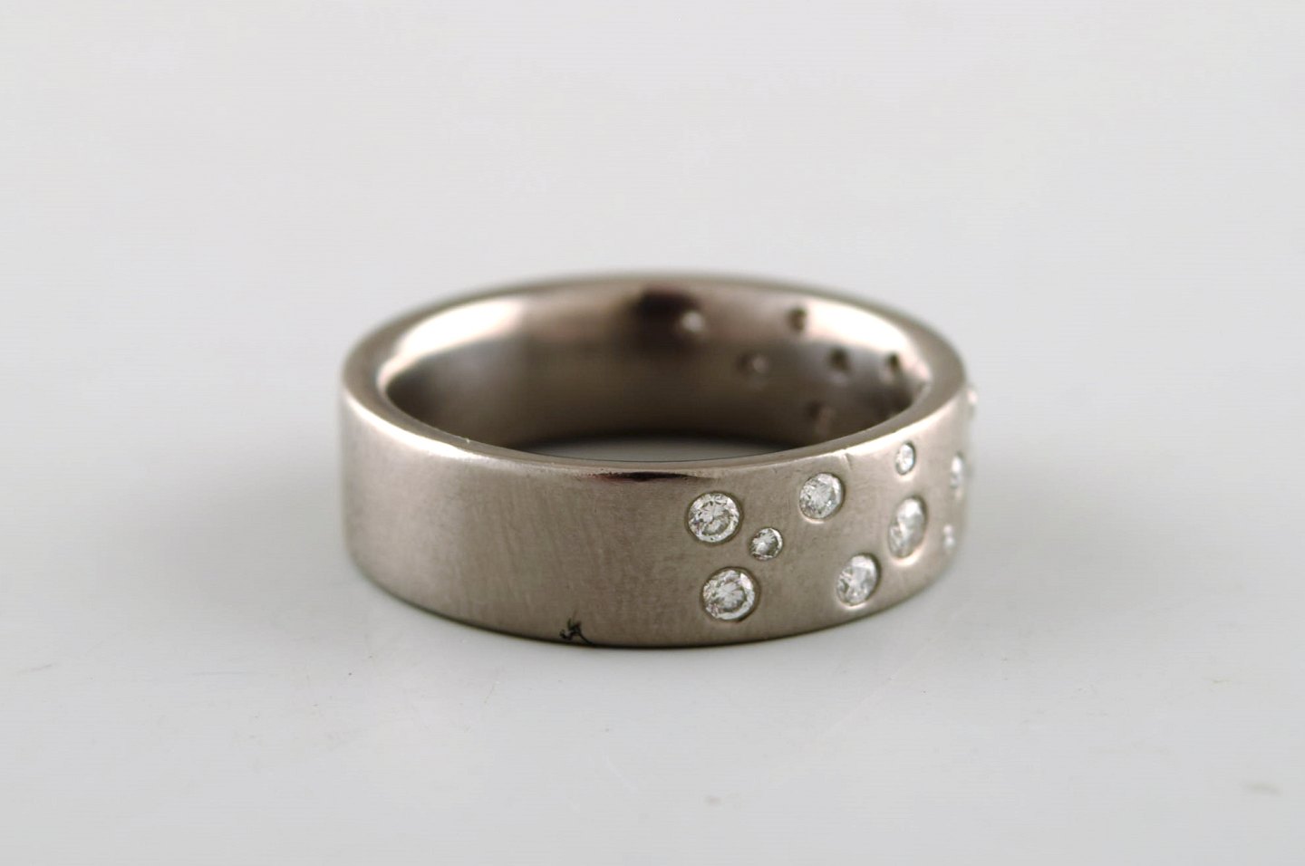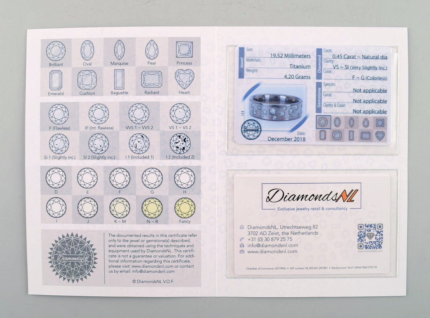 Modernistisk ring i titanium med talrige diamanter. Certifikat medfølger. I flot stand. Karat: 0,45. Klarhed: VS-SI. Farve: F-G. Vægt: 4,20 gram. Måler: 19,52 mm.