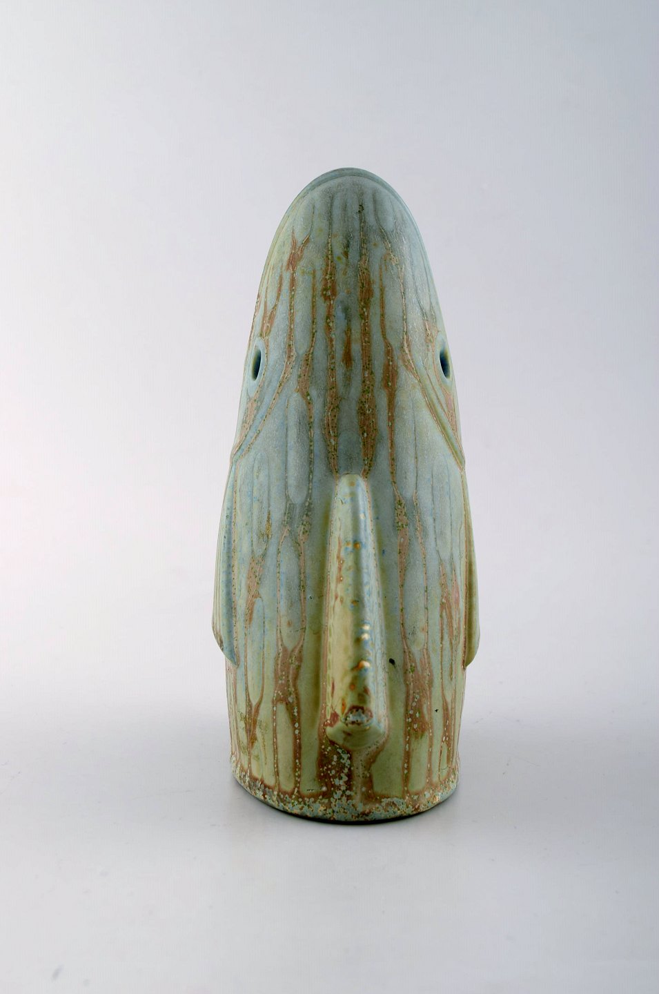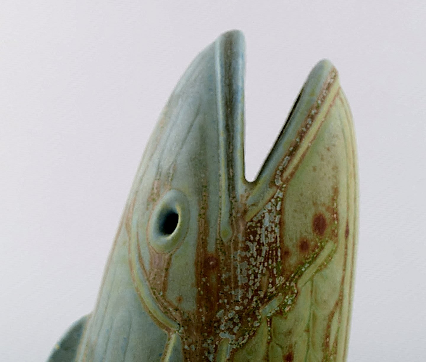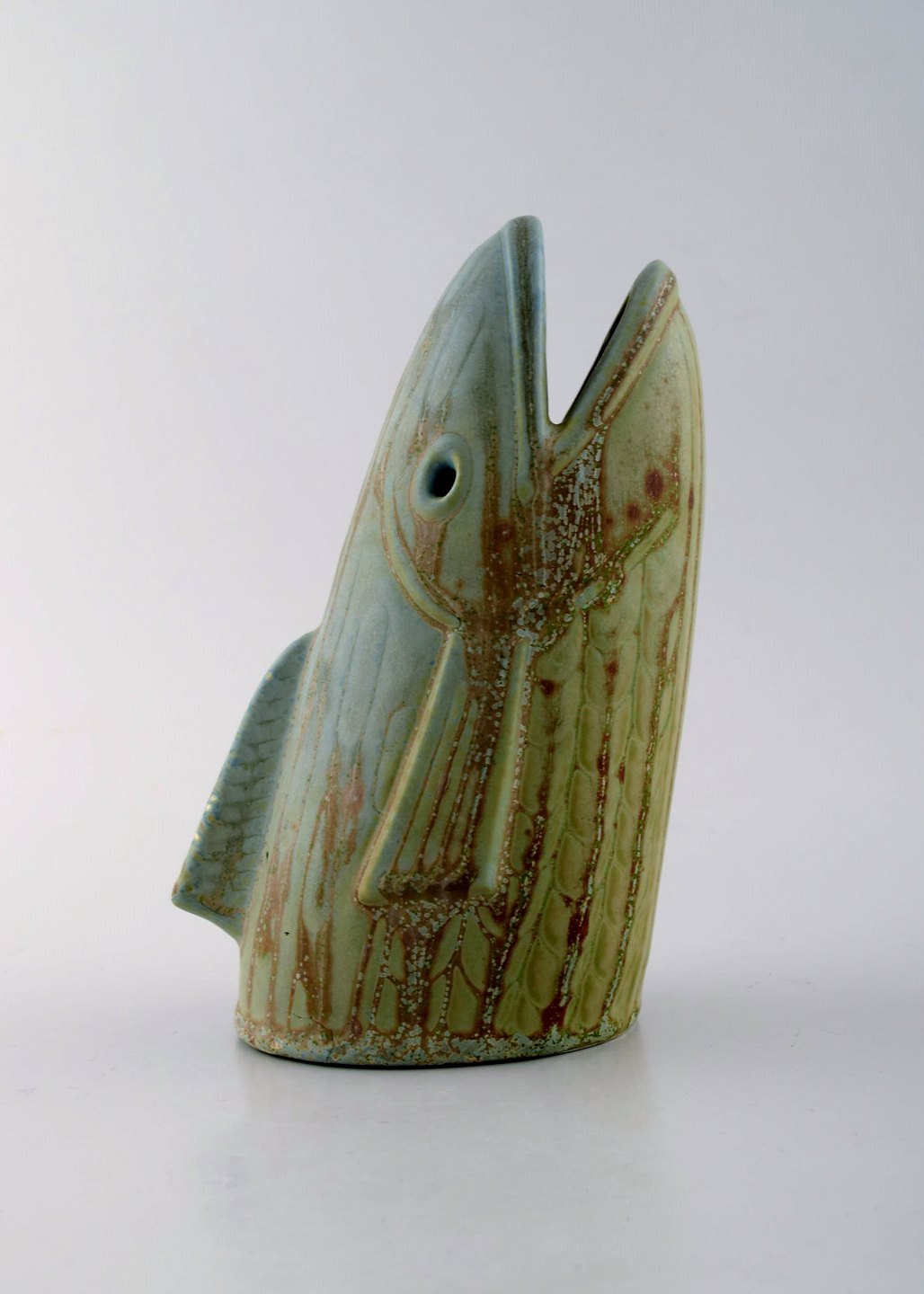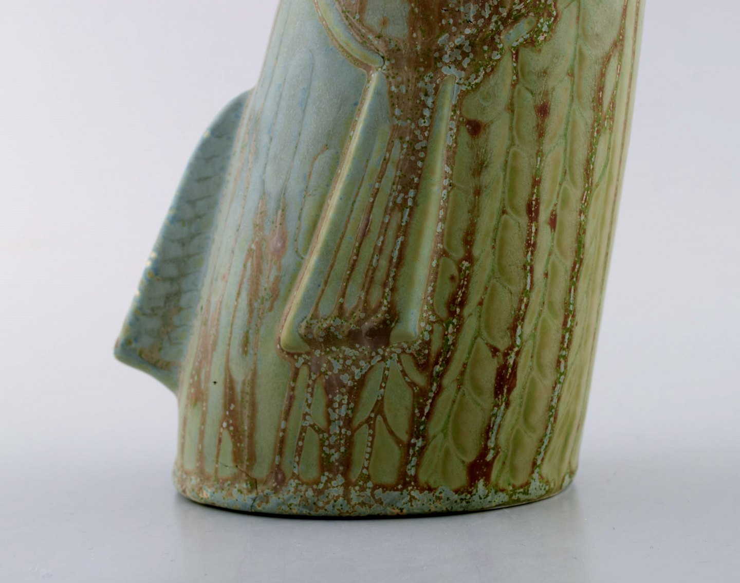 Rörstrand stentøjsfigur af Gunnar Nylund, sjælden fiskevase. Smuk glasur i blå grønne toner. I flot stand. 2. sortering. Måler 19 x 11,5 cm. Stemplet.
