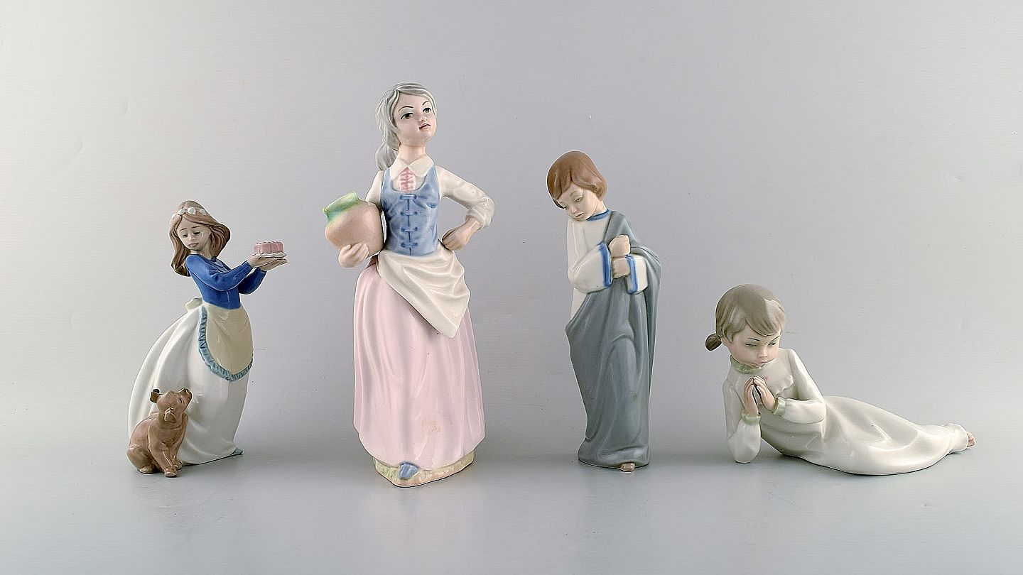 Tengre, Nao og Zaphir, Spanien. Fire barnefigurer i glaseret porcelæn. 1900-tallet. Største måler: 25,5 x 15 cm. I flot stand. Stemplet.