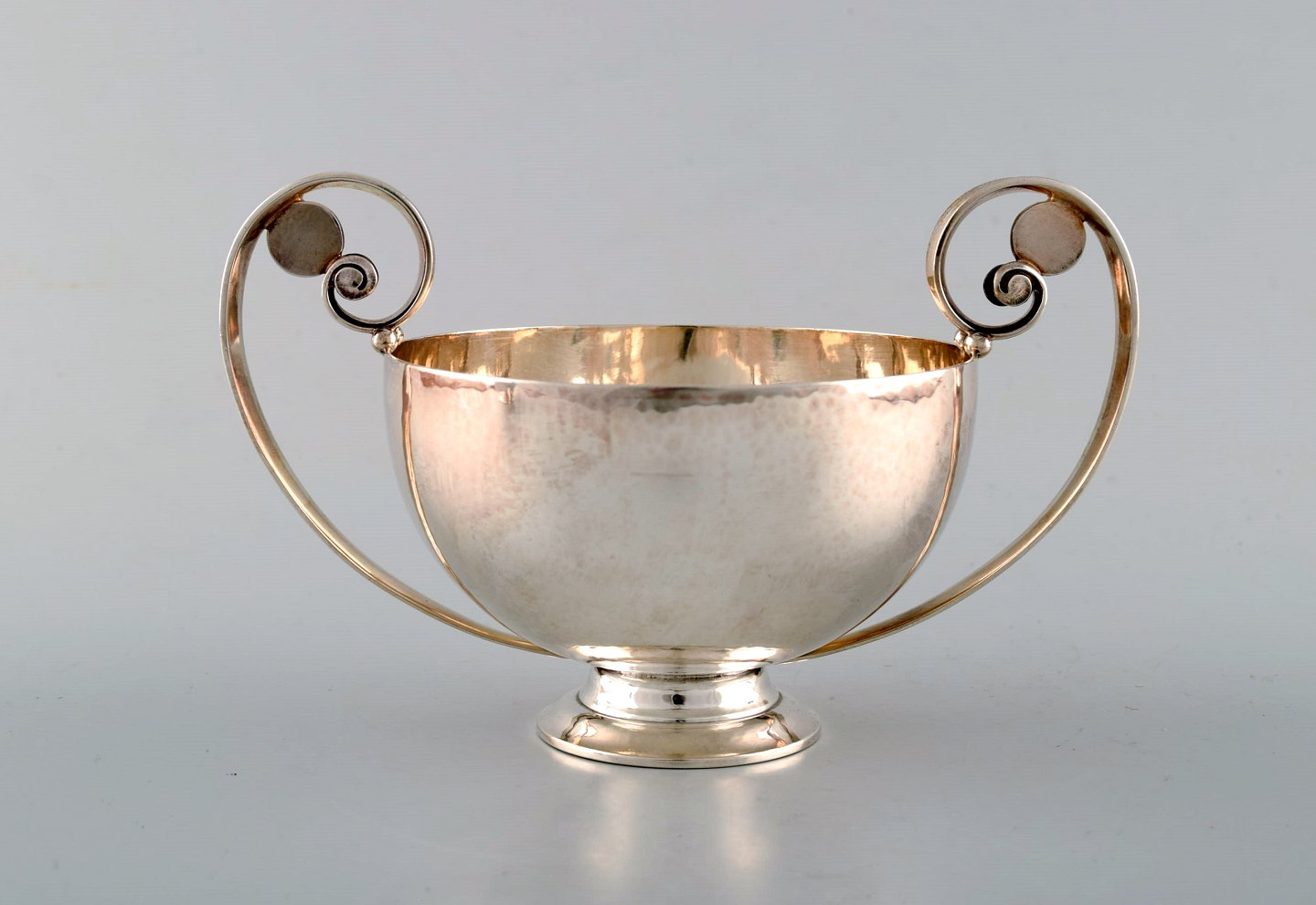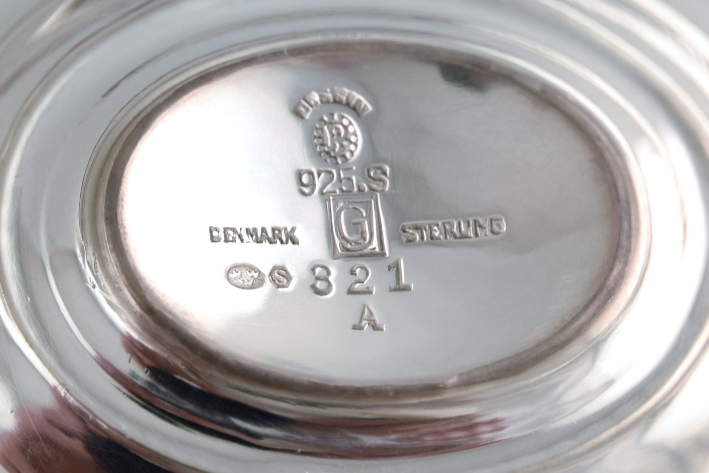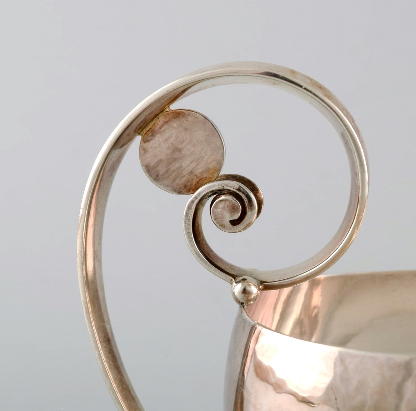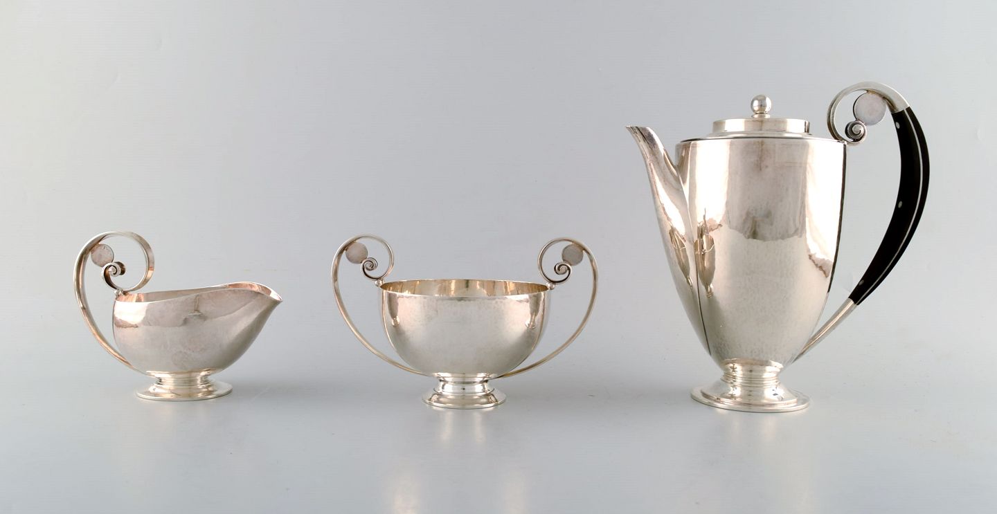 Johan Rohde for Georg Jensen. "Schilling" kaffesæt bestående af kaffekande, flødekande og sukkerskål i sterlingsølv med hank af ibenholt. Dateret 1933-1944.