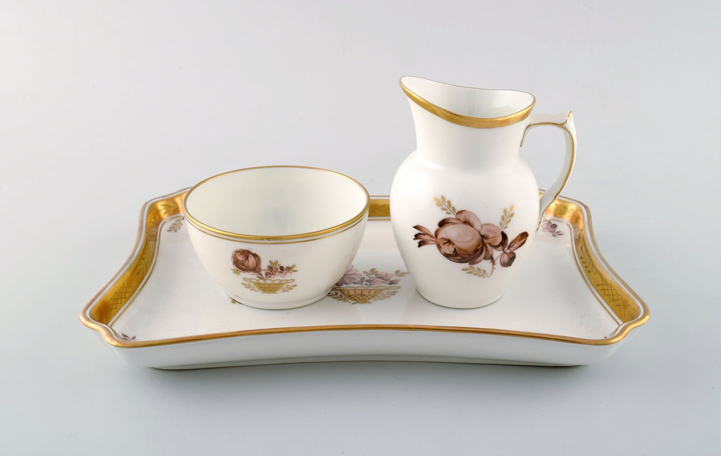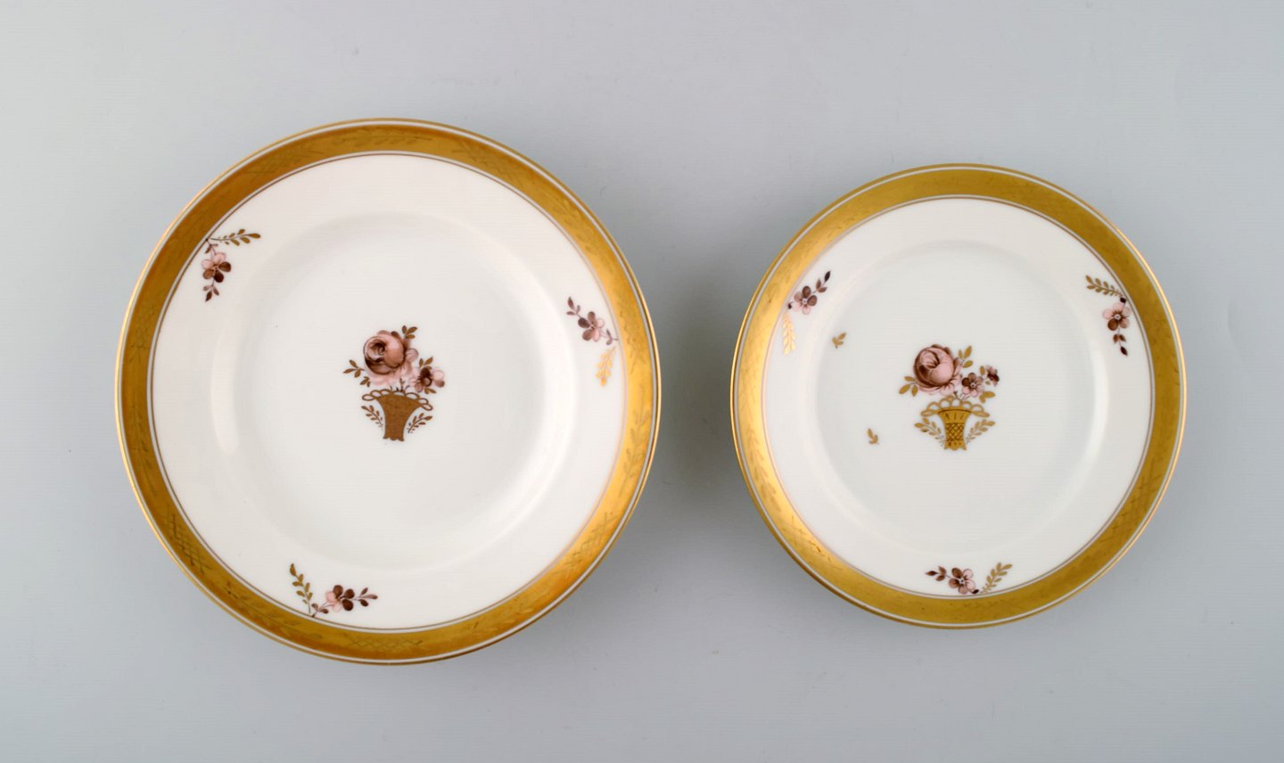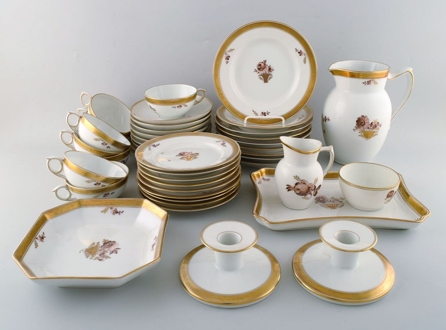 Royal Copenhagen. "Guldkurv" Teservice i porcelæn. Komplet til 9 personer med tilhørende sukker/fløde sæt samt kande, tallerkener fad og to lysestager. Midt 1900-tallet.