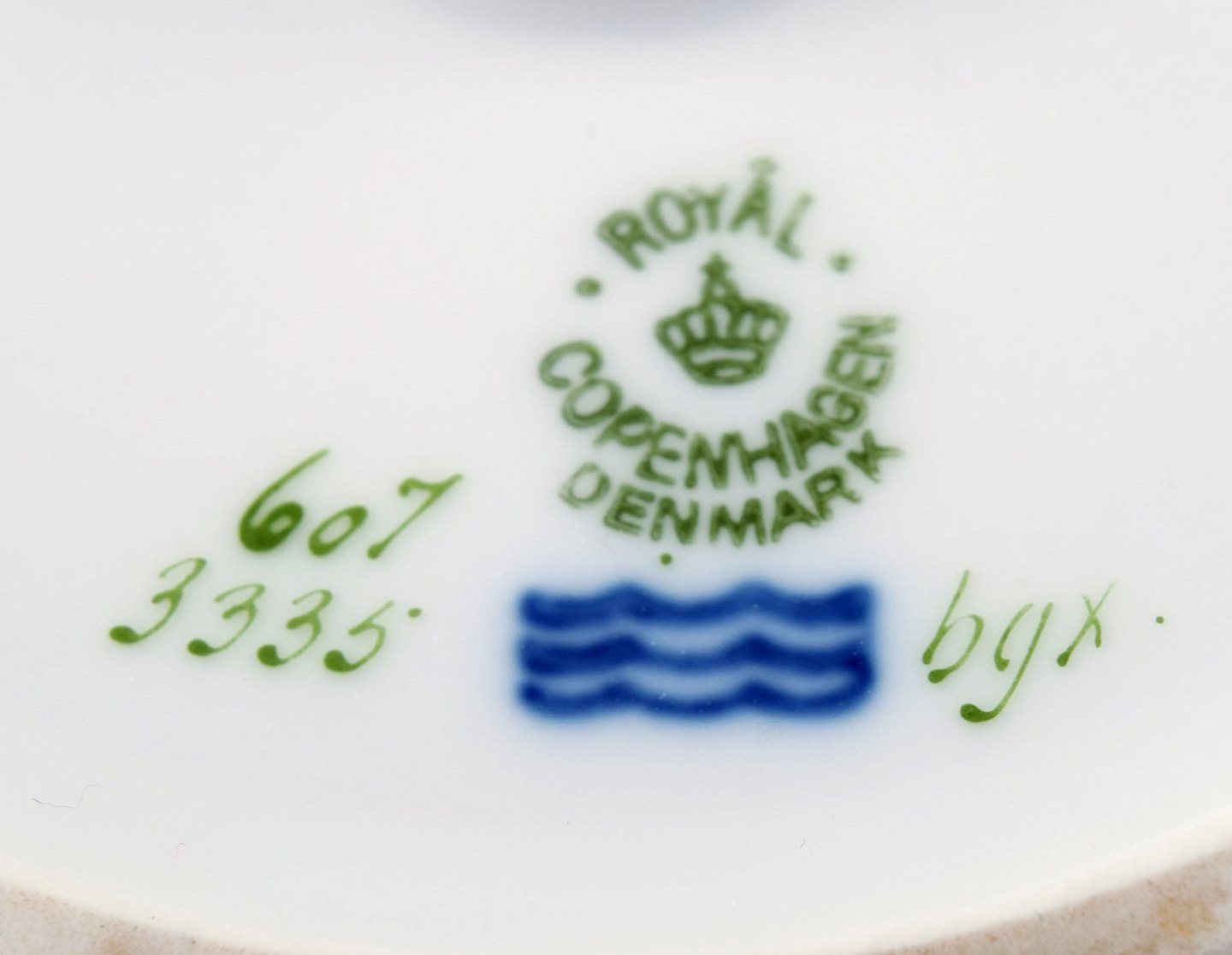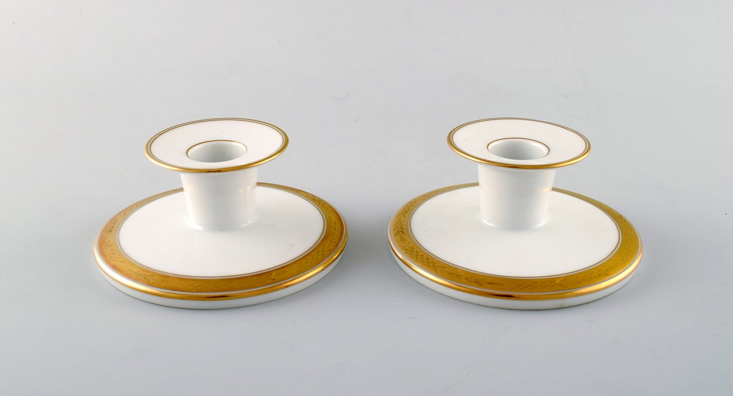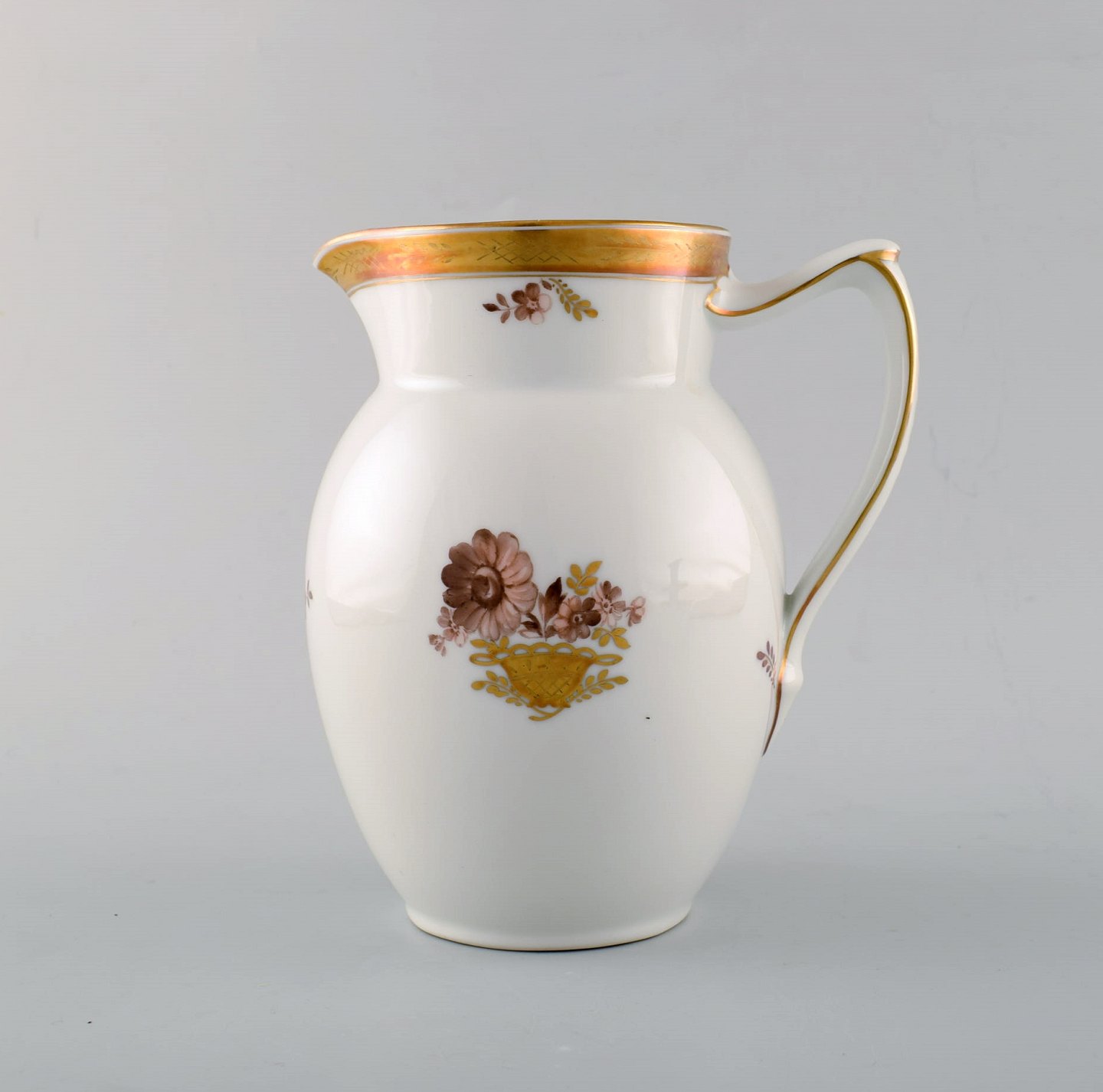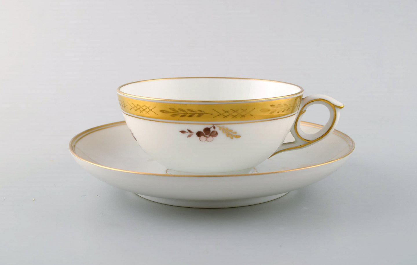 Royal Copenhagen. "Guldkurv" Teservice i porcelæn. Komplet til 9 personer med tilhørende sukker/fløde sæt samt kande, tallerkener fad og to lysestager. Midt 1900-tallet.