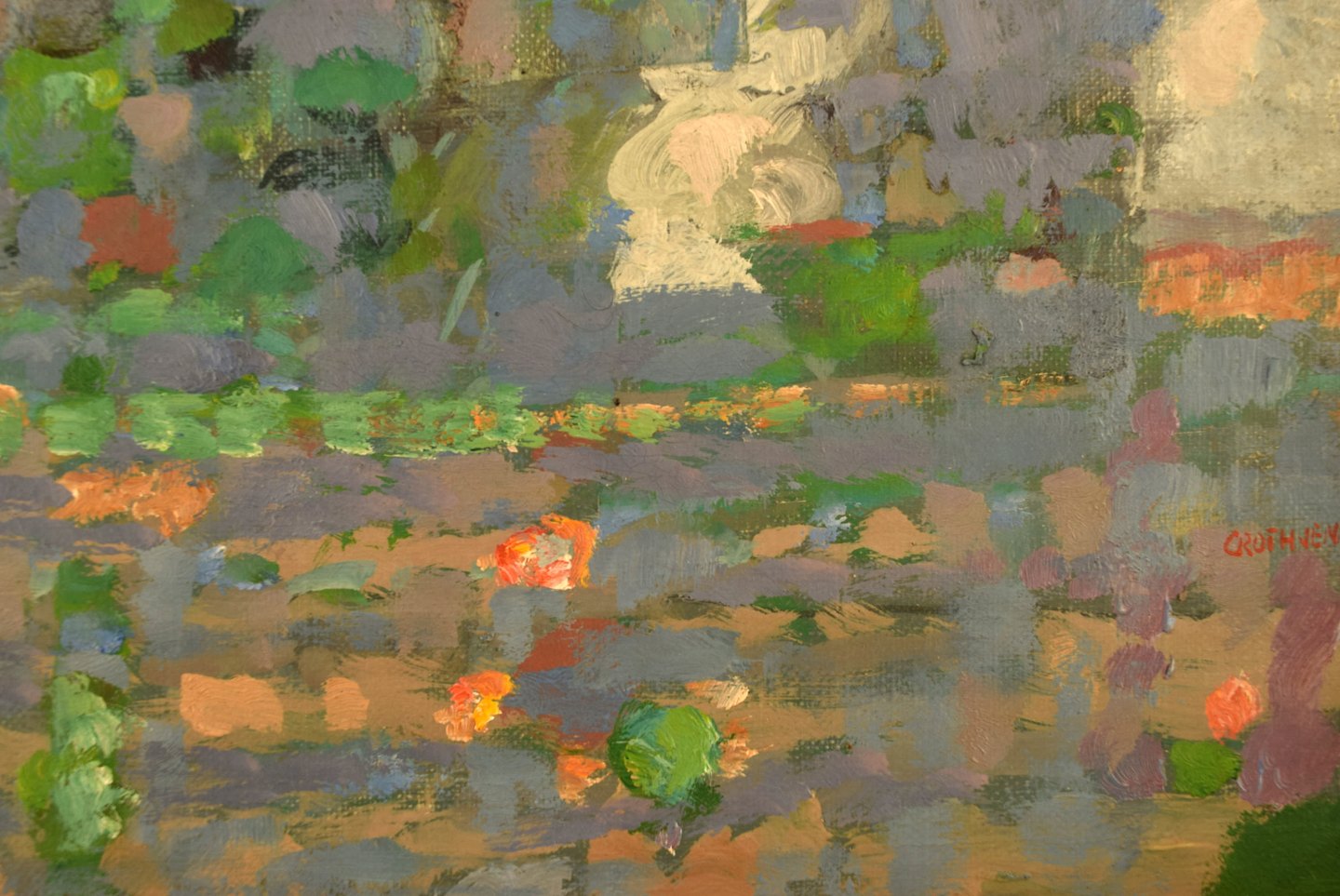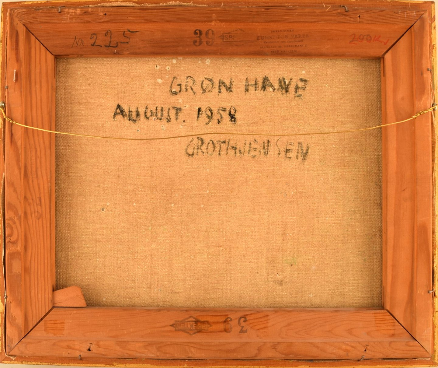Jens Peter Groth-Jensen (1918-2018). Dansk kunstner. Olie på lærred. "Grøn have". Modernistisk landskab. Dateret 1958. Signeret. I flot stand. Lærredet måler: 38 x 31 cm. Rammen måler: 1,5 cm.