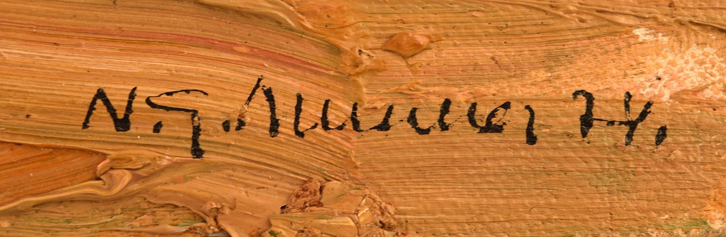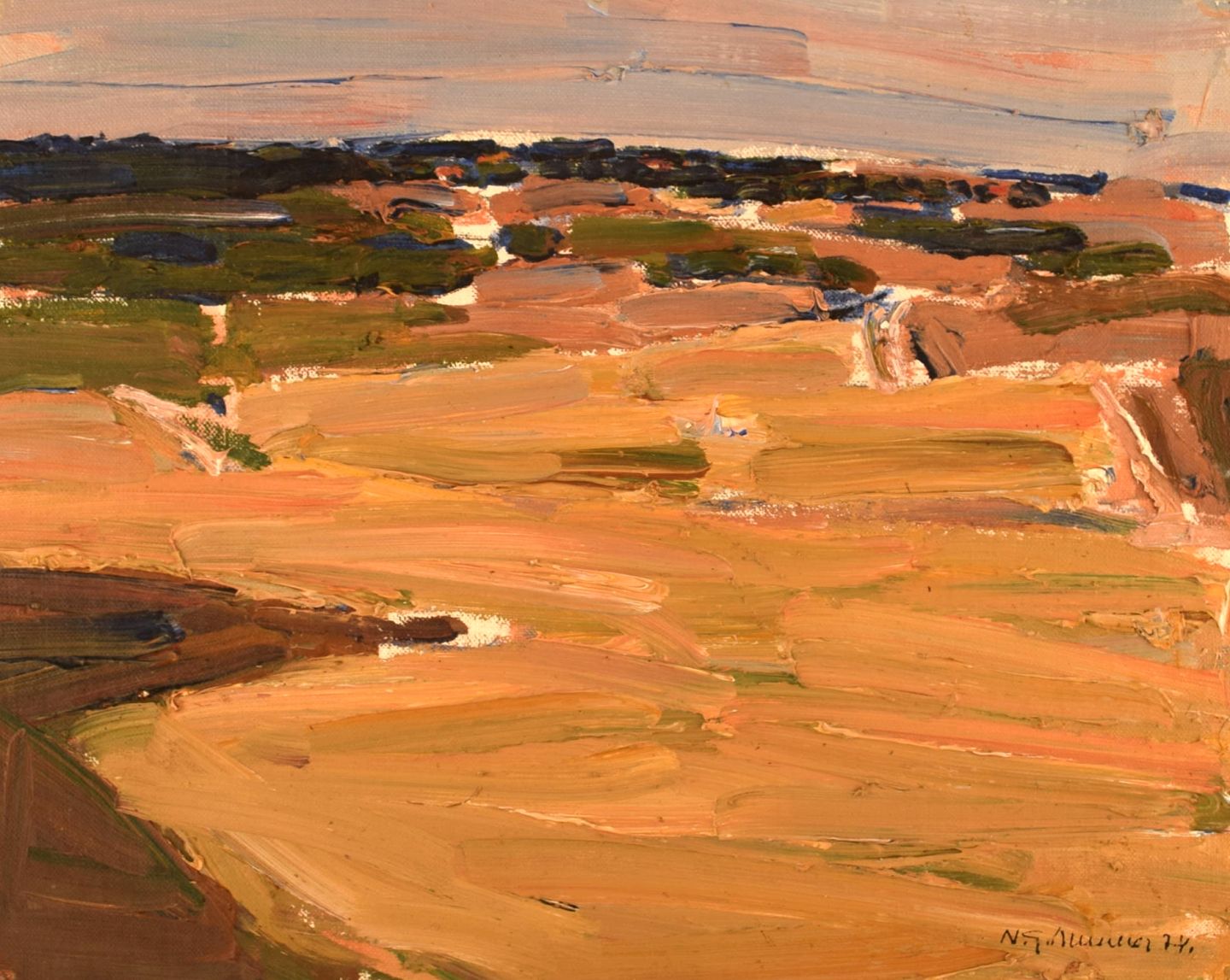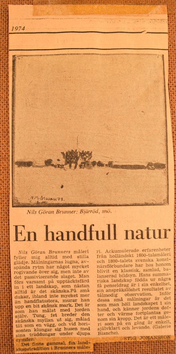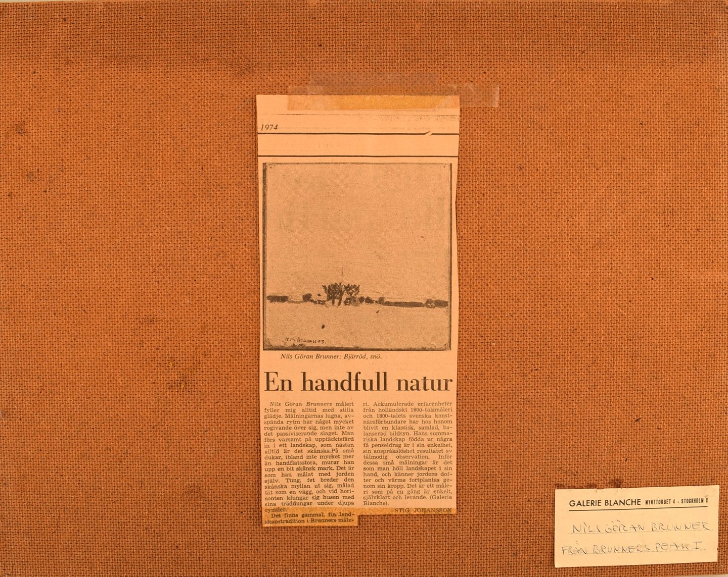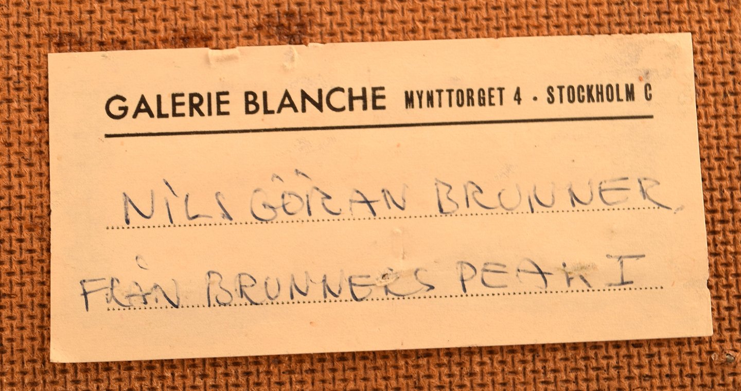 Nils-Göran Brunner (1923-1986). Svensk kunstmaler. Olie på plade. Modernistisk landskab. Dateret 1974. Signeret. I flot stand. Måler: 37,5 x 29,5 cm.