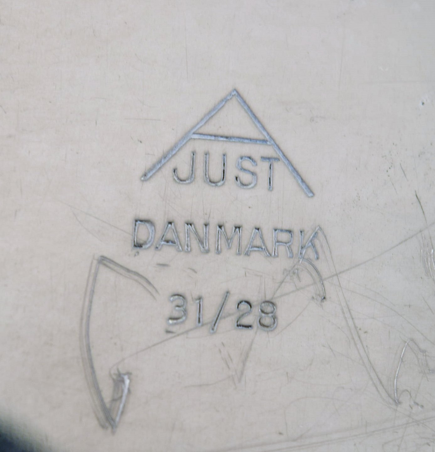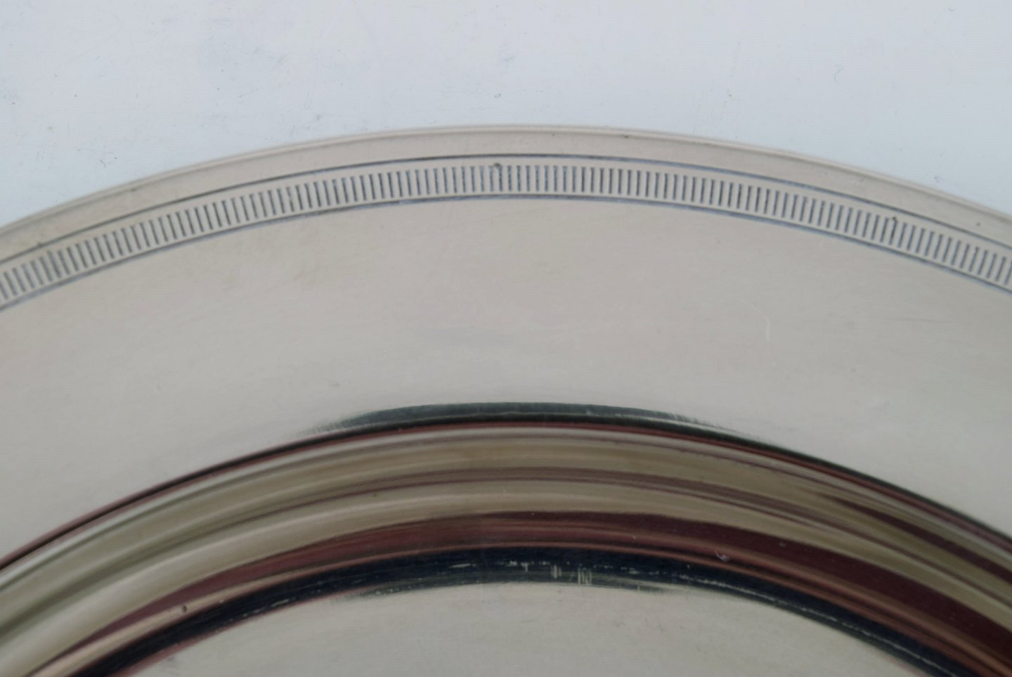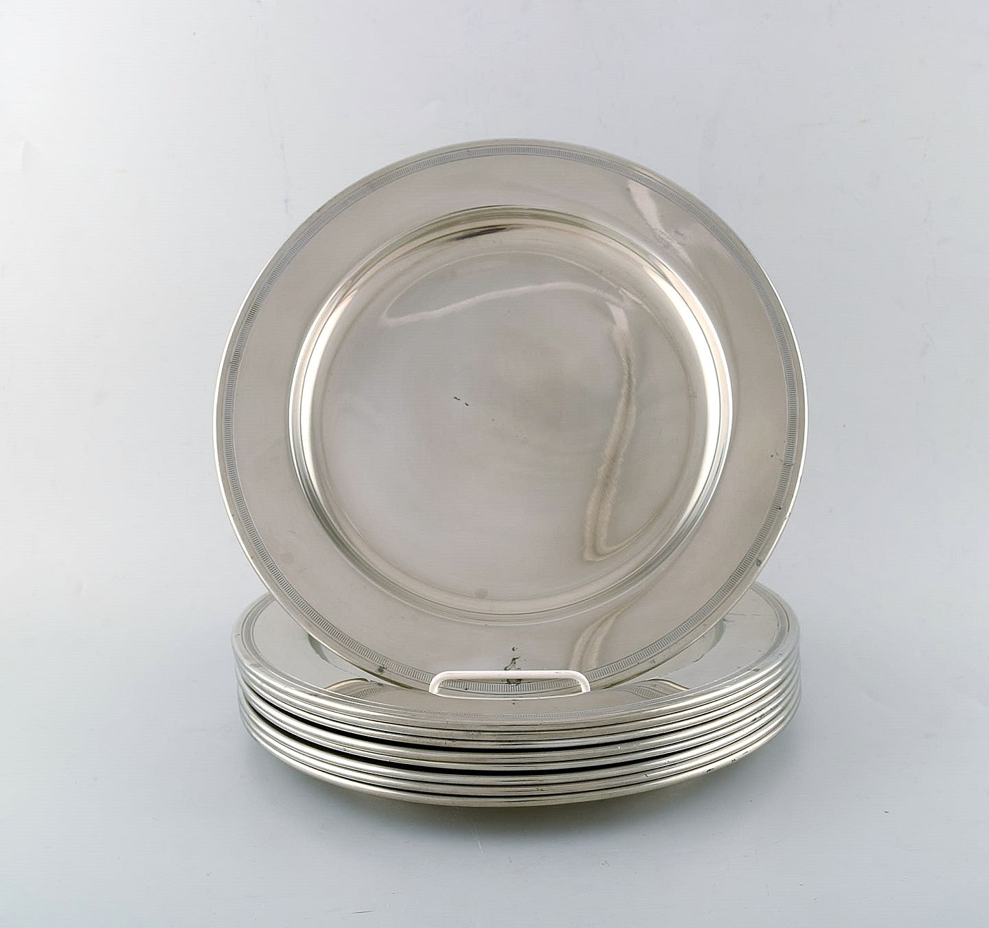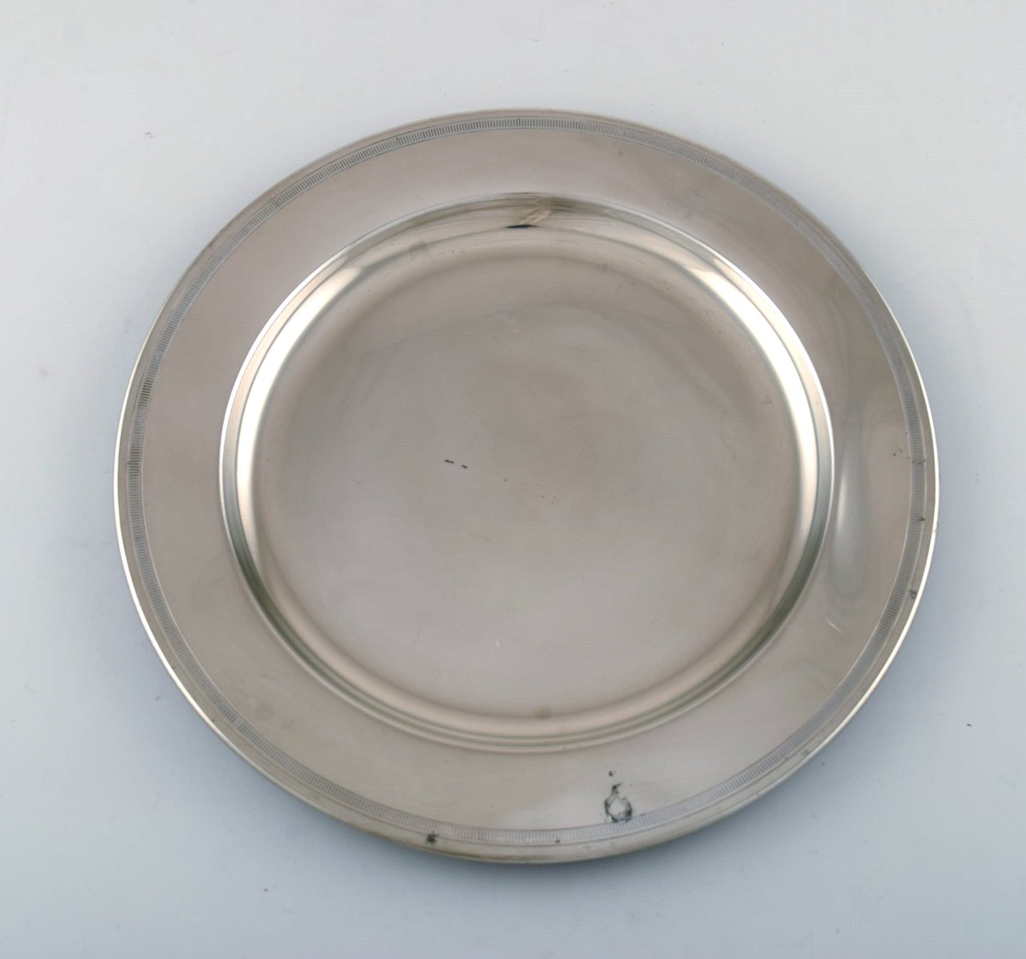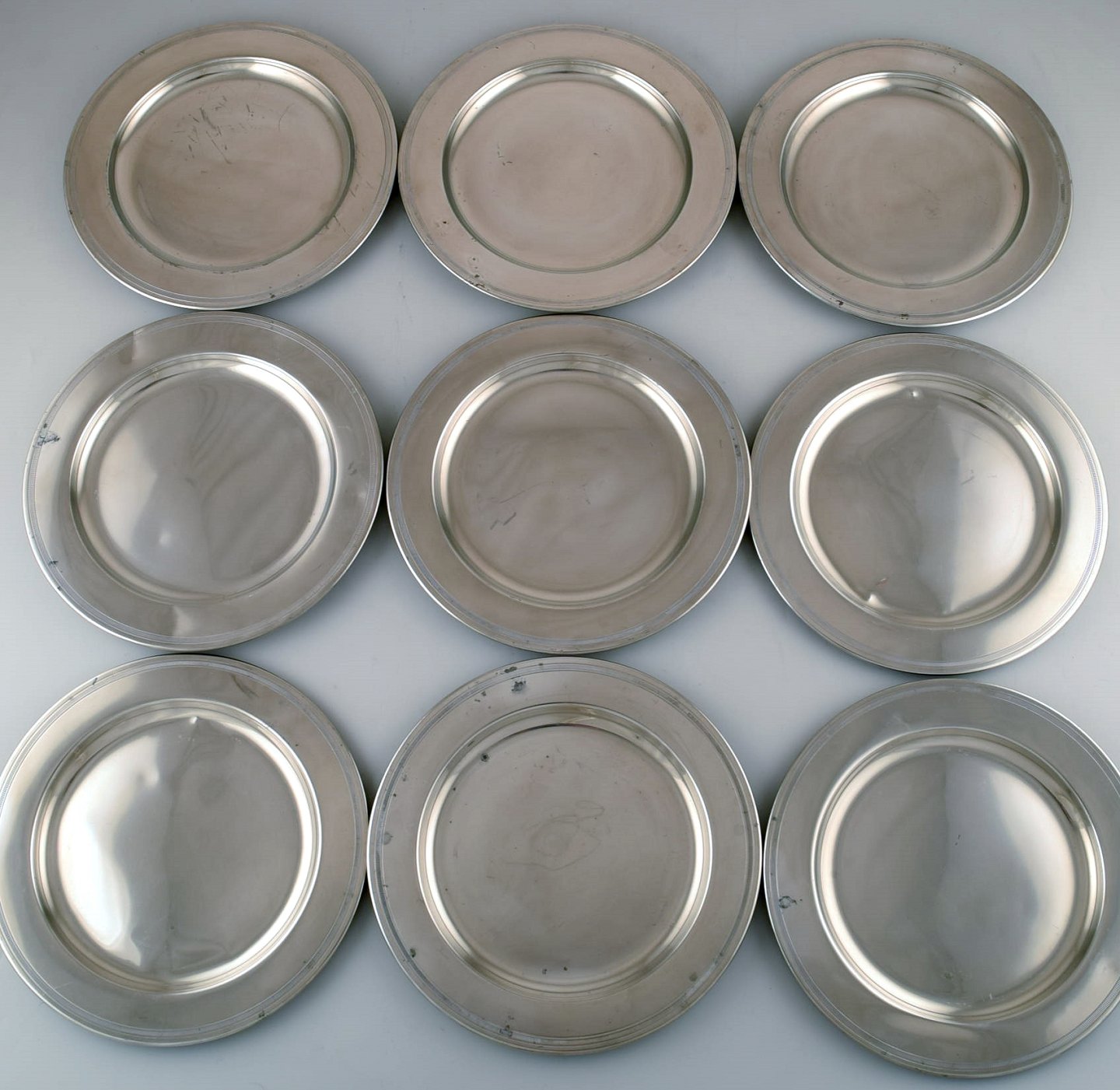Just Andersen. Ni art deco dækketallerkener af tin med kanneleret bort. 1930'erne. I flot stand. Måler: 27,5 cm. Stemplet: Just, Danmark. 31/28.