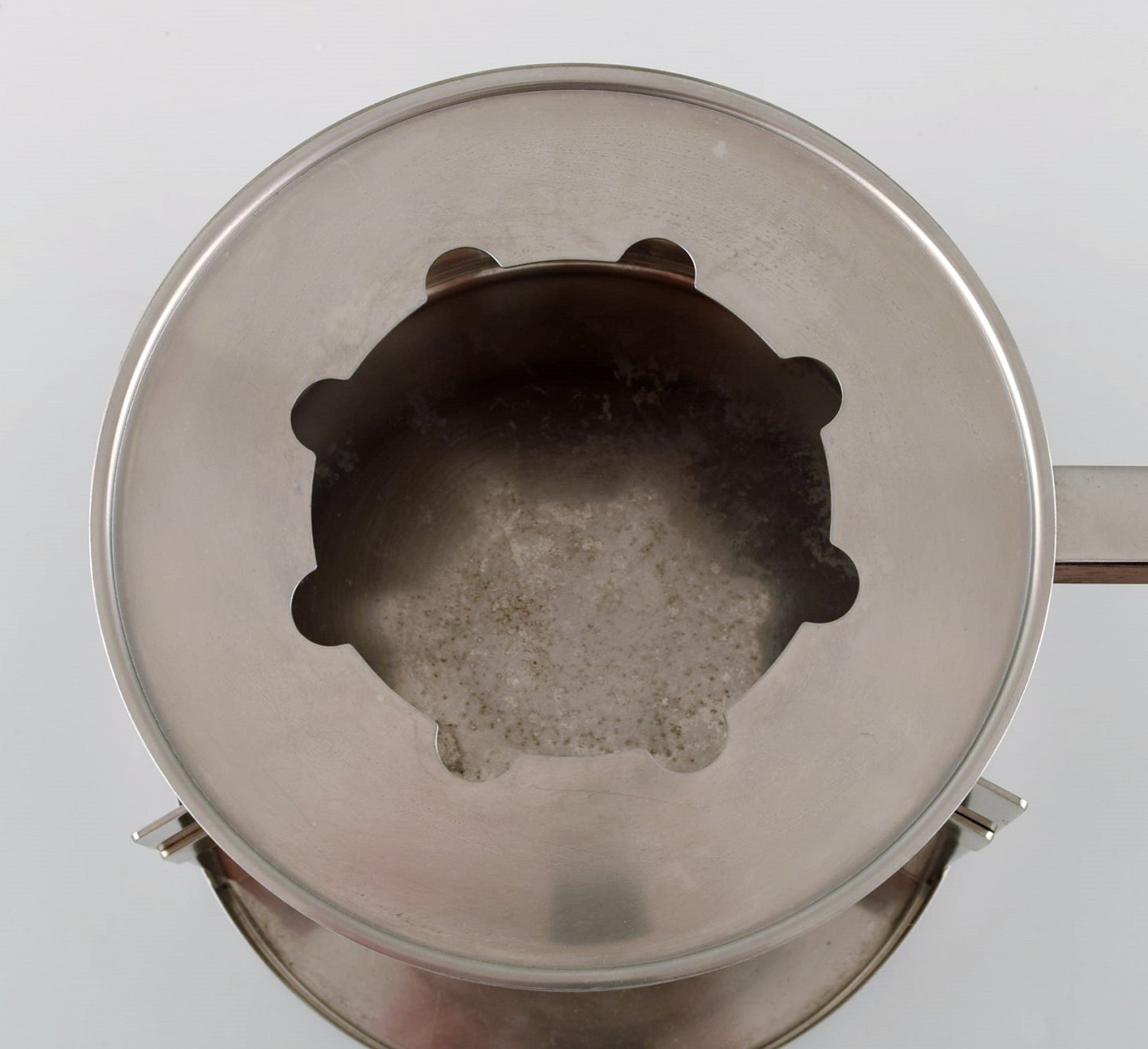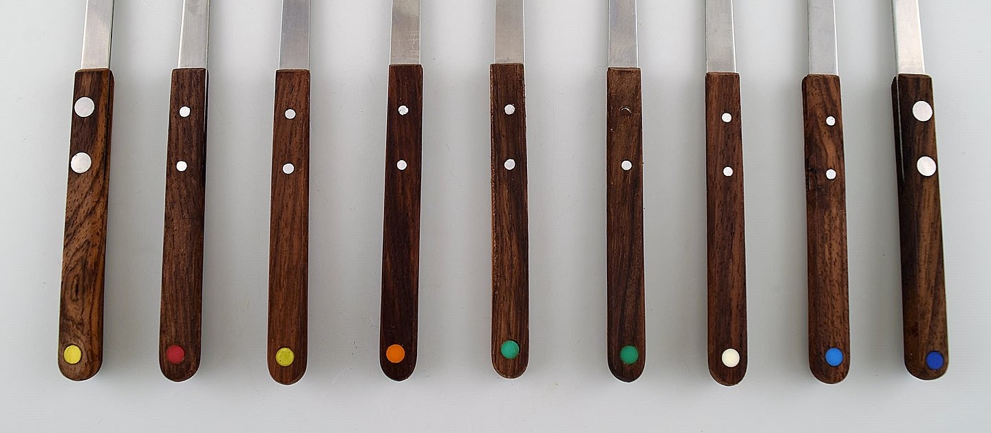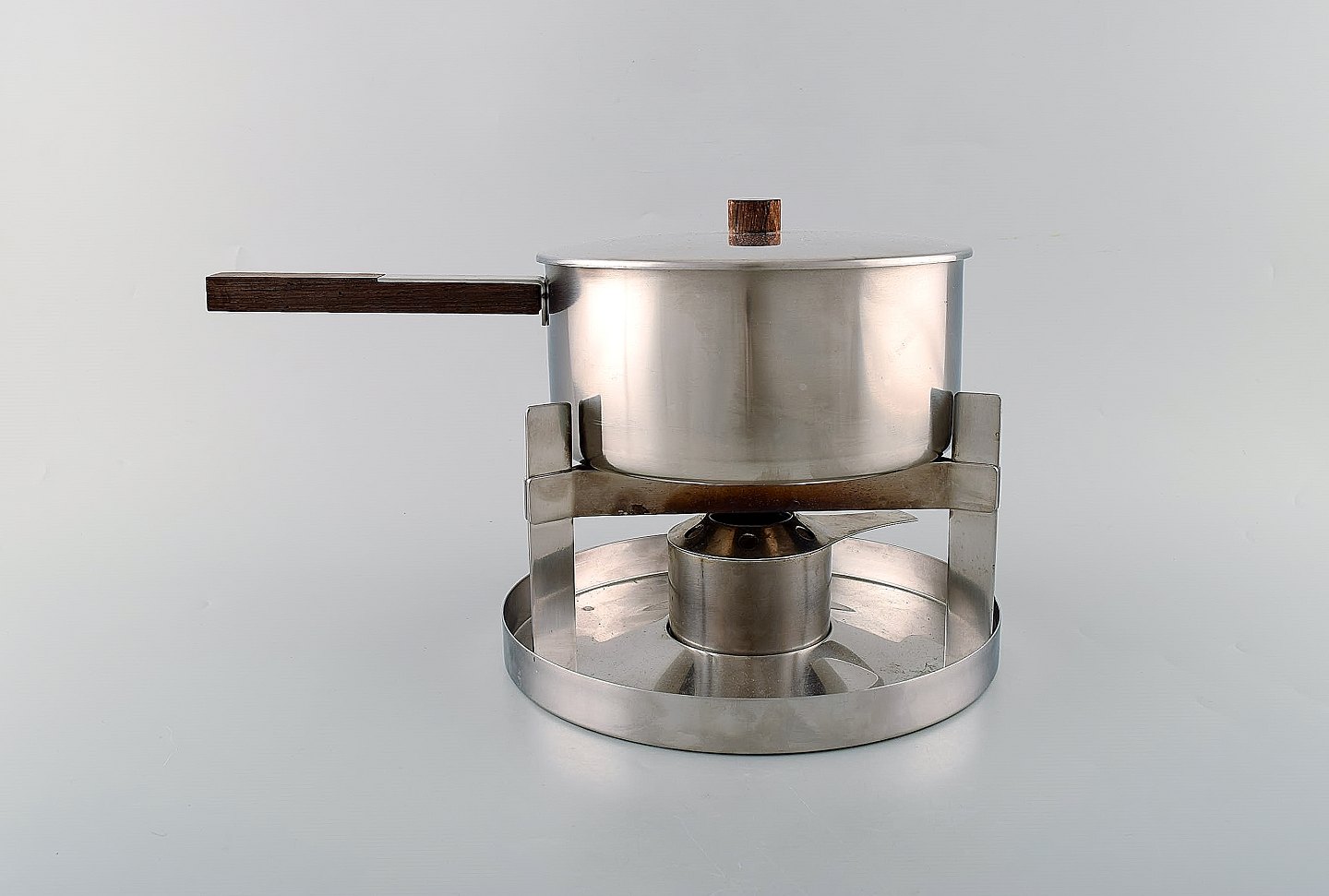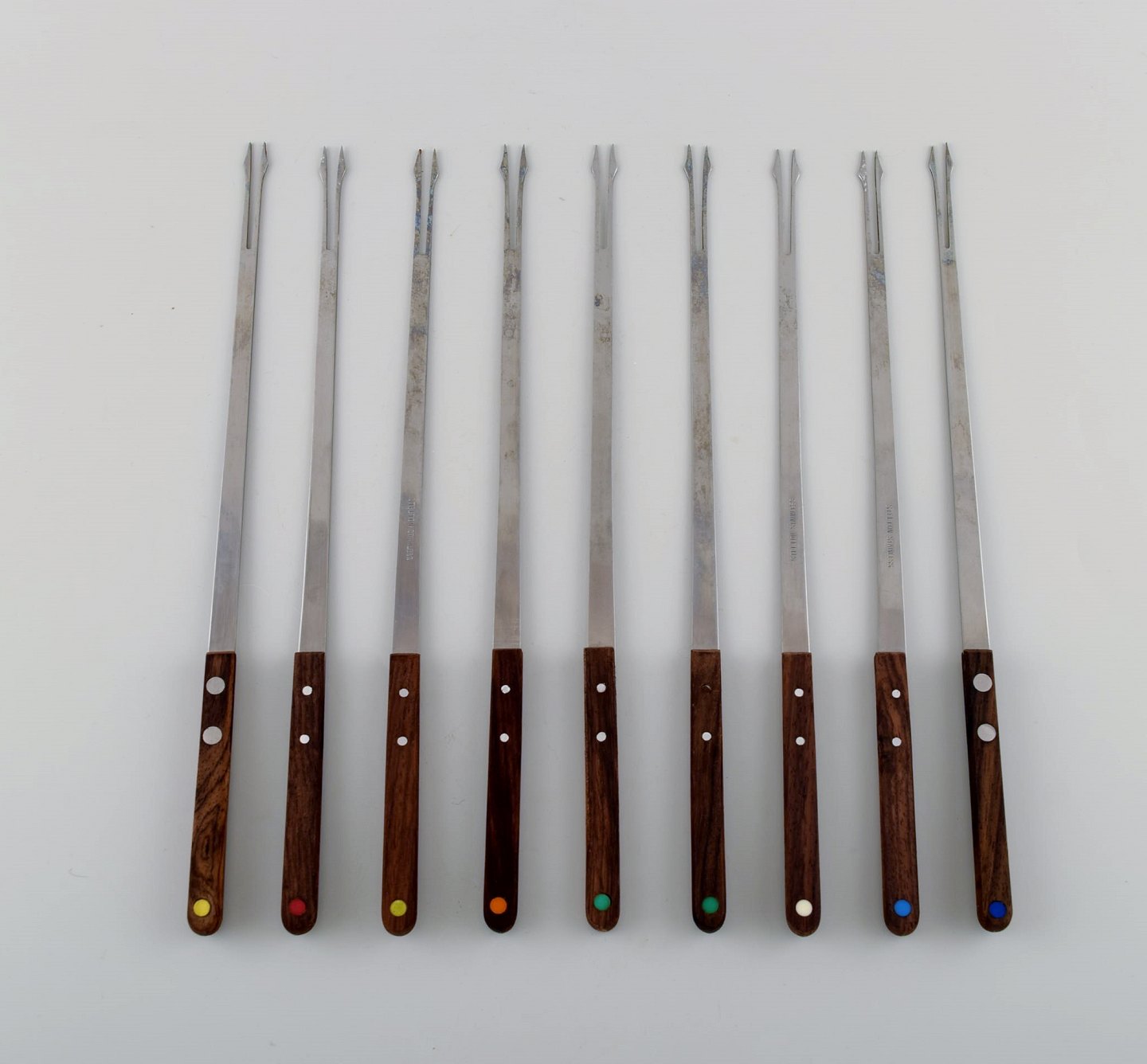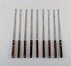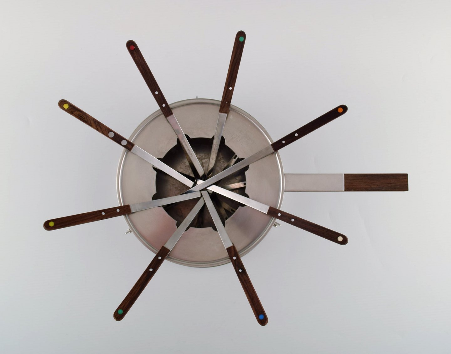 Arne Jacobsen for Stelton. "Cylinda Line" fondue sæt i rustfrit stål og teaktræ med ni tilhørende spyd. 1970'erne. Måler: 21 x 19 cm (uden hank). Spydene måler: 28,5 cm. I flot stand. Stemplet.