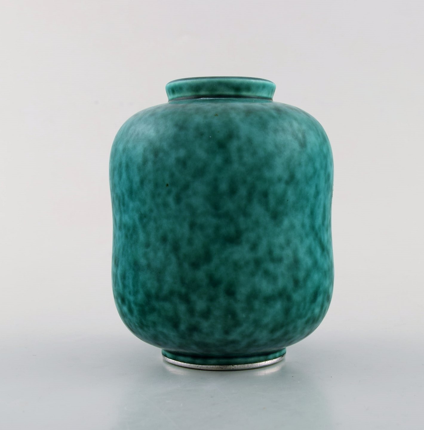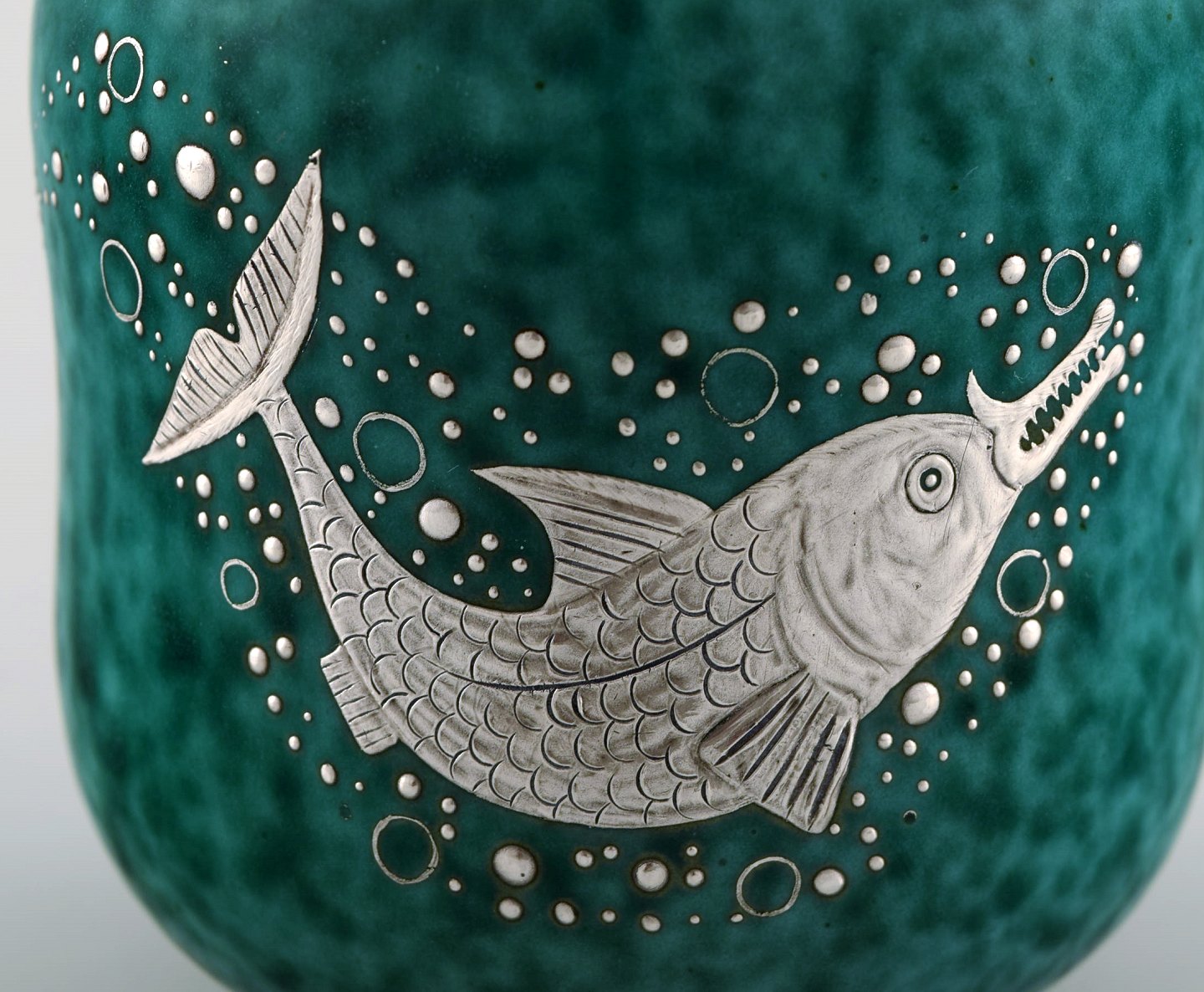 Wilhelm Kåge for Gustavsberg. Argenta vase i glaseret keramik dekoreret med fisk i sølvindlæg. Sverige 1940´erne. Måler: 12 x 10 cm. Stemplet: Gustavsberg, Kåge. I flot stand.