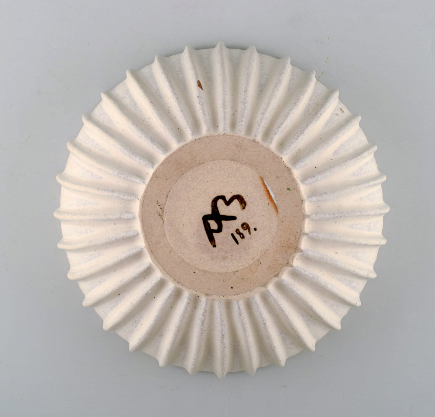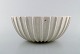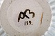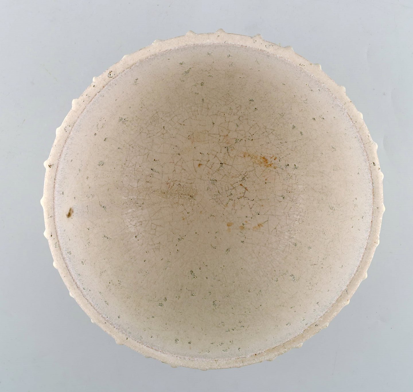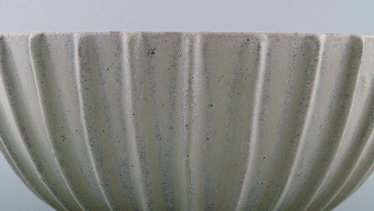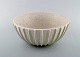 Arne Bang. Bordskål af stentøj med kanneleret korpus. Dekoreret med smuk spættet glasur i sand nuancer. 1930'erne. Signeret i monogram. Nr. 189. Måler: 26 x 10 cm. I perfekt stand.