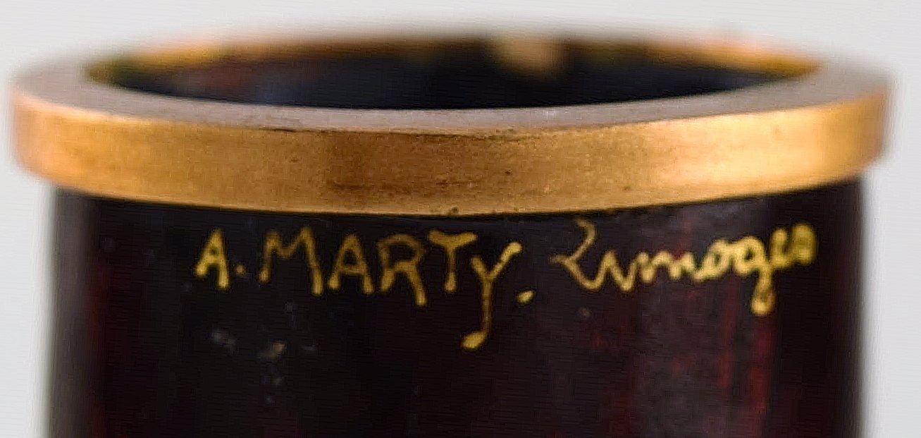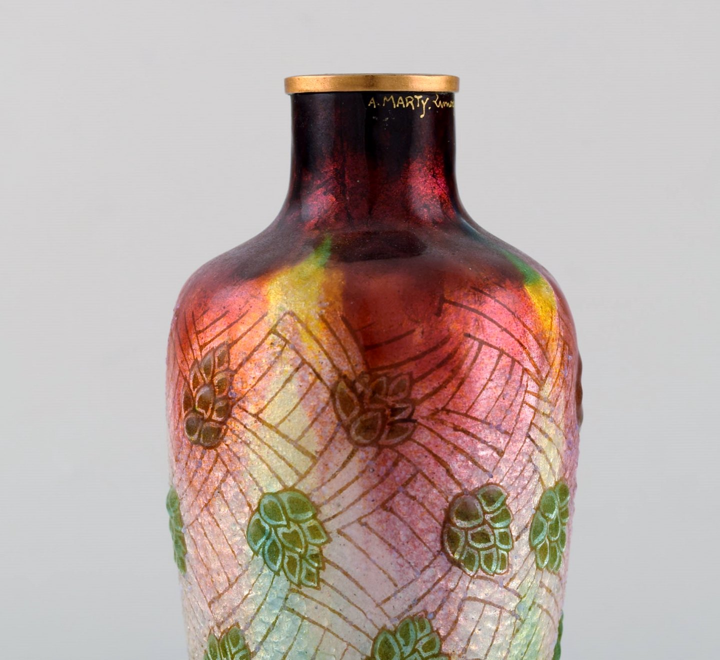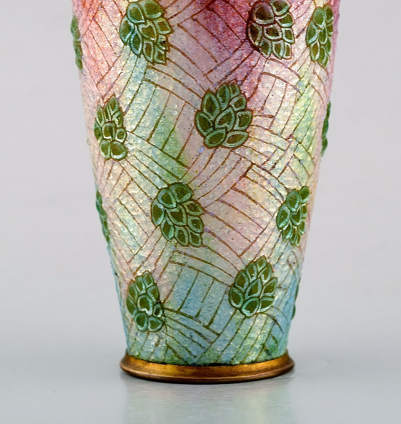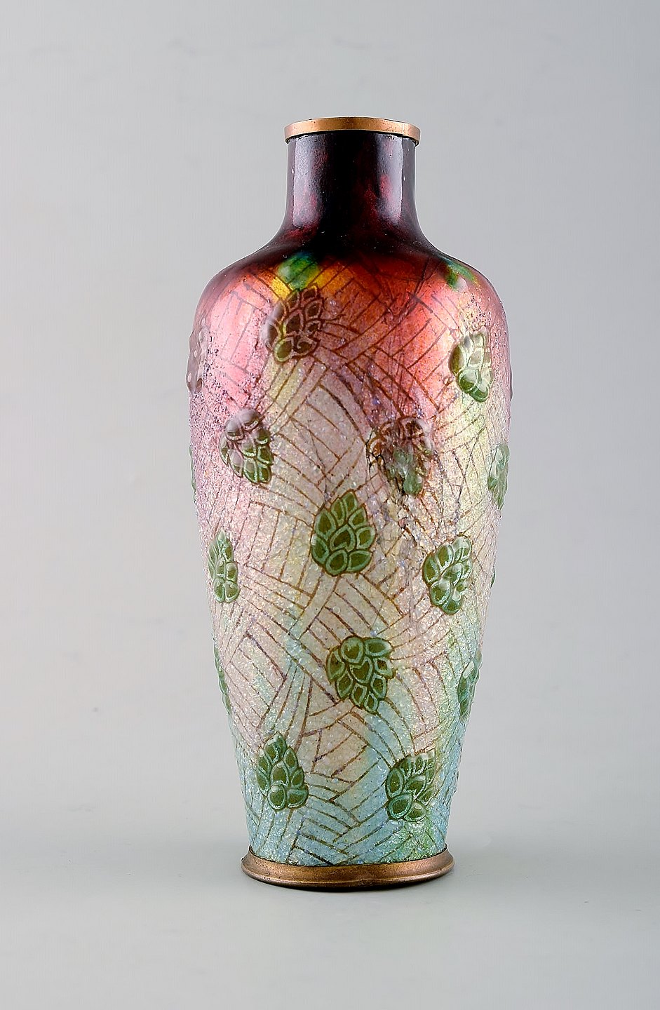 Alexandre Marty for Limoges, Frankrig. Art nouveau bronzevase i emaljearbejde. Grønne blade på rød baggrund. Ca. 1910.