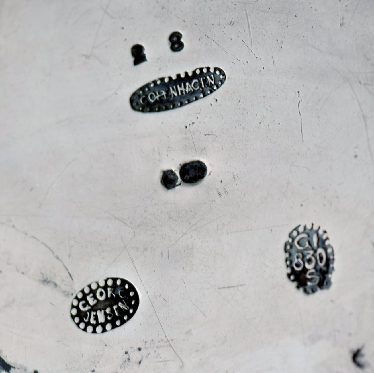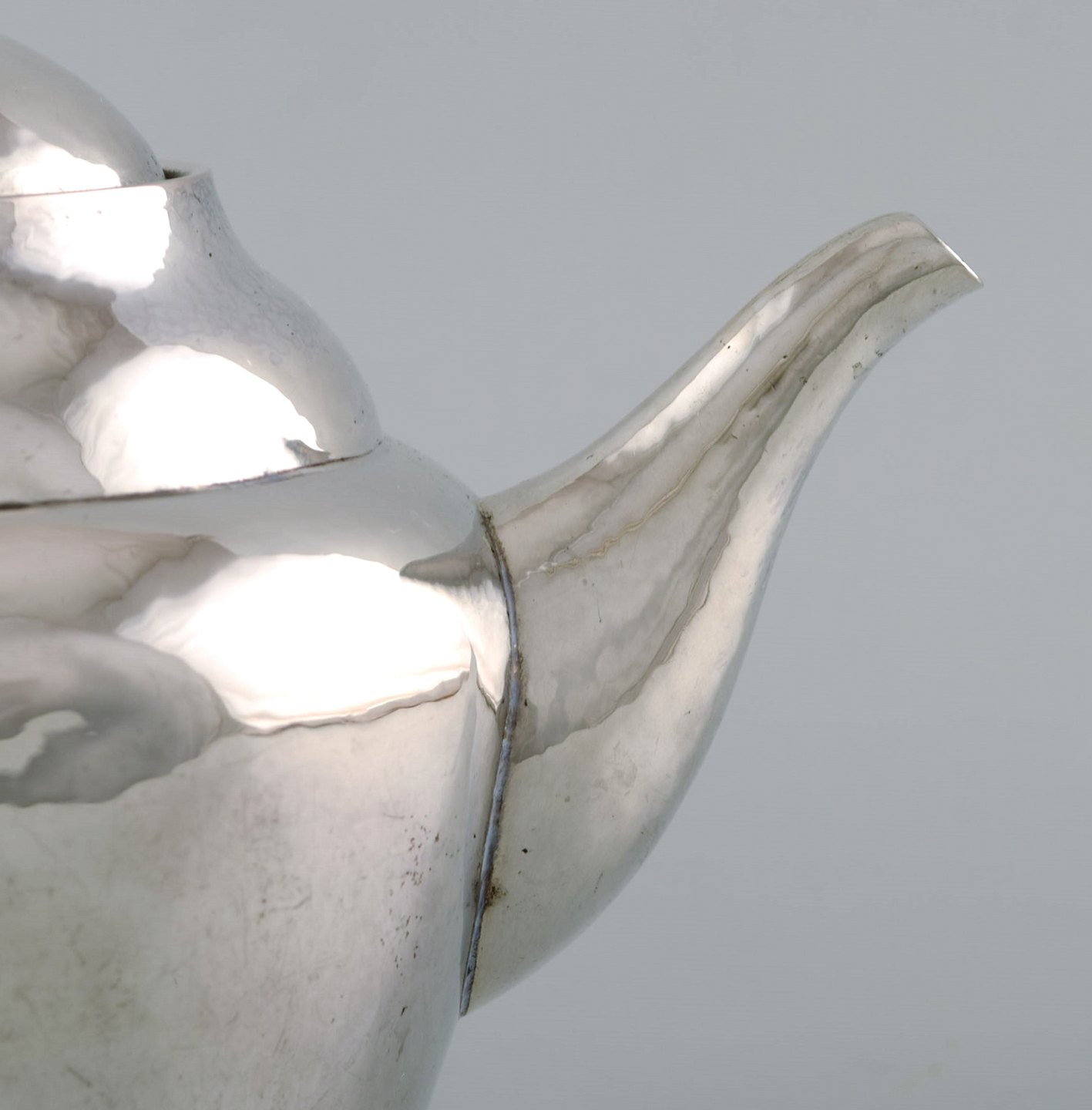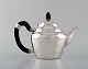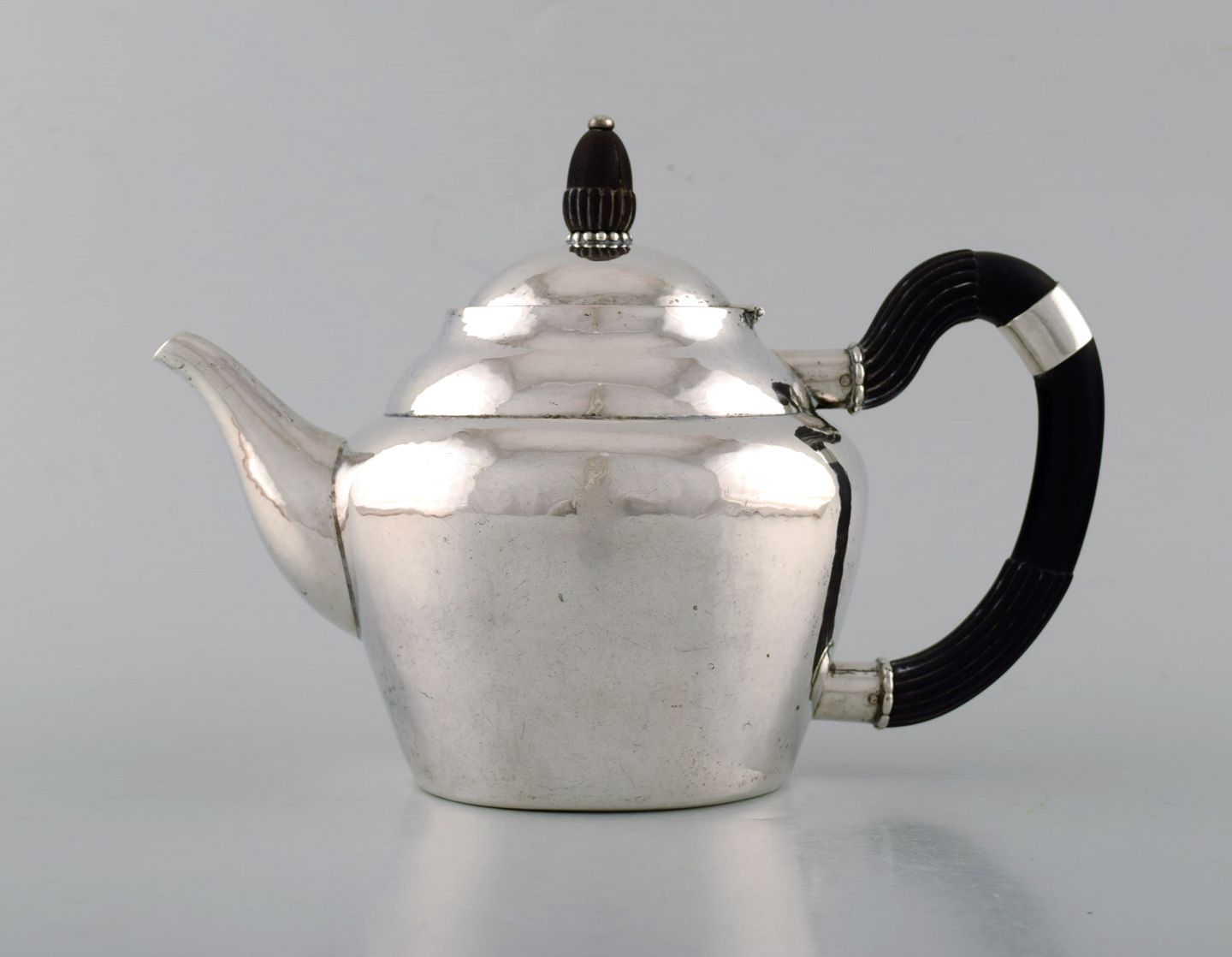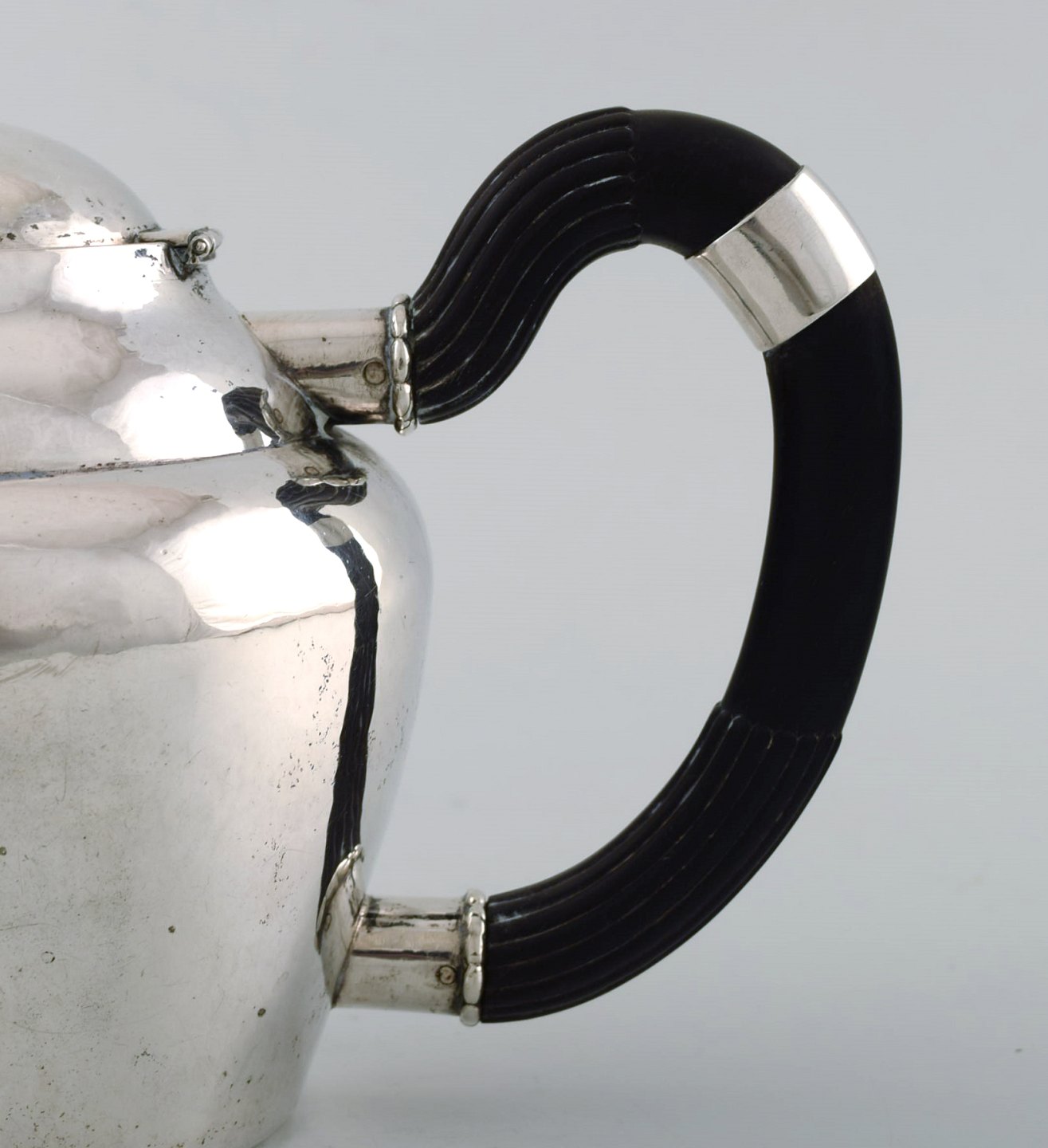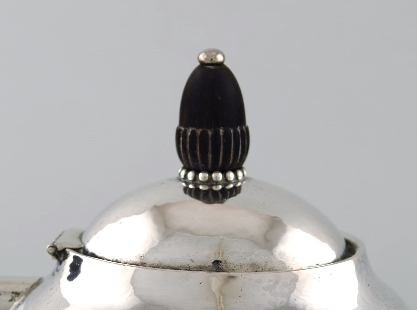 Tidlig og sjælden Georg Jensen tekande i hammerslået sølv med hank i ibenholt. Design nummer 28. Dateret 1915-30. Måler: 23,5 x 16 cm. Stemplet. I flot stand.
