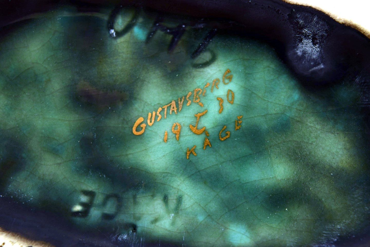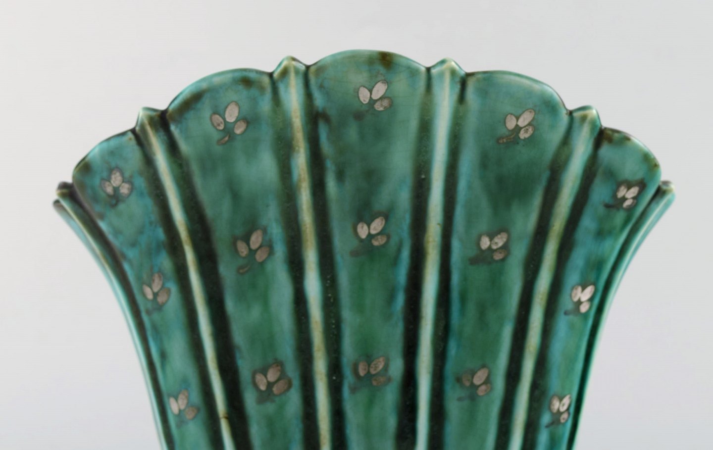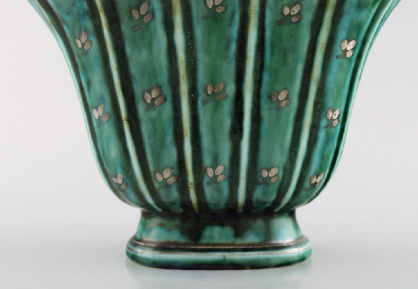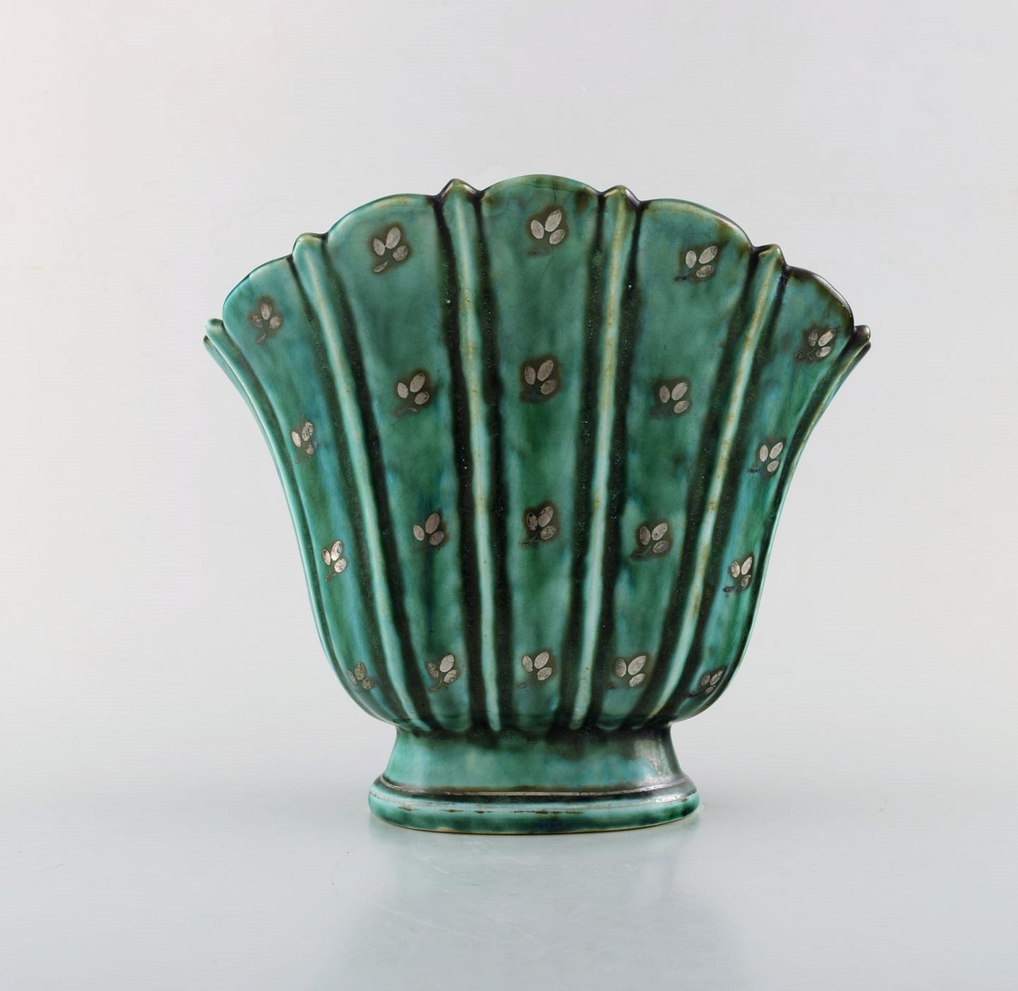 Wilhelm Kåge for Gustavsberg. Argenta vase i keramik dekoreret med blade i sølvindlæg. Dateret 1930. Måler: 20 x 18,5 cm. Stemplet: Gustavsberg, Kåge. I perfekt stand.