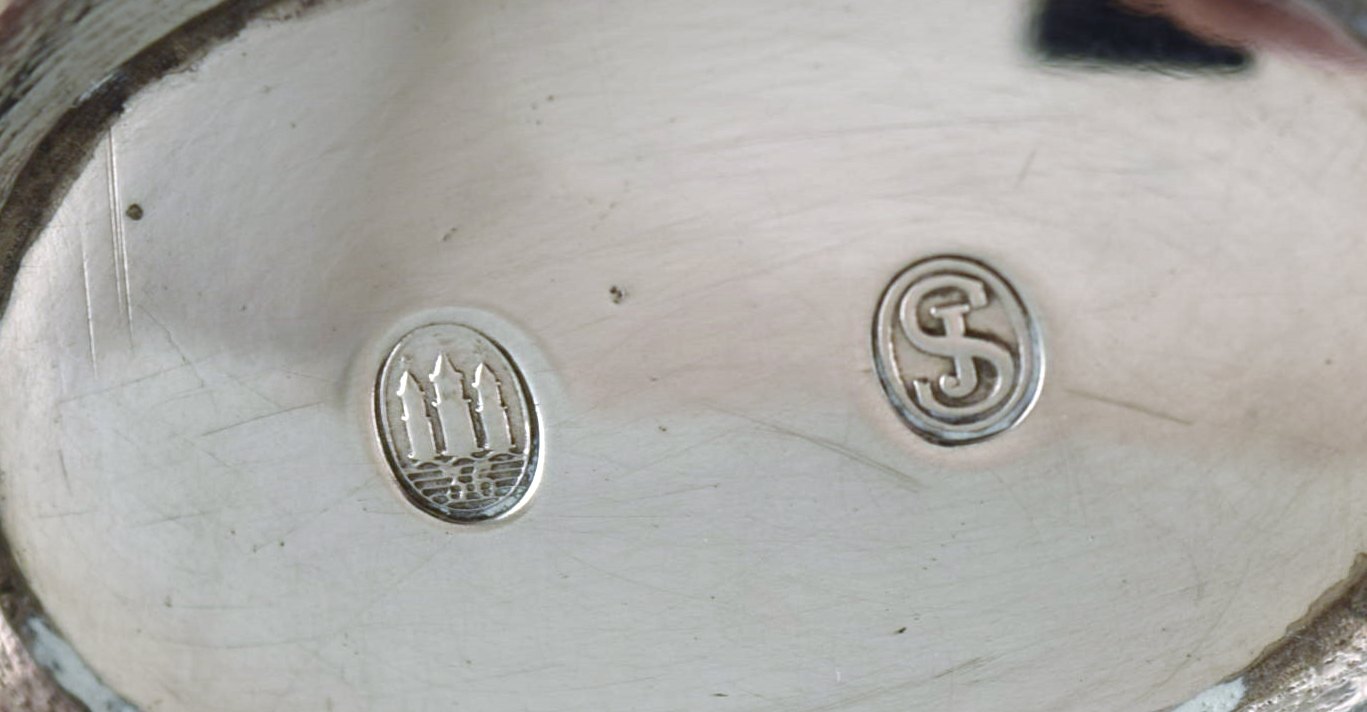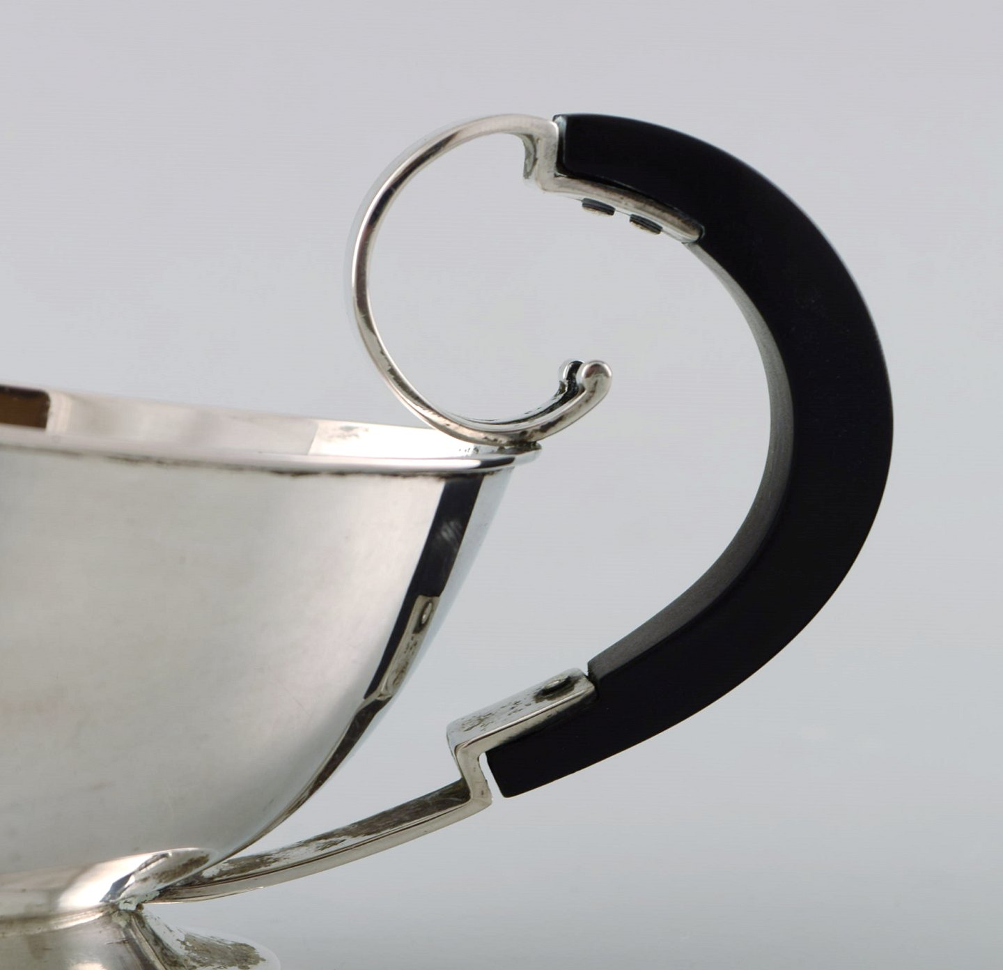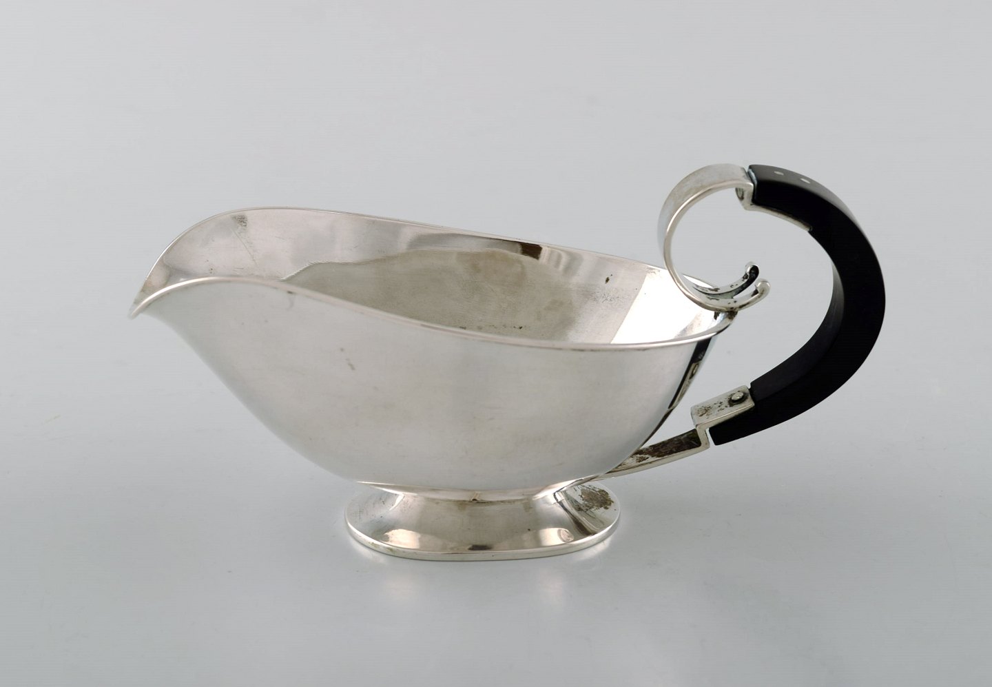 Dansk sølvsmed. Art deco sovsekande i tretårnet sølv med hank i ibenholt. Dateret 1936. Måler: 15,5 x 7,5 cm. Stemplet. I flot stand.
