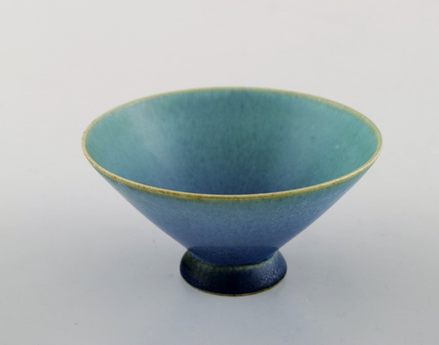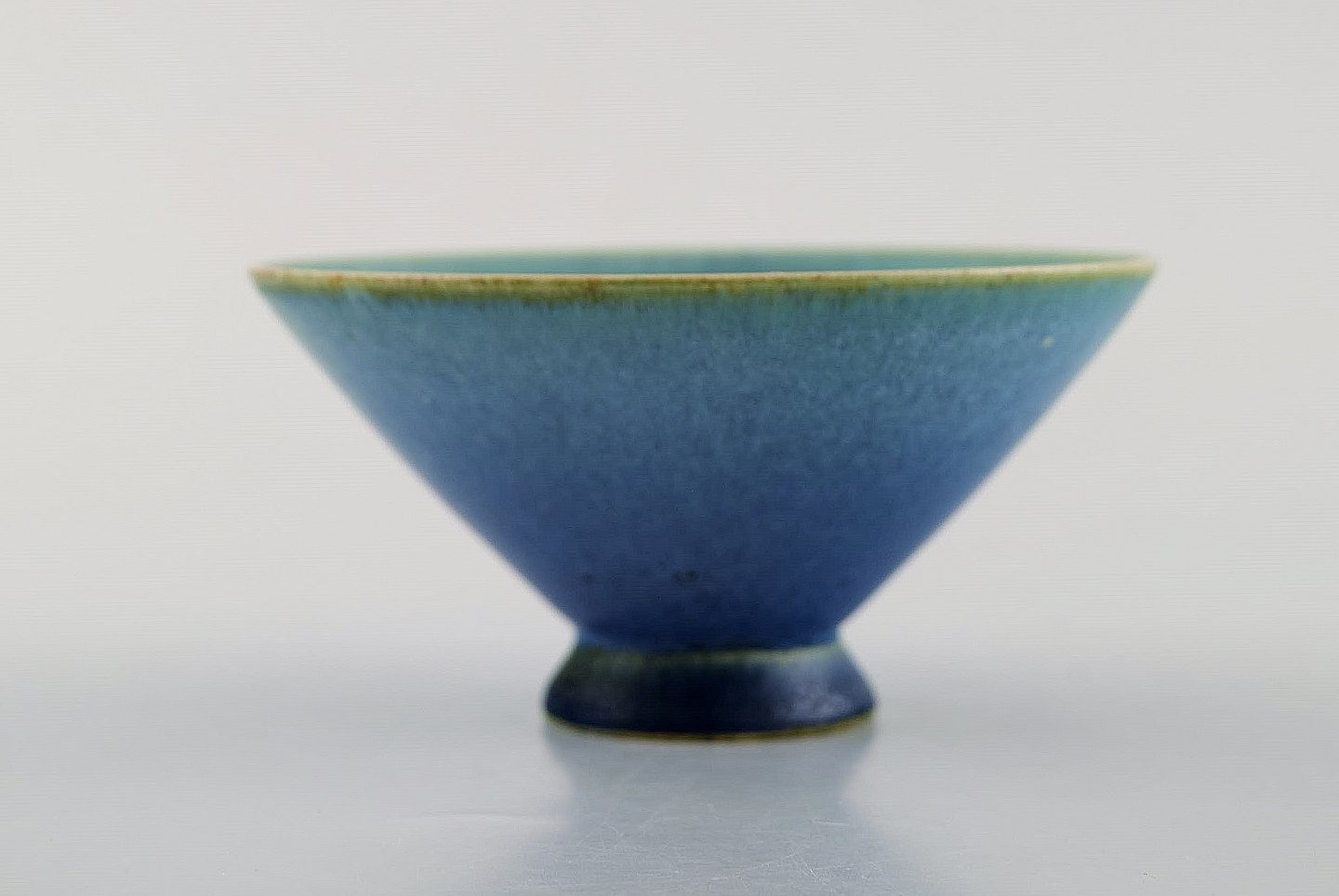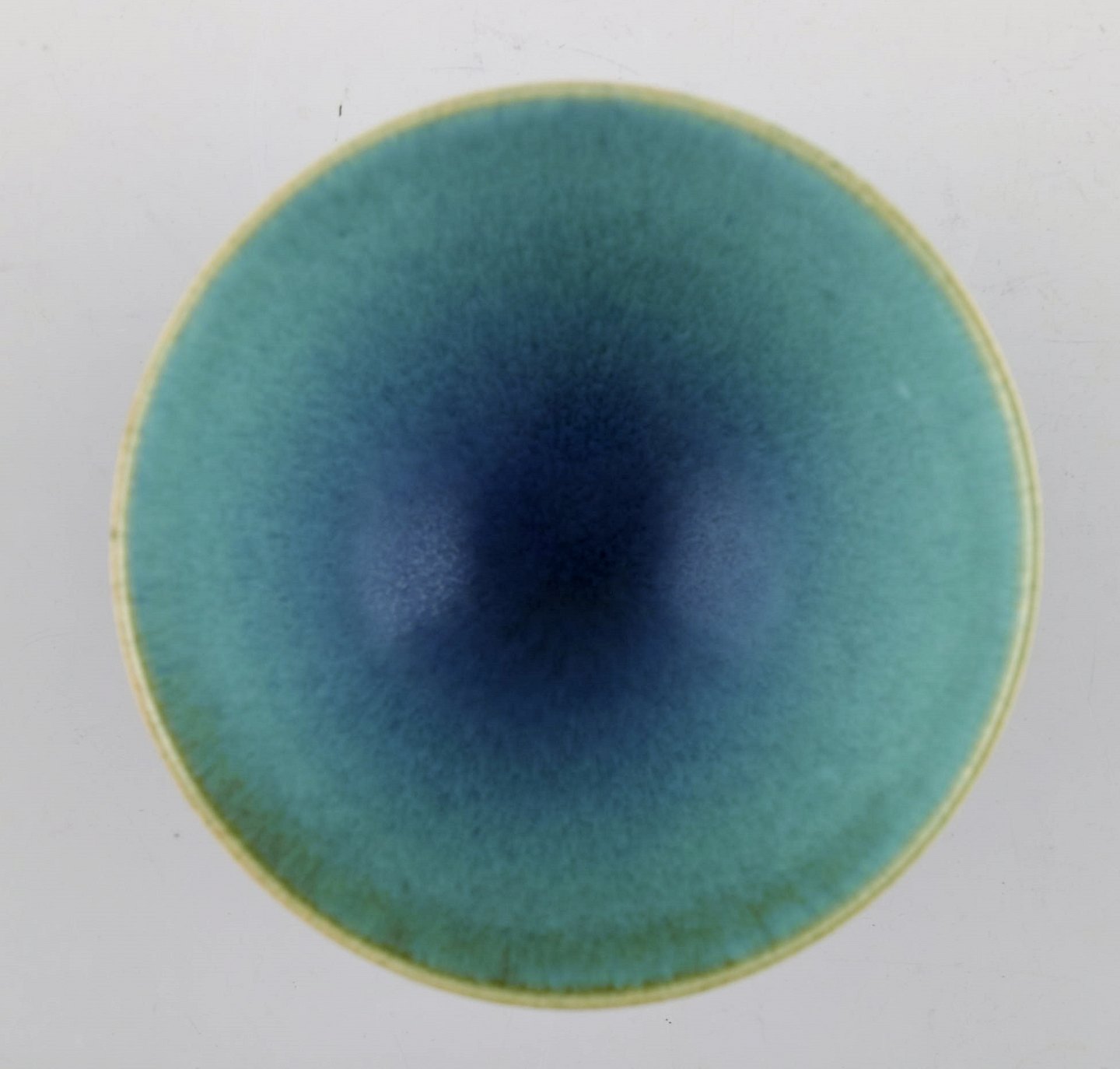 Sven Wejsfelt for Gustavsberg Studio Hand. Unika skål på fod i glaseret keramik. Dateret 2005. Smuk glasur i blå nuancer. Signeret. I flot stand. Måler 10 x 5 cm.