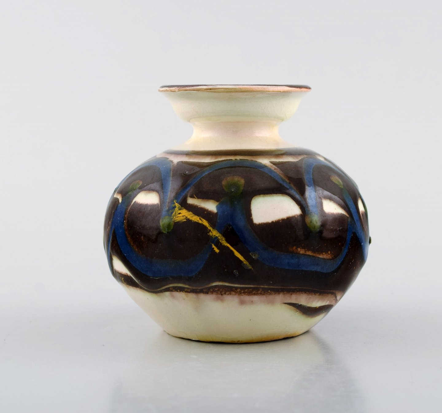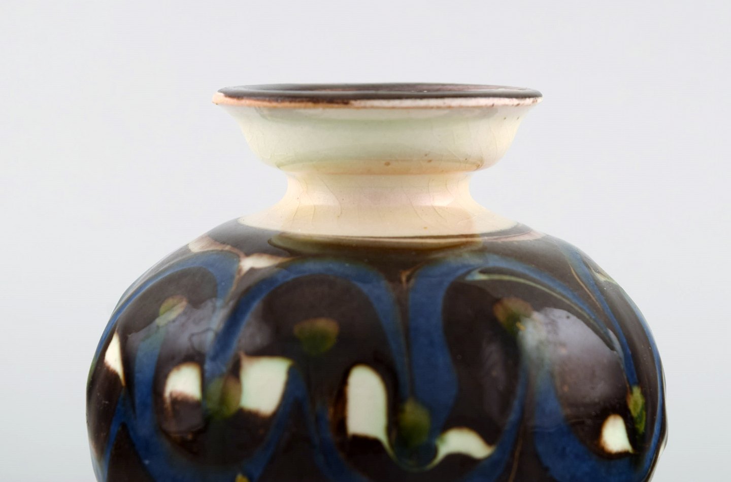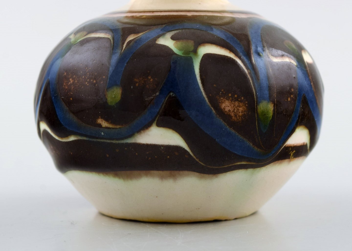 Kähler, HAK, glaseret stentøjsvase i moderne design. 1930/40´erne. Kohornsteknik. Smuk glasur i blå og brune nuancer. Stemplet. Måler: 9 x 8,3 cm. I flot stand.