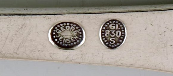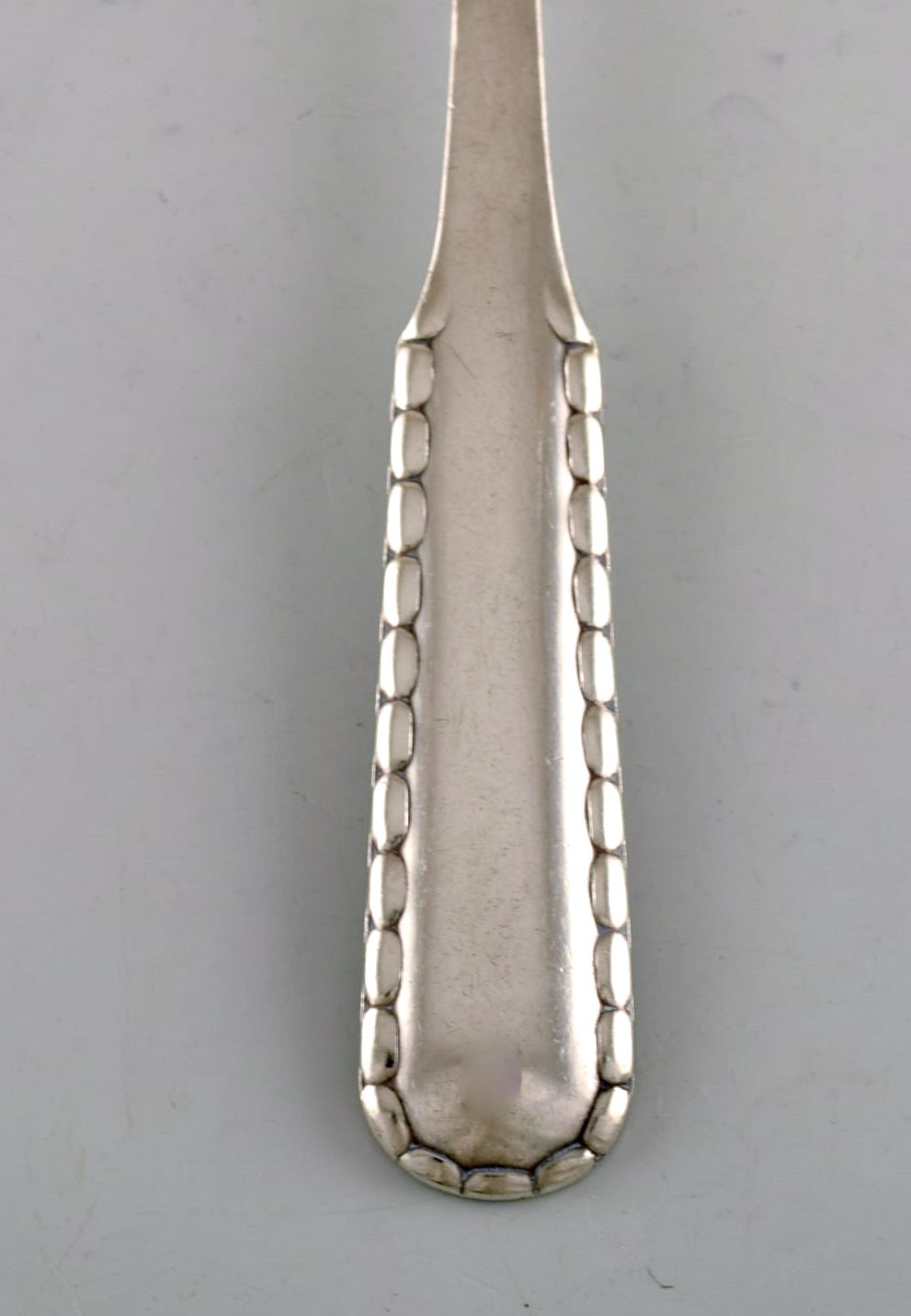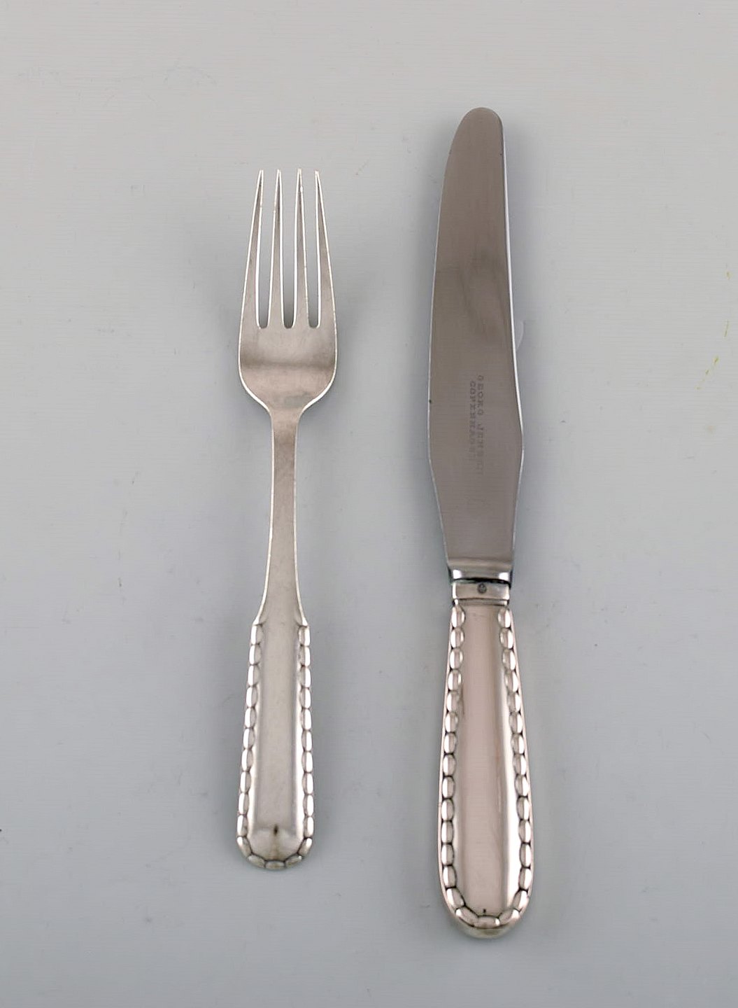 Georg Jensen "Perle" bestik. Seks personers middagsservice i sølv. Dateret 1915-1930. Bestående af seks middagsknive og seks middagsgafler. Kniven måler: 24 cm. I flot stand. Tidligt stempel. 1915-1930