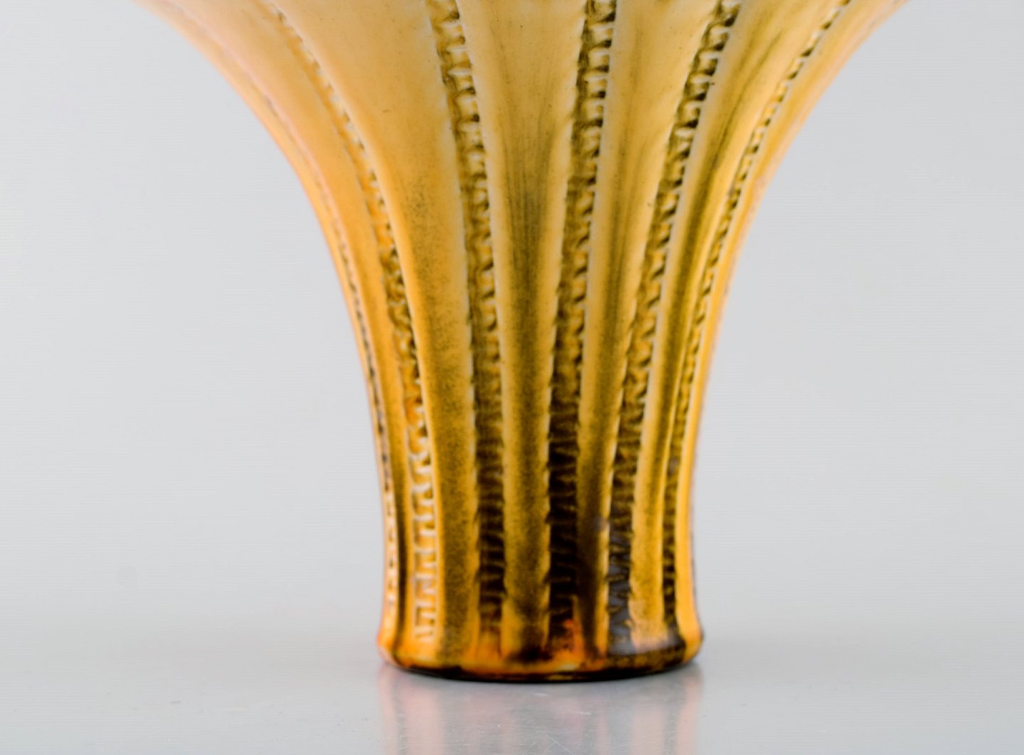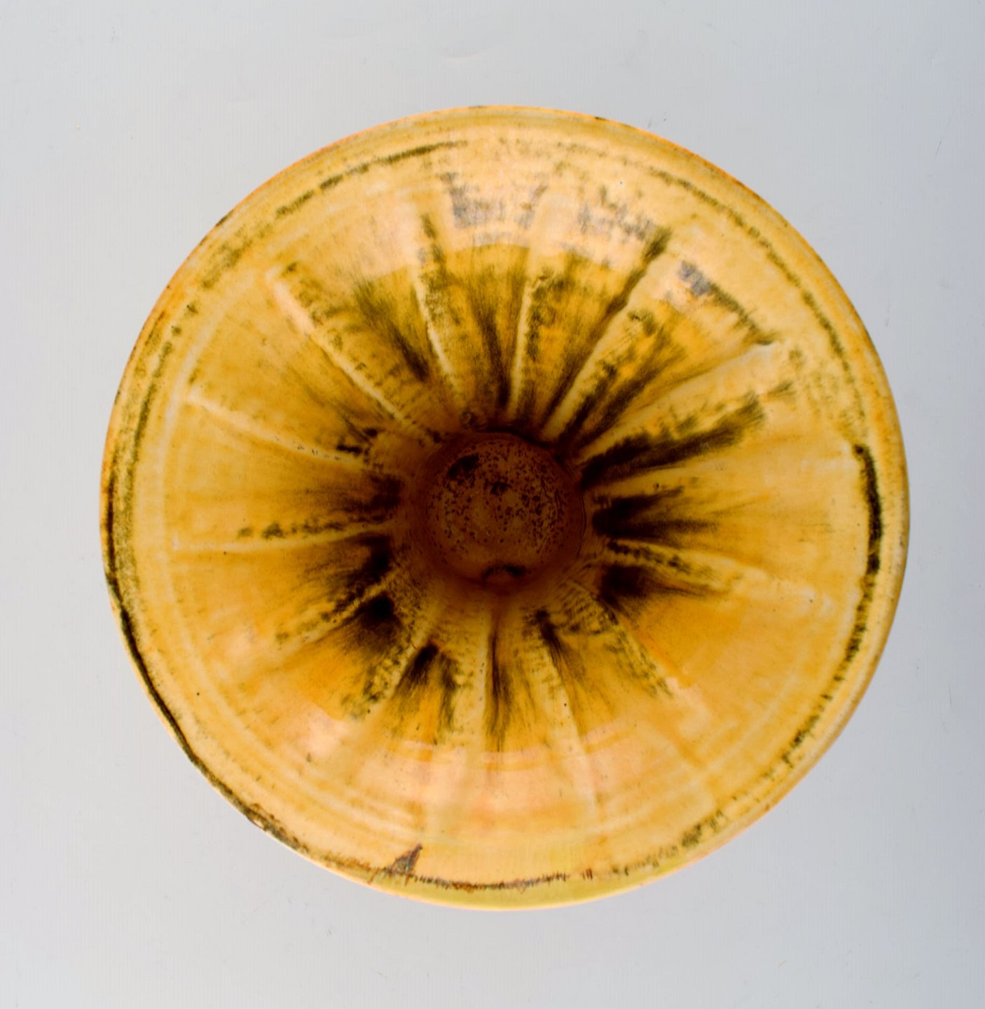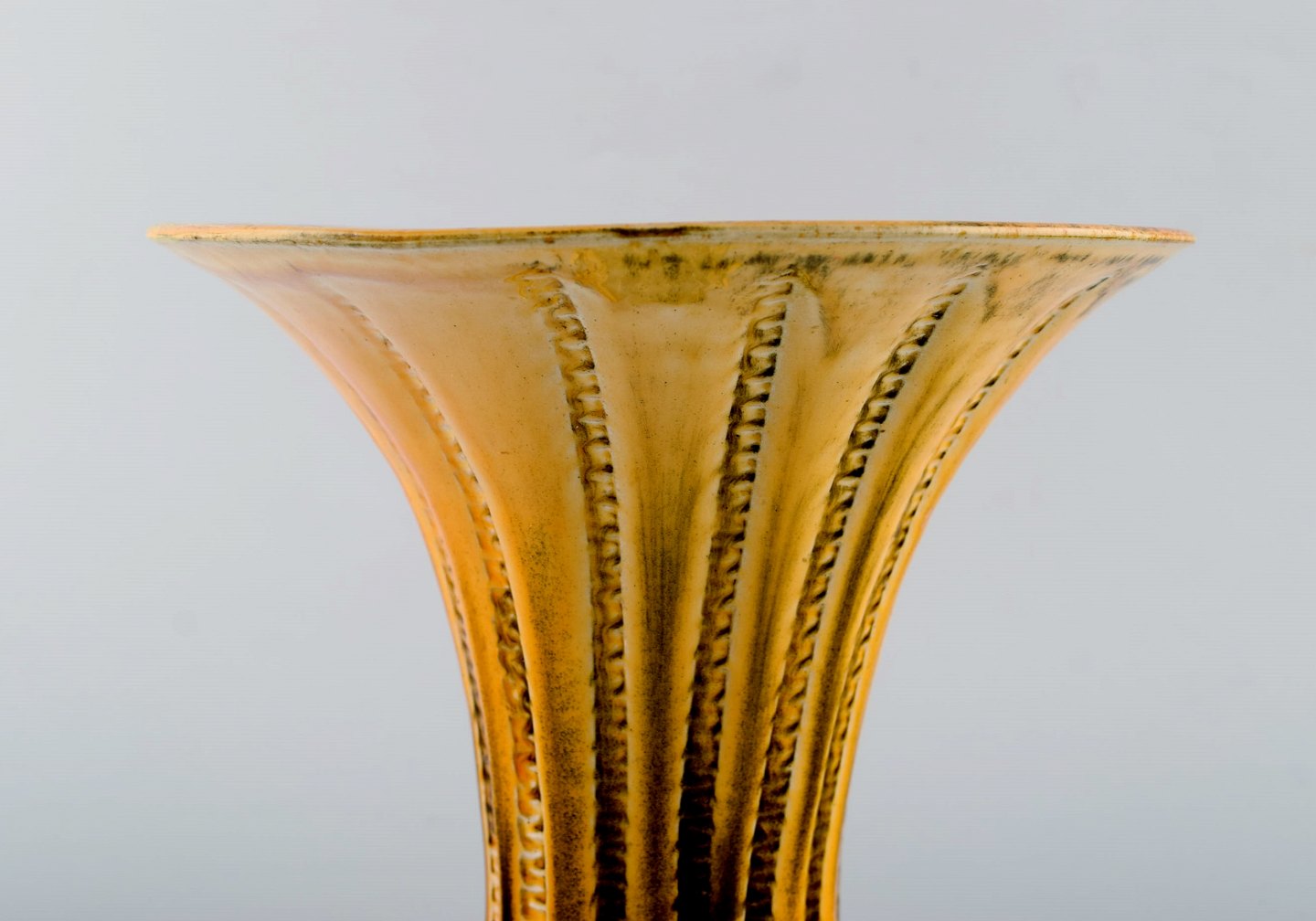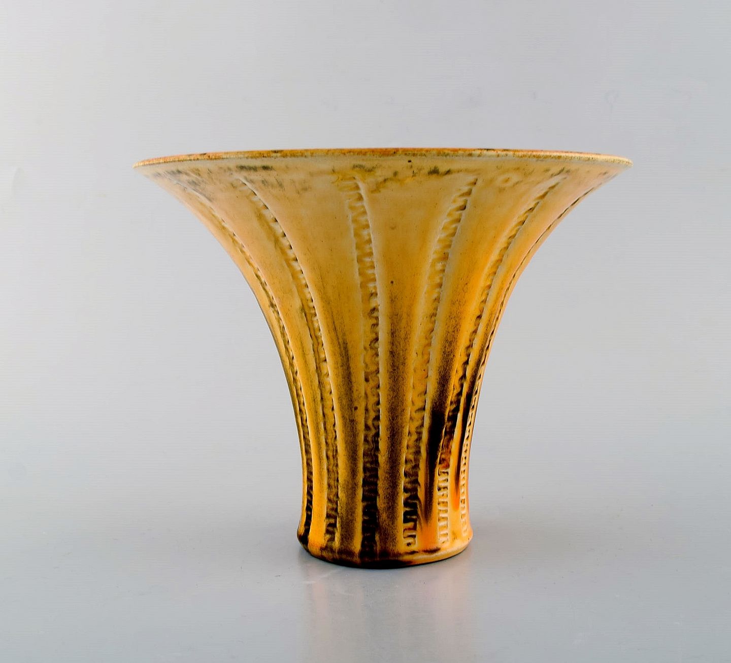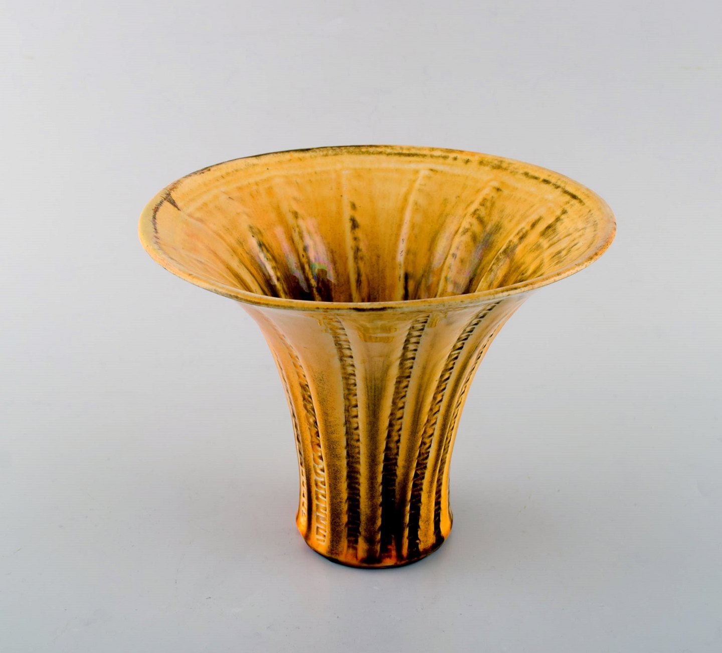Svend Hammershøi for Kähler, HAK. Vase i glaseret stentøj. Smuk gul uranglasur. 1930/40'erne. Stemplet. I flot stand. Måler: 20 x 16 cm.