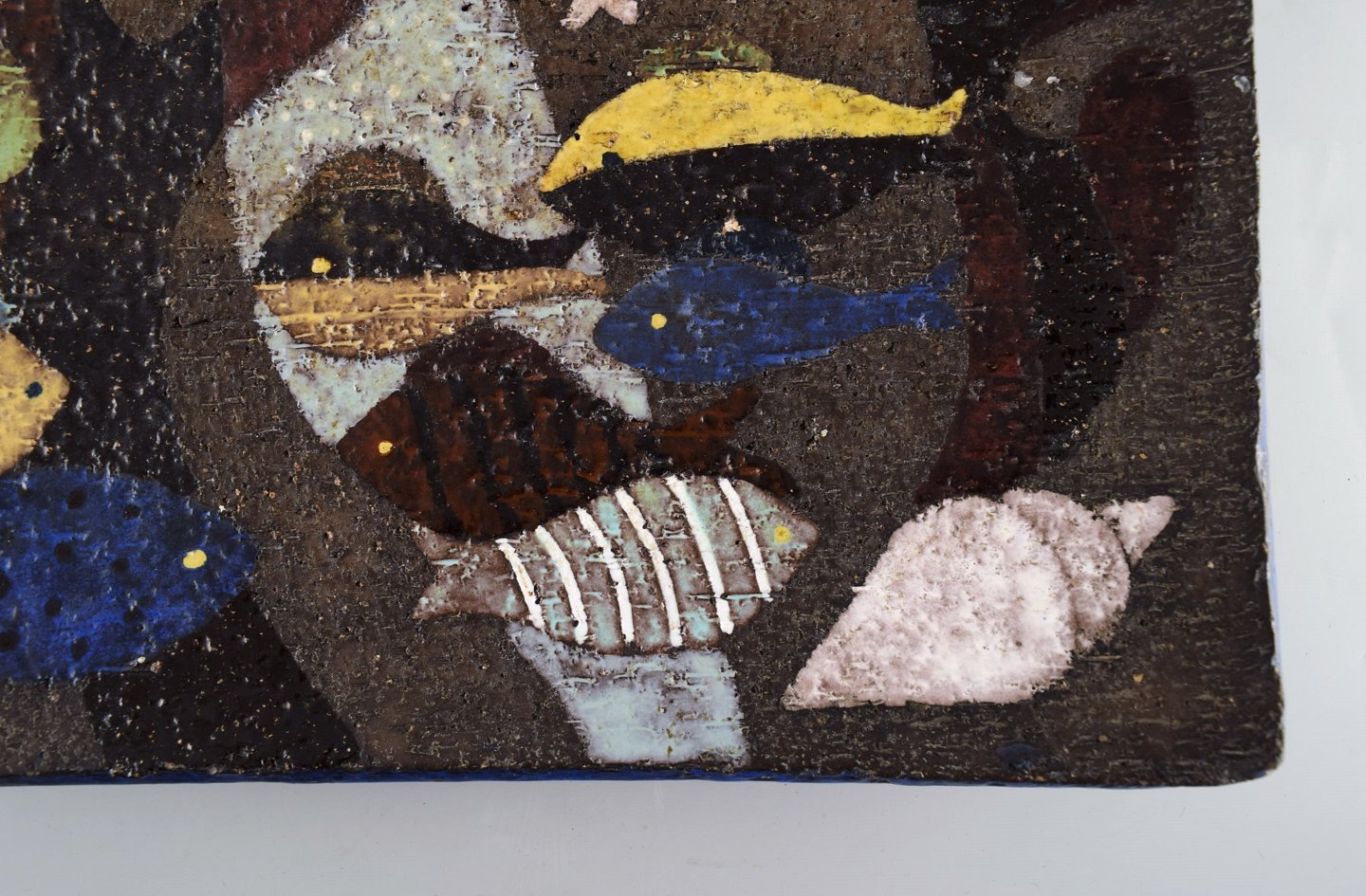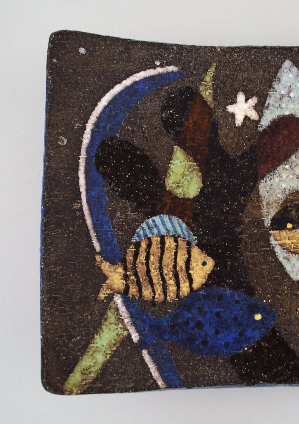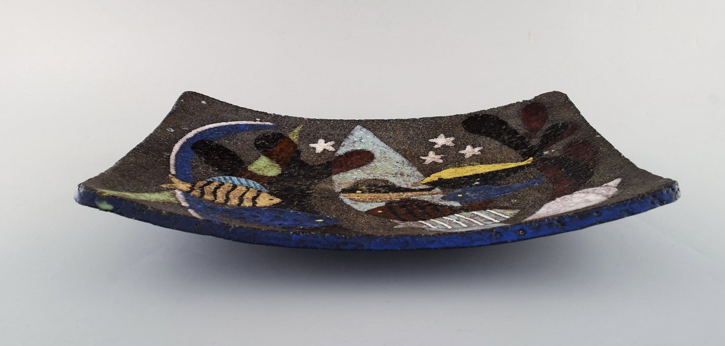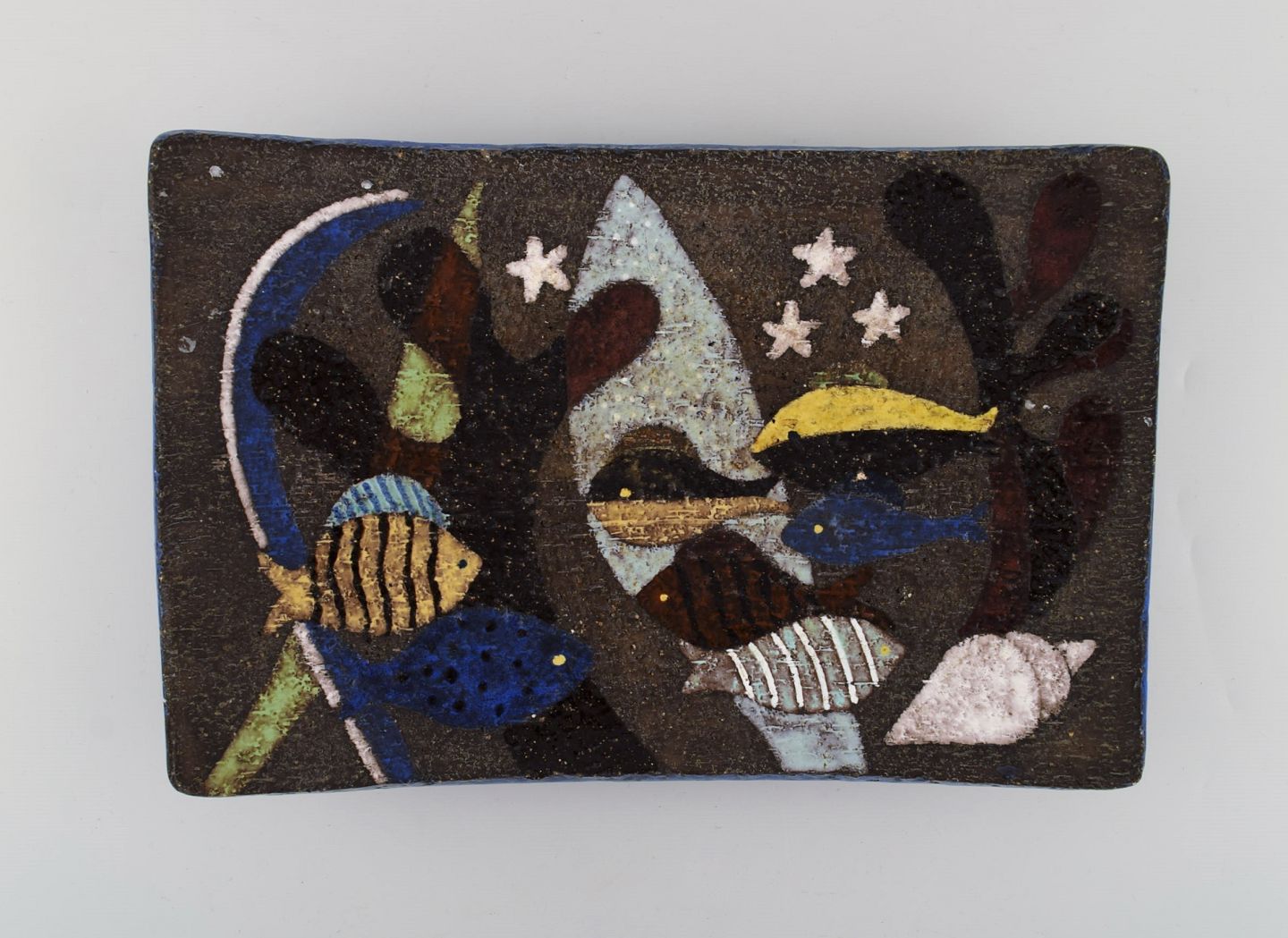 Anna-Lisa Thomson for Upsala-Ekeby. Stort "Spectra" fad i glaseret stentøj dekoreret med fisk. 1960'erne. I flot stand. Måler: 37 x 23 x 6,5 cm. Stemplet.