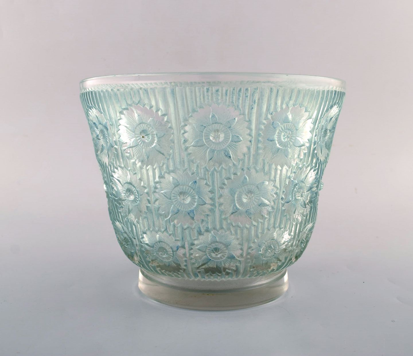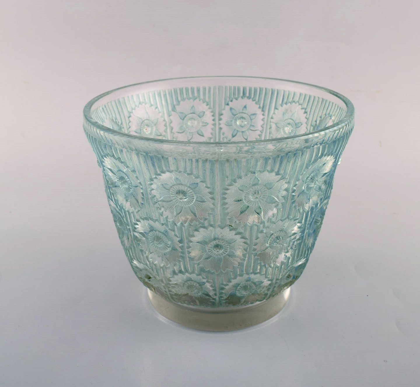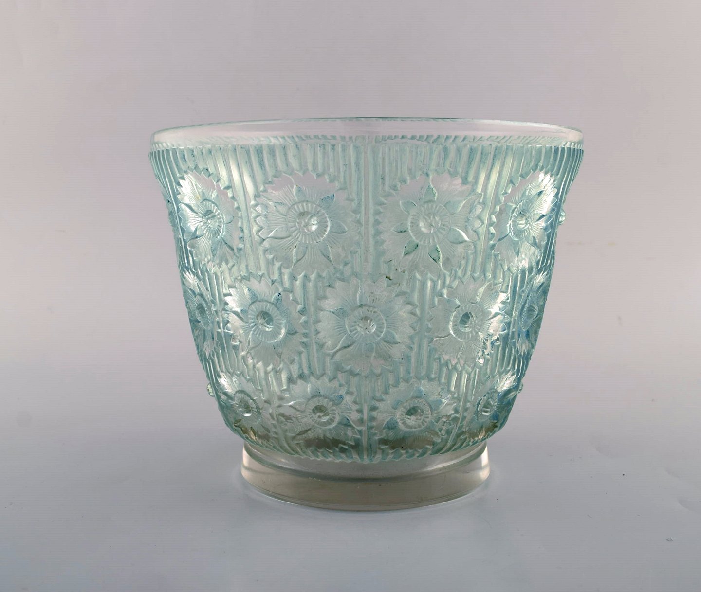 Tidlig René Lalique. Stor "Edelweiss" skål i turkis kunstglas dekoreret med blomster. Dateret 1937. Stemplet: R. Lalique. I flot stand. Måler: 19,5 x 15,5 cm.