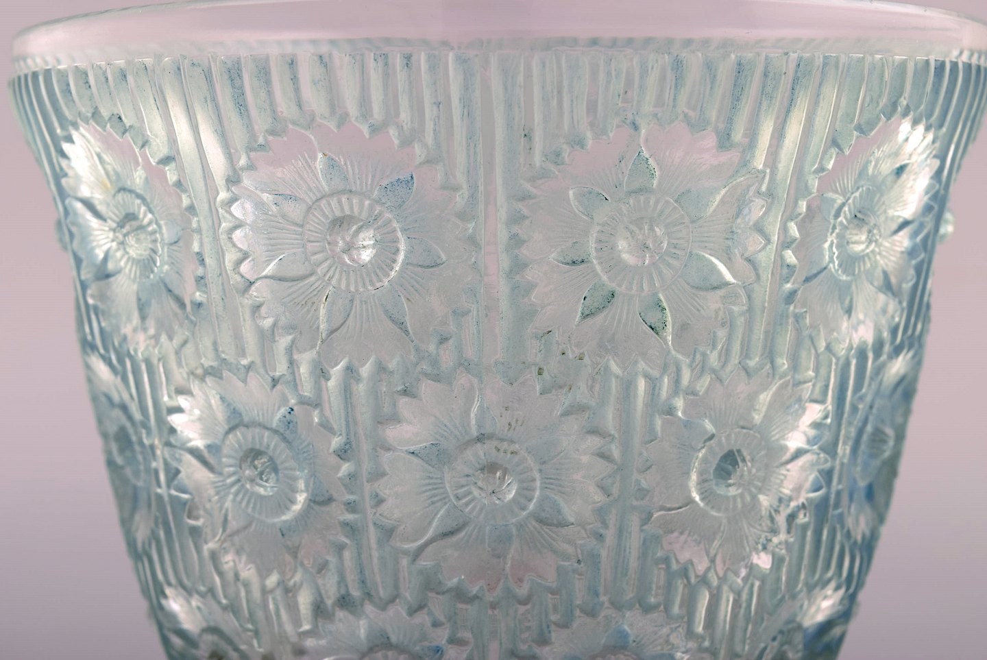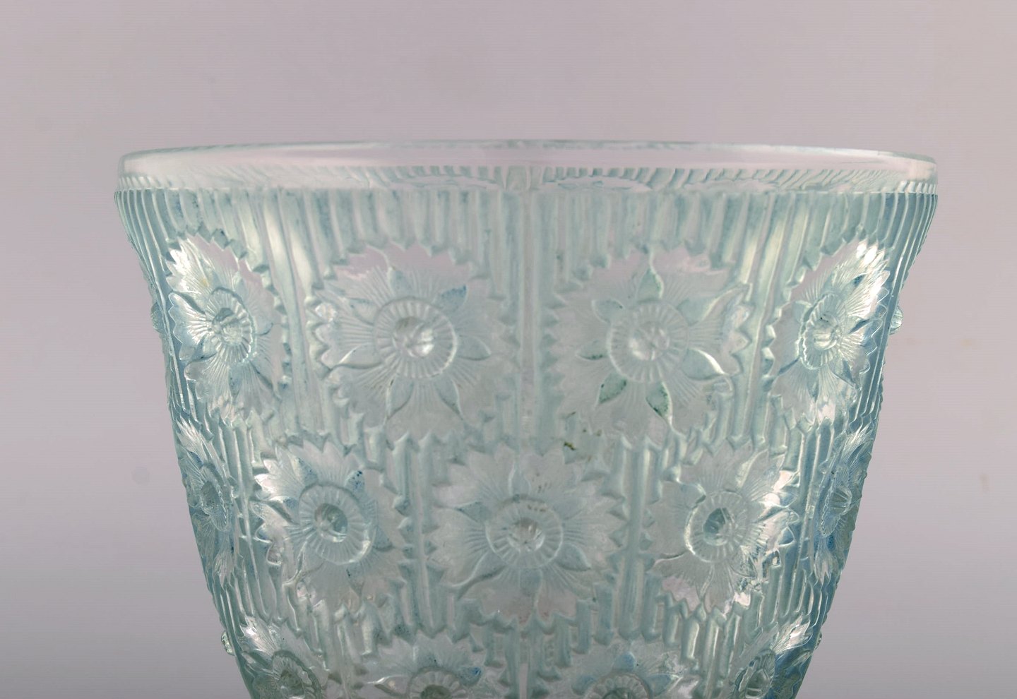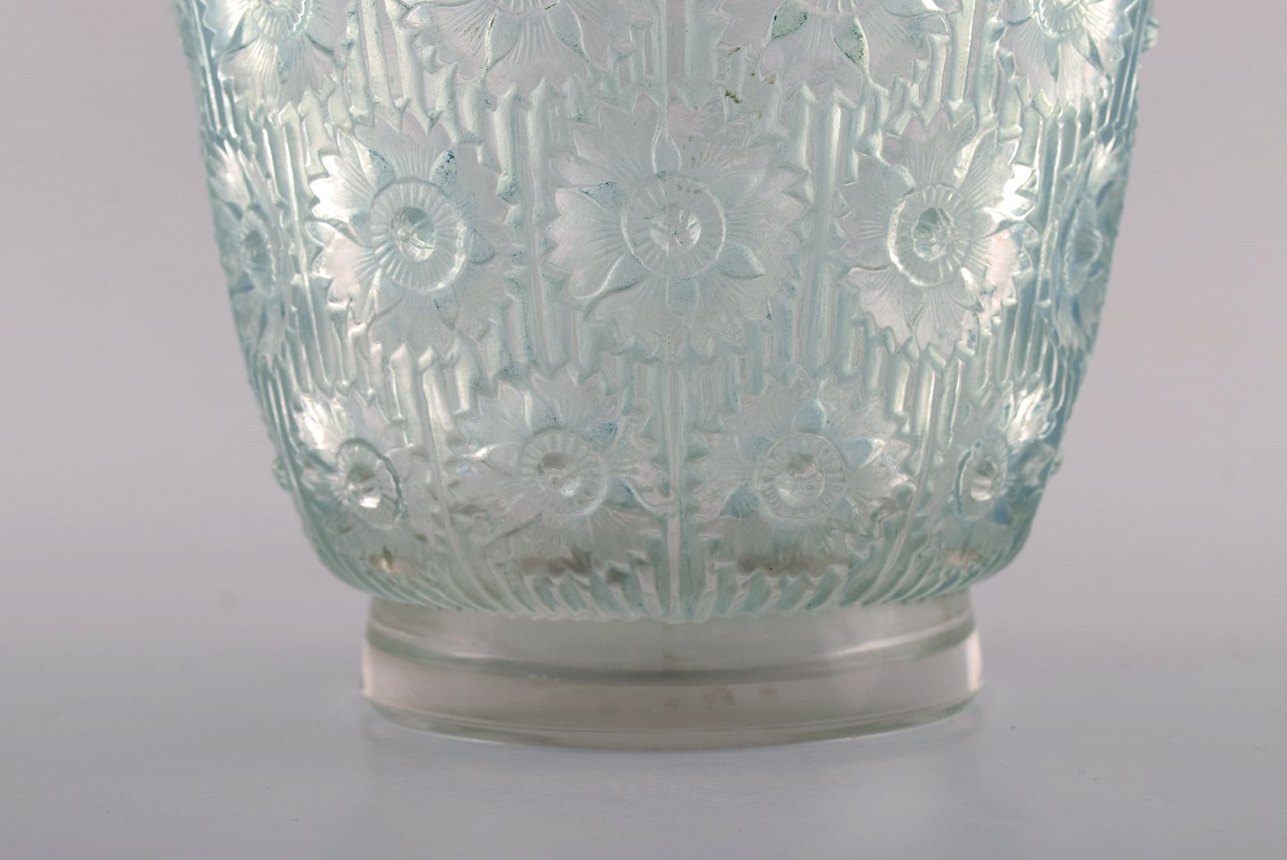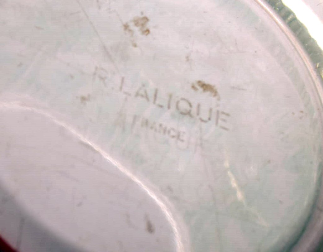 Tidlig René Lalique. Stor "Edelweiss" skål i turkis kunstglas dekoreret med blomster. Dateret 1937. Stemplet: R. Lalique. I flot stand. Måler: 19,5 x 15,5 cm.