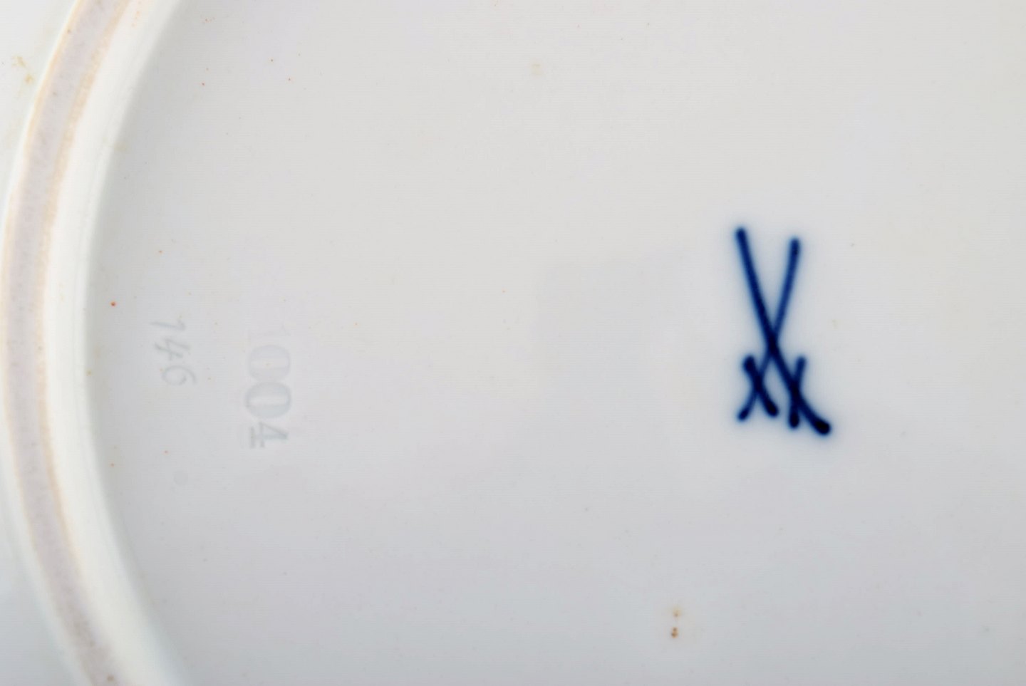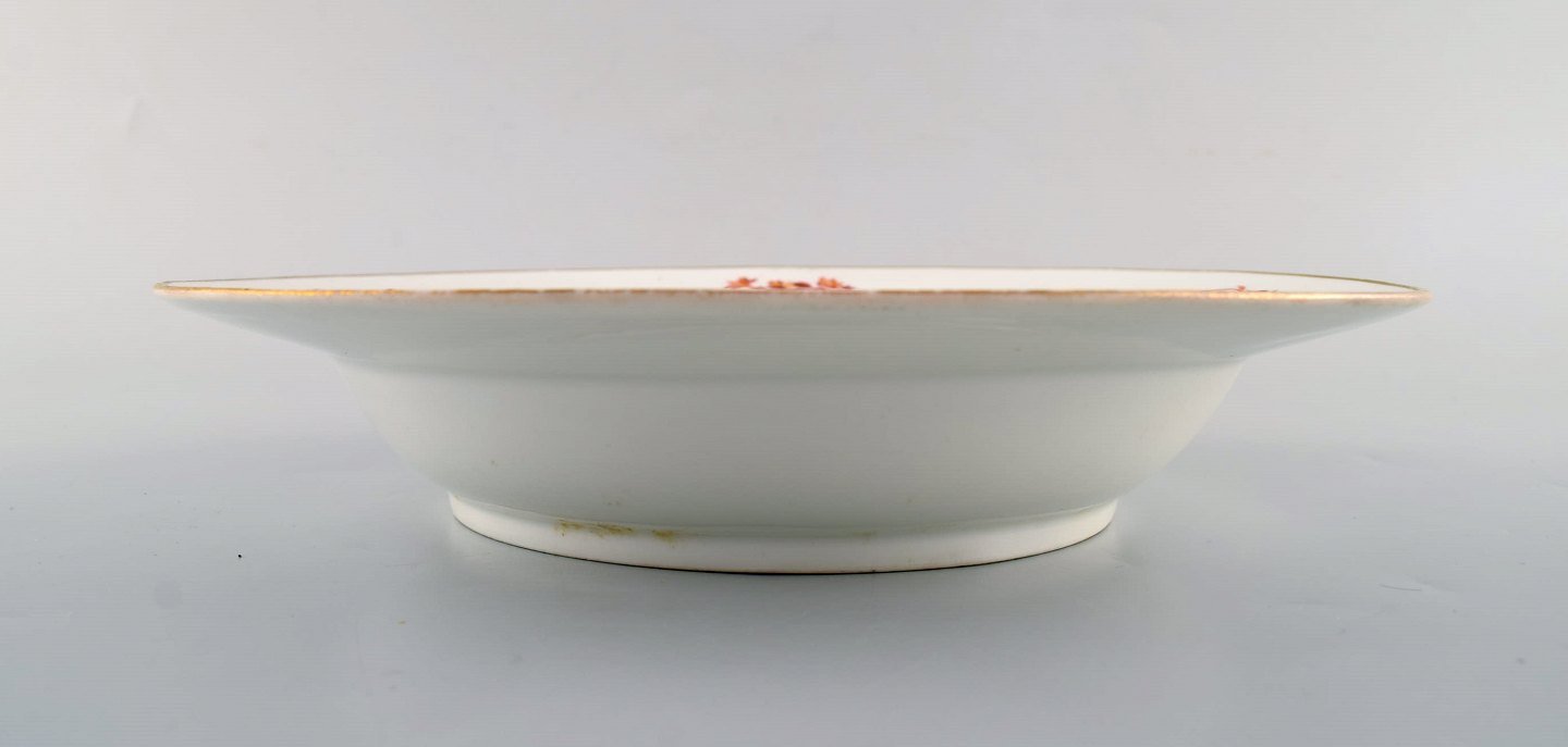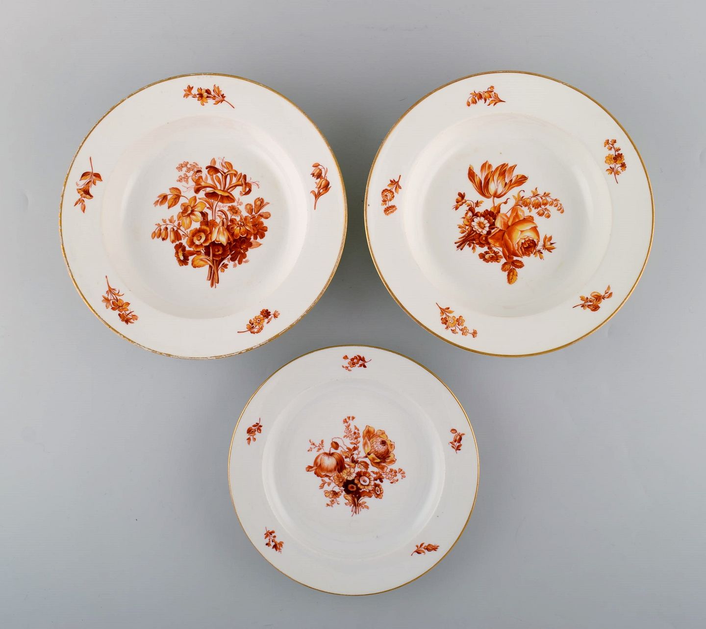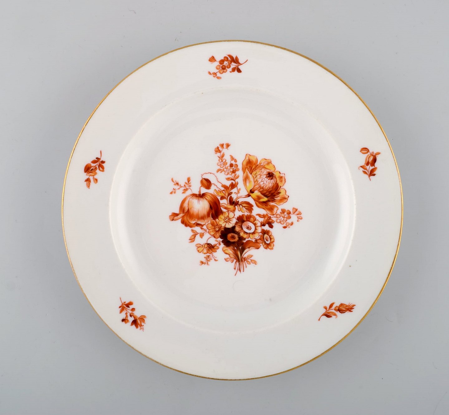 Tre antikke Meissen tallerkener i porcelæn med orange håndmalede blomster. To dybe tallerkener samt frokosttallerken. 1800-tallet.