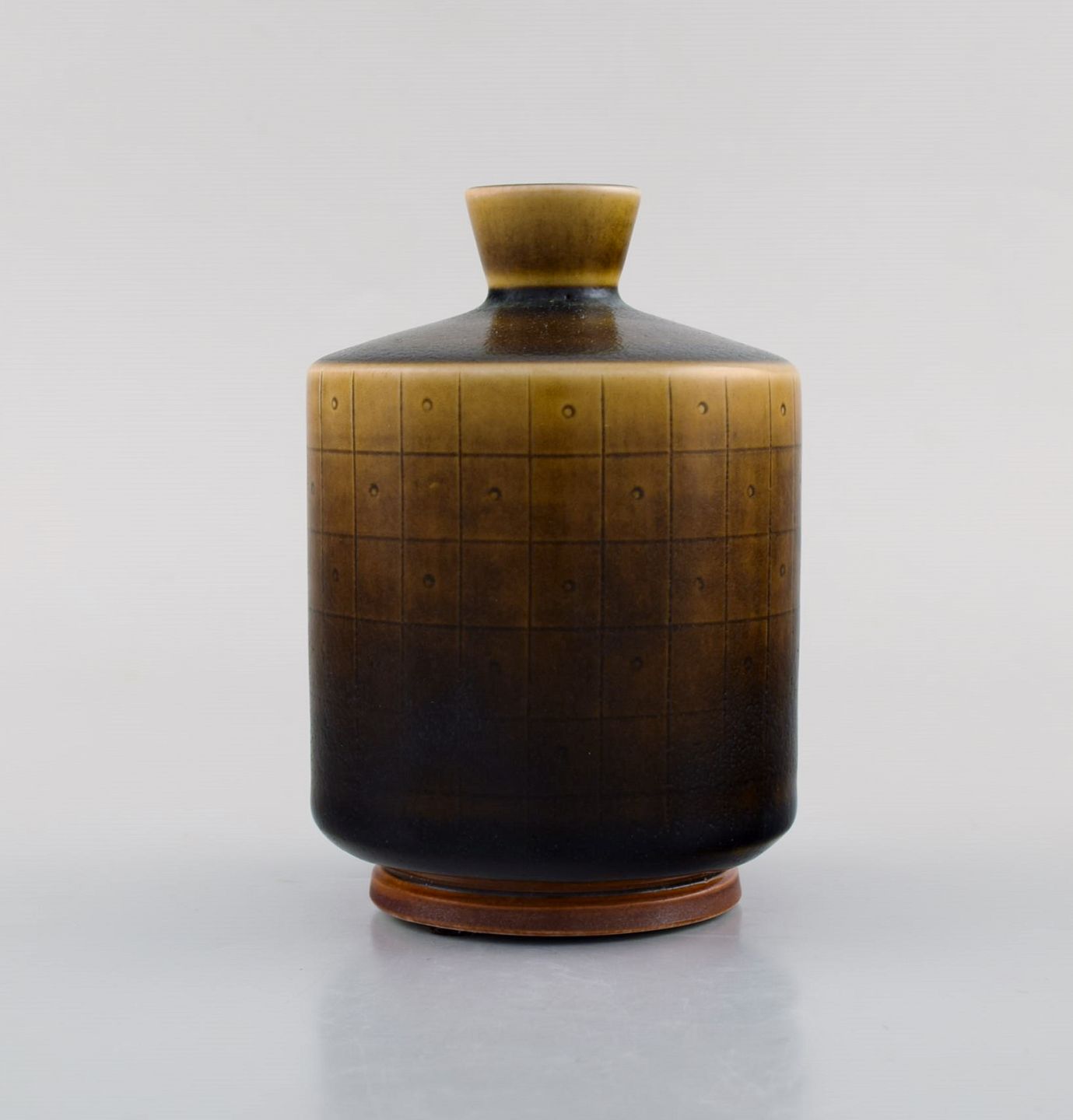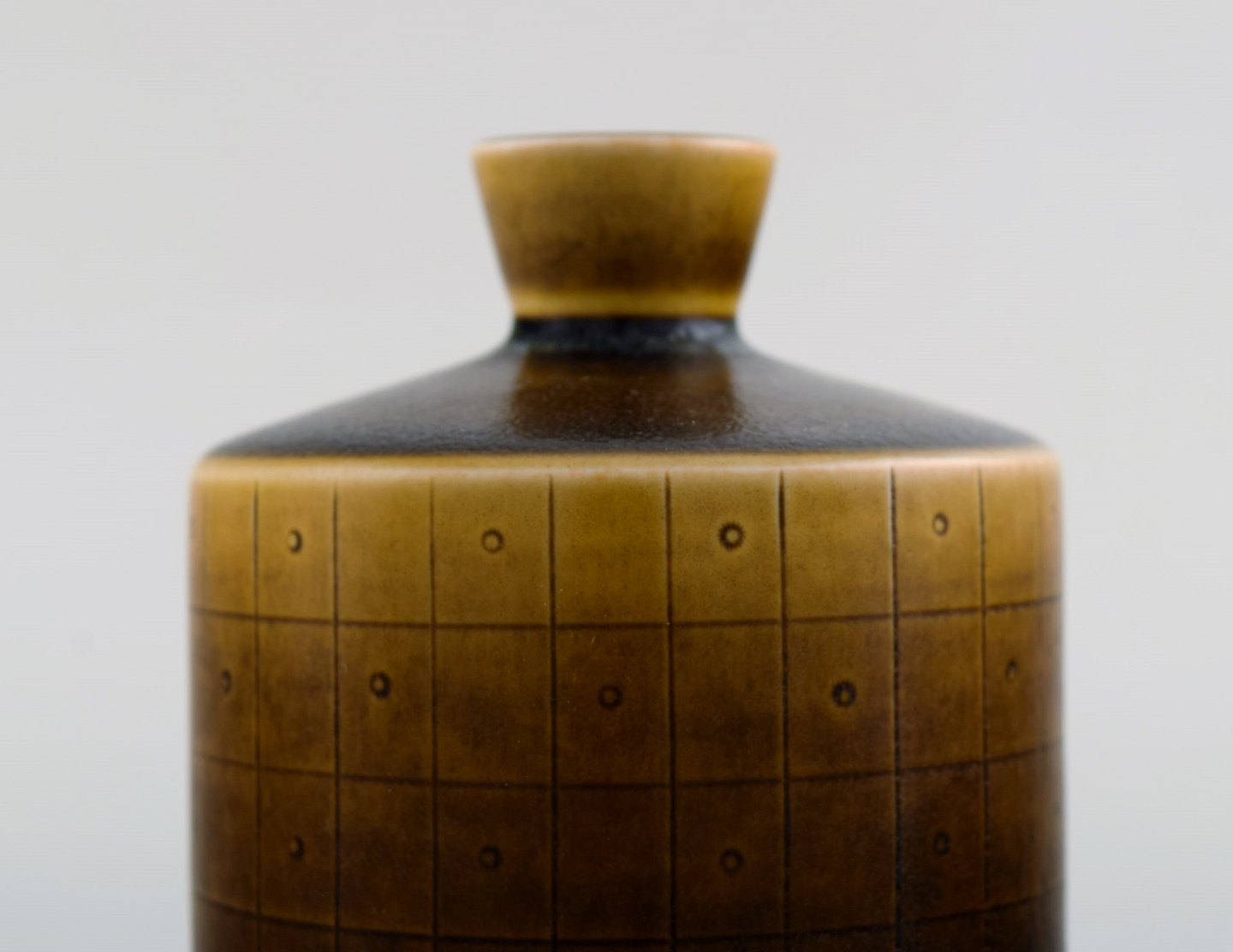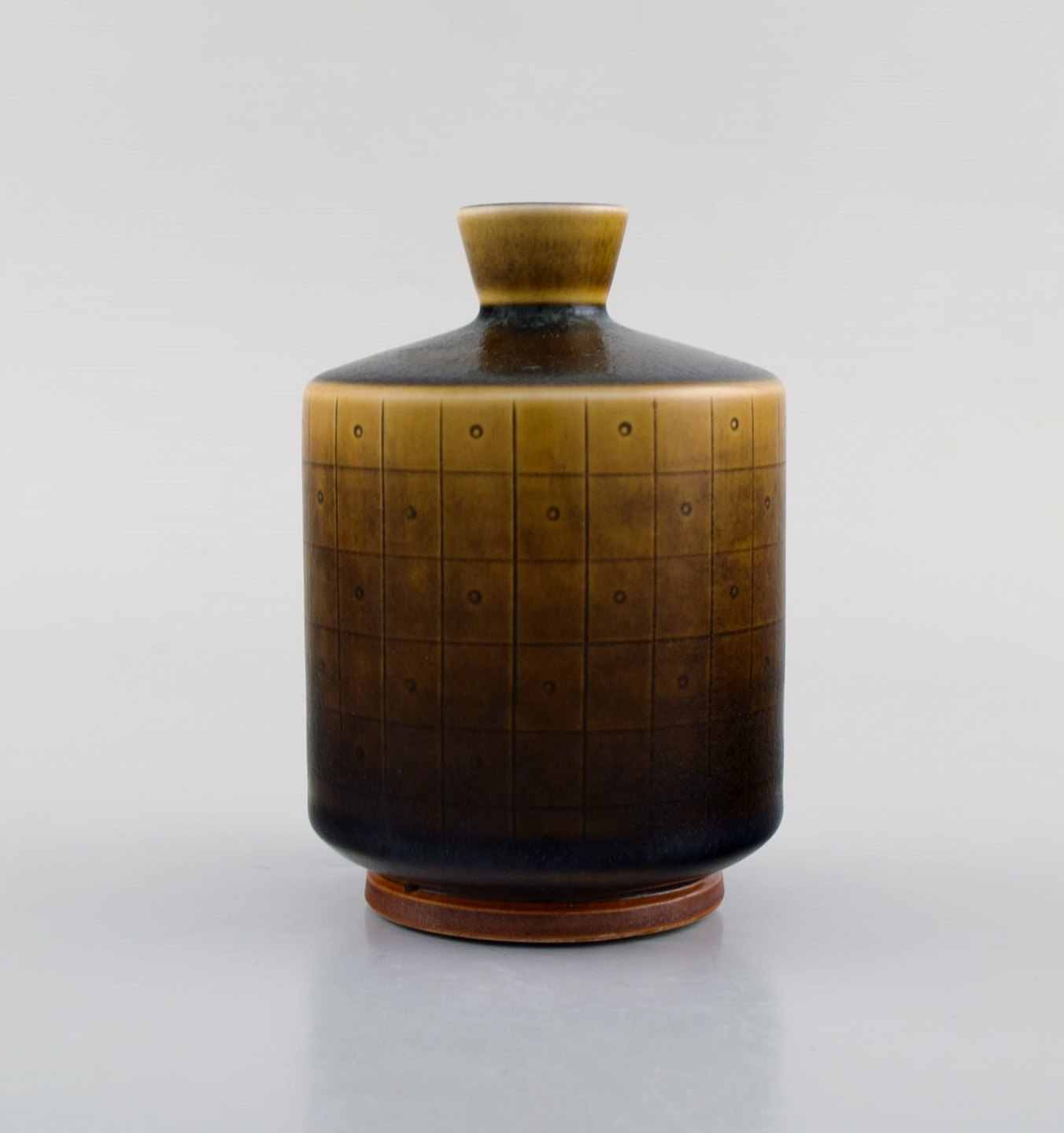 Berndt Friberg for Gustavsberg Studio Hand. Modernistisk vase i glaseret keramik med ternet design. Smuk glasur i lysebrune nuancer. Dateret 1962. Måler: 11,5 x 8 cm. I flot stand. Indridset signatur.