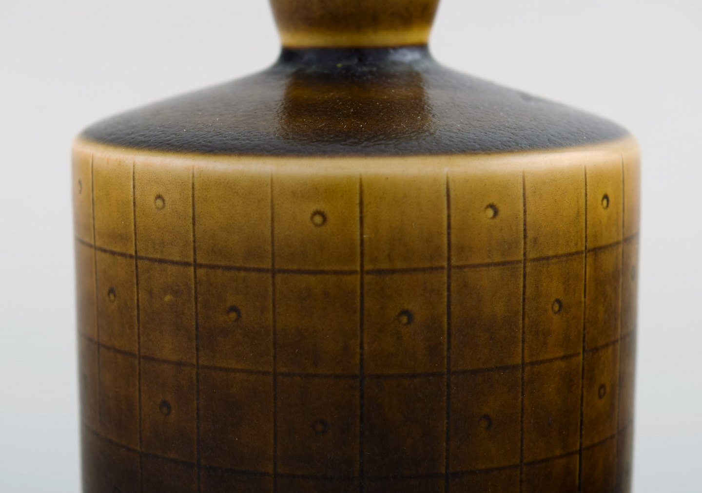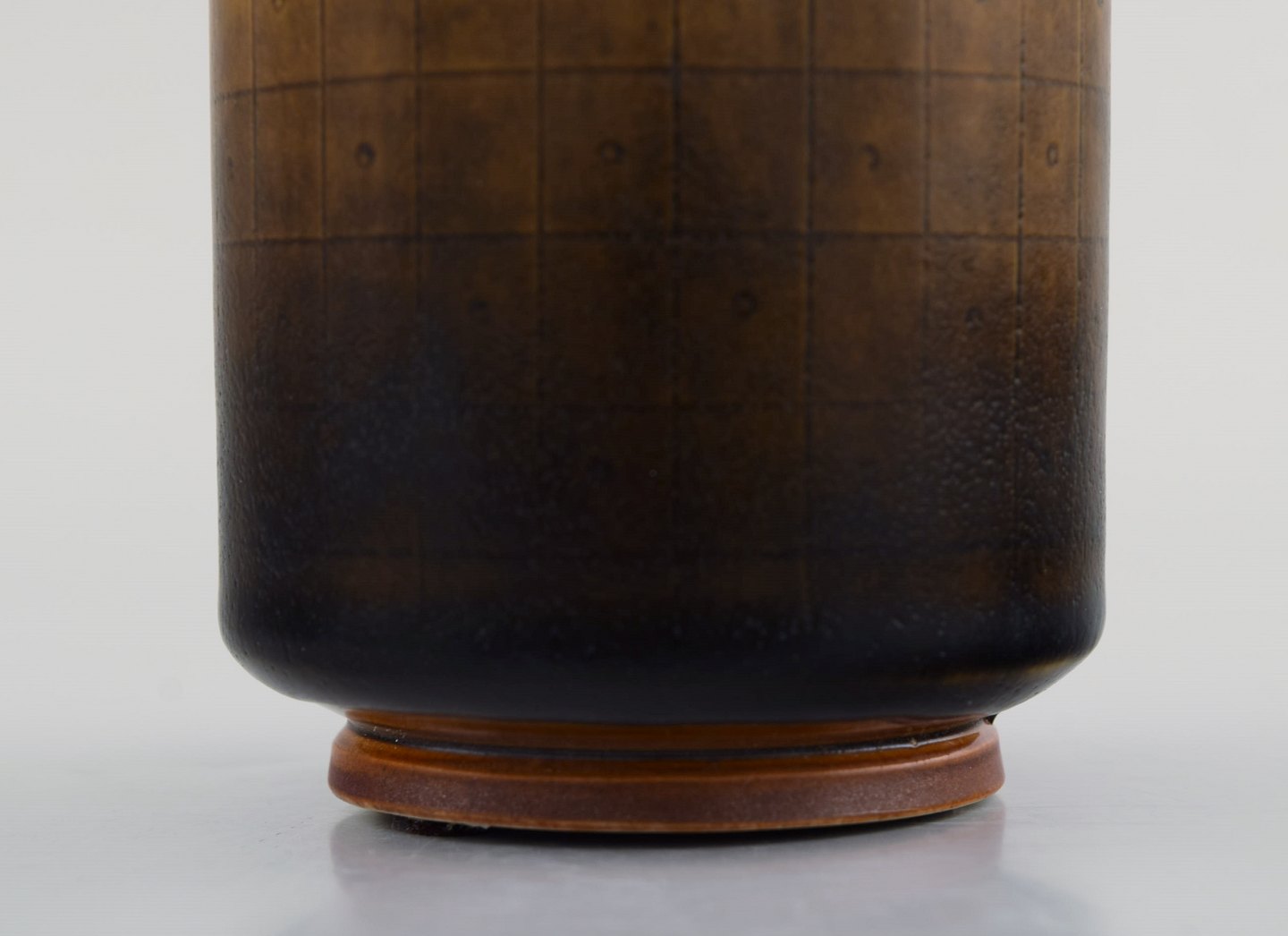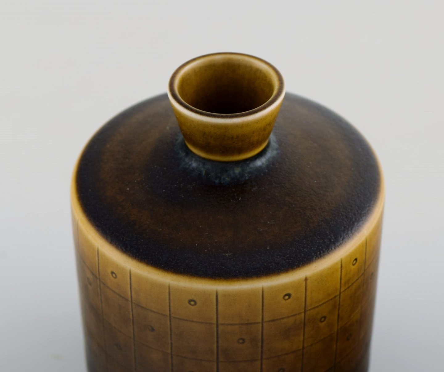 Berndt Friberg for Gustavsberg Studio Hand. Modernistisk vase i glaseret keramik med ternet design. Smuk glasur i lysebrune nuancer. Dateret 1962. Måler: 11,5 x 8 cm. I flot stand. Indridset signatur.