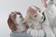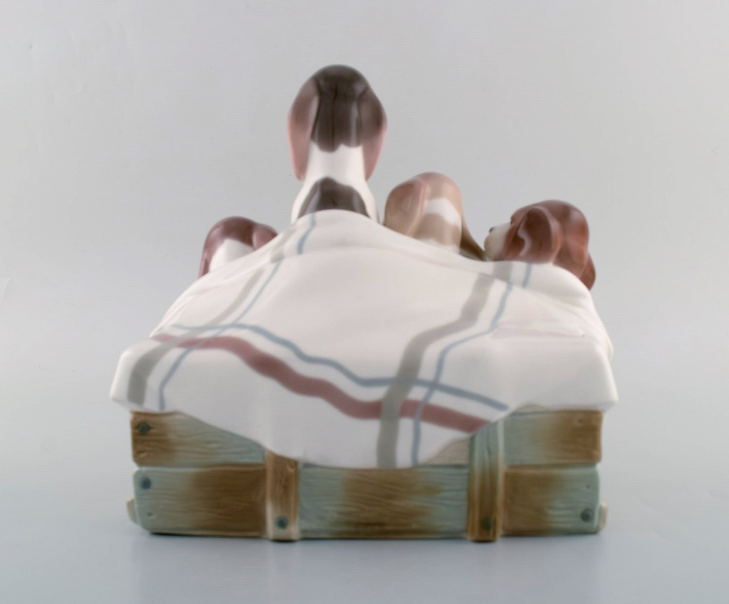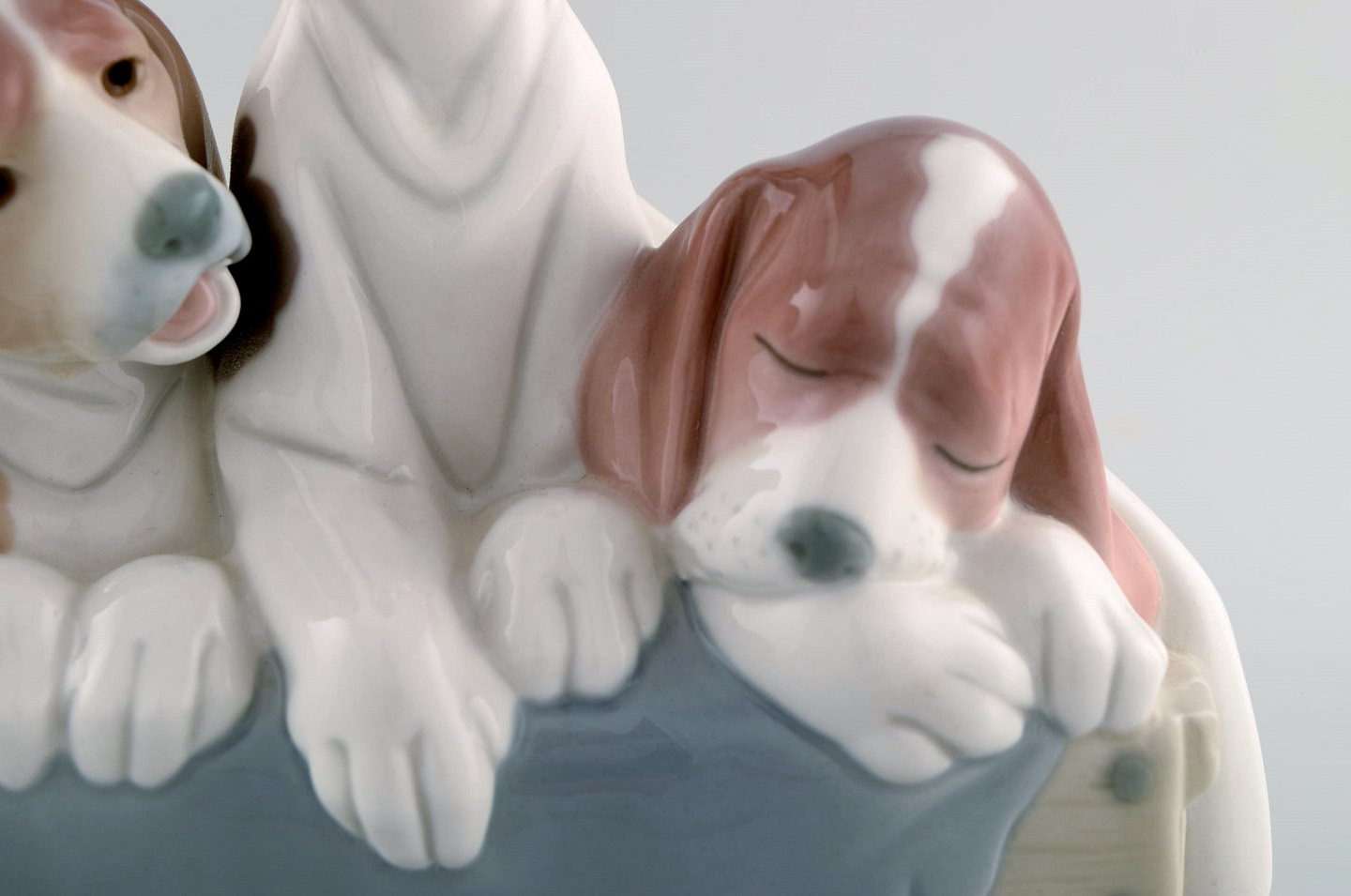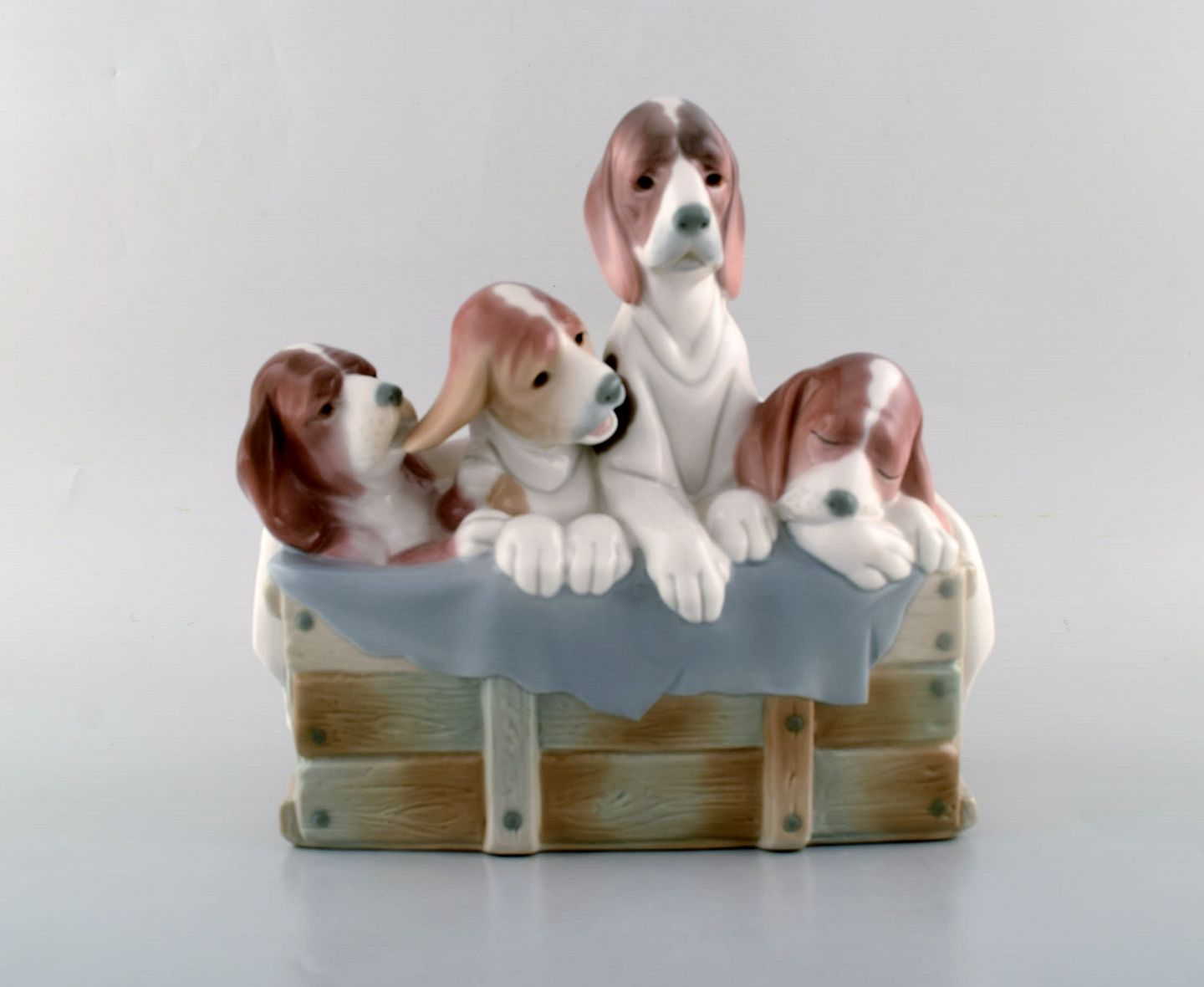 Lladro, Spanien. Stor figur i glaseret porcelæn. Fire hvalpe i kurv. 1980'erne. Måler: 23 x 23 cm. I flot stand. Stemplet.