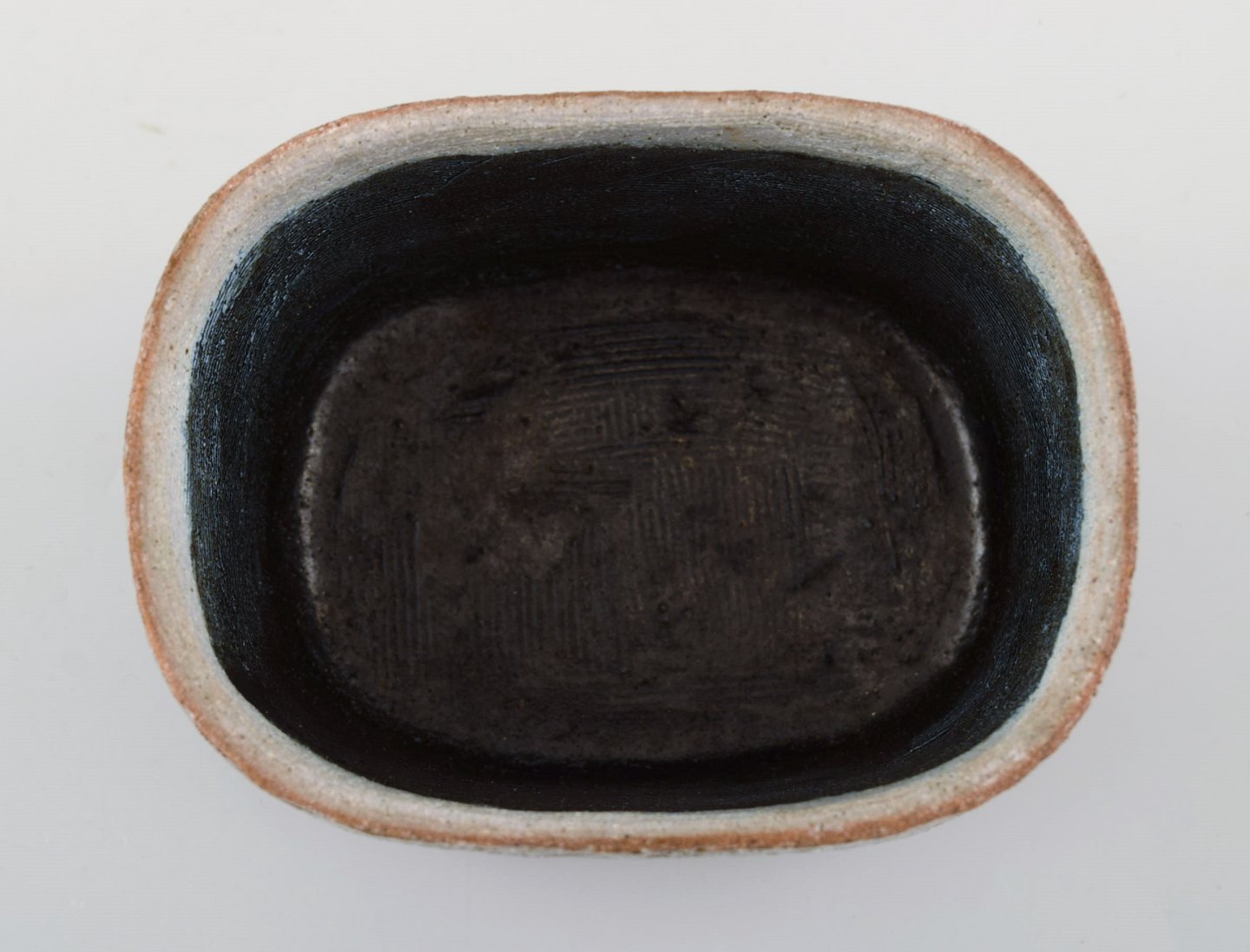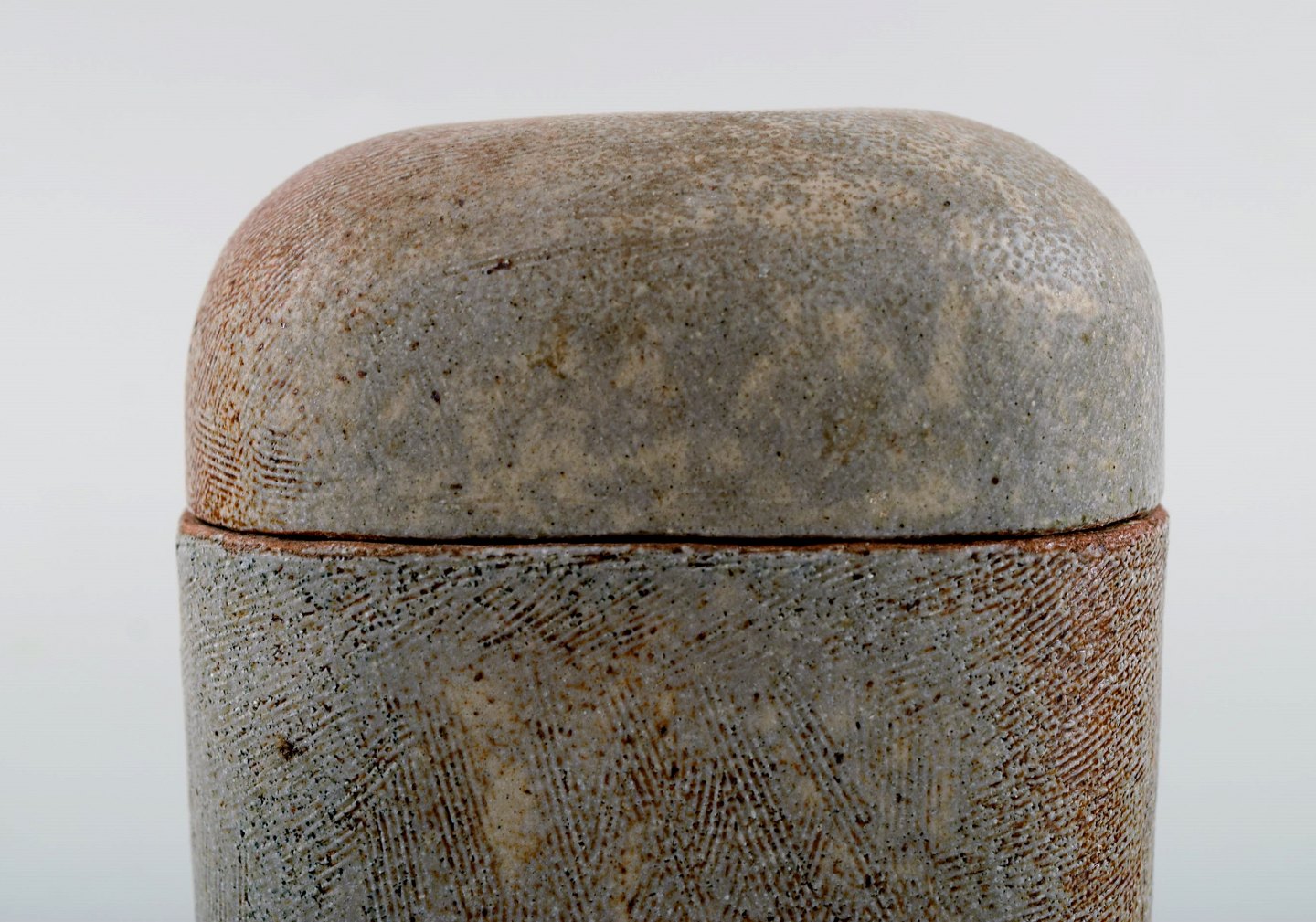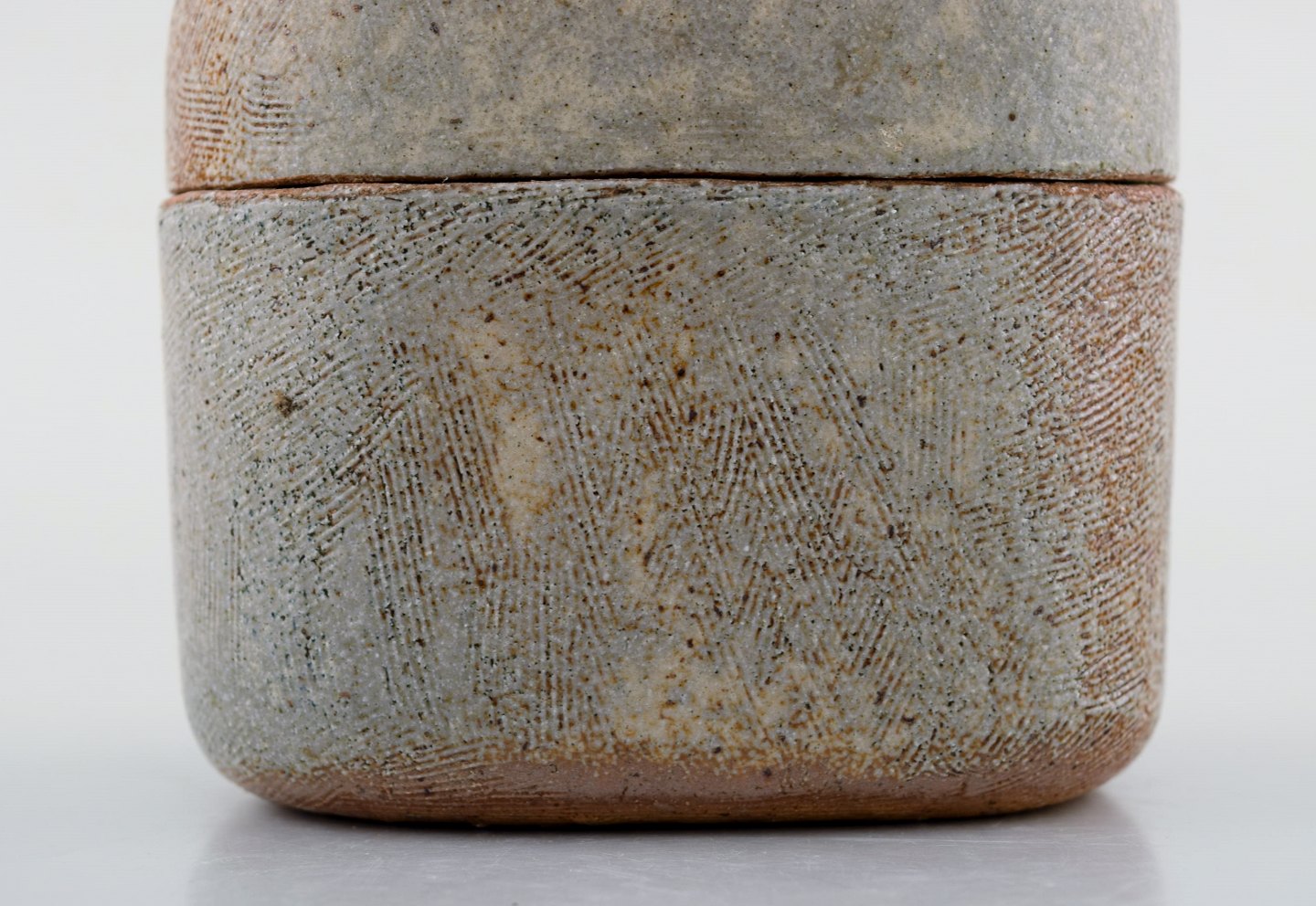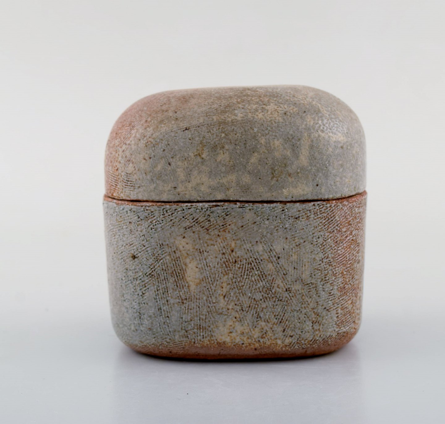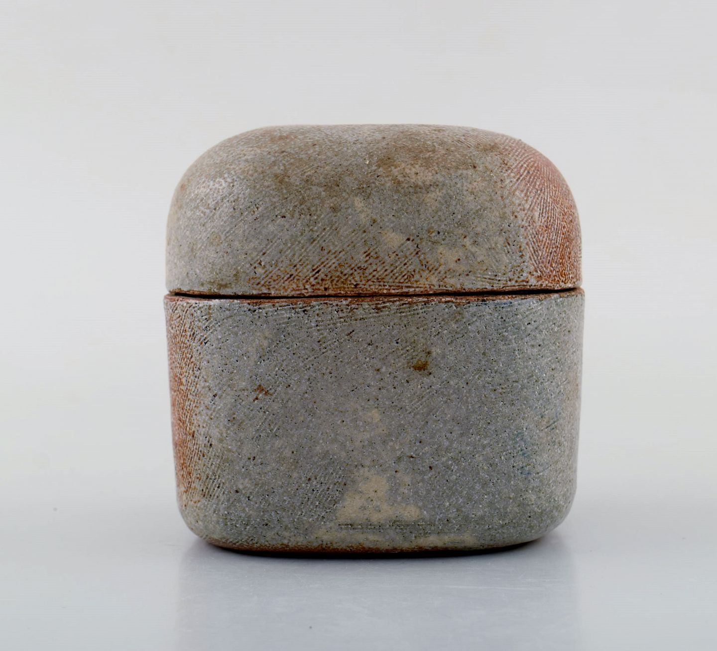 Skandinavisk keramiker. Unika lågkrukke i glaseret keramik. Rå glasur i grå toner. 1970/80'erne. Måler: 10,5 x 10,5 cm. I flot stand. Utydeligt signeret.