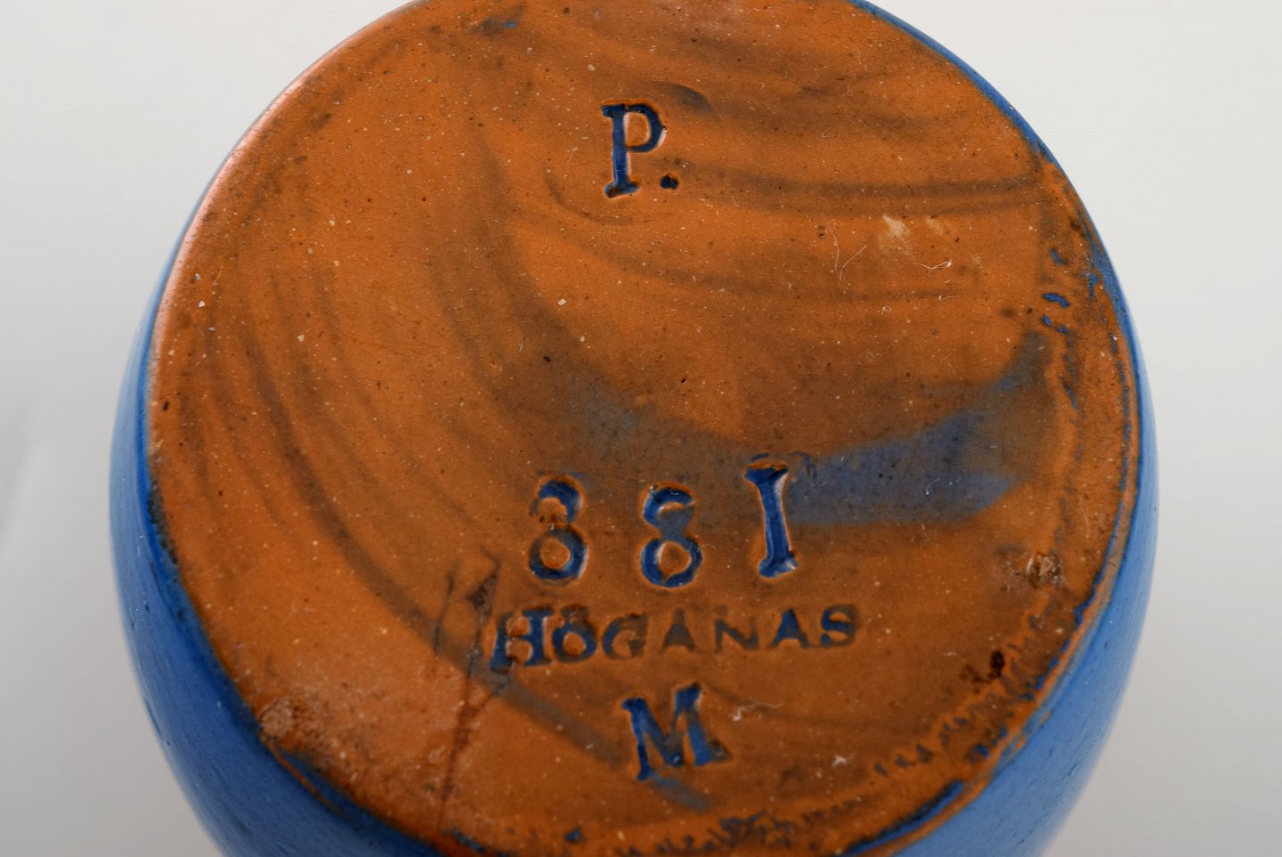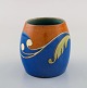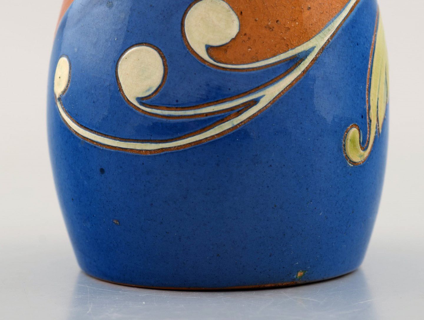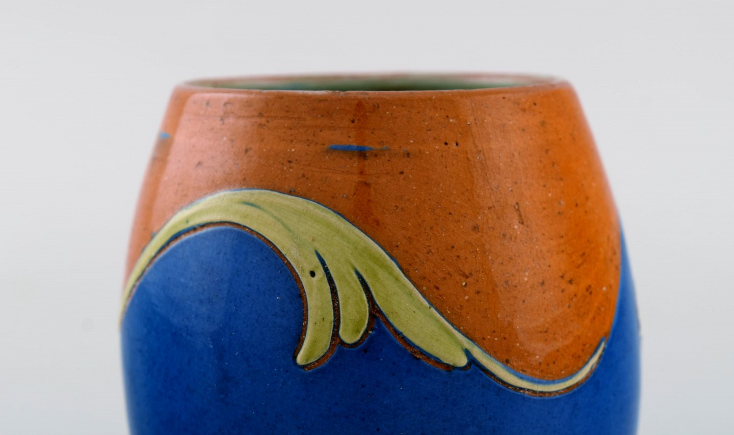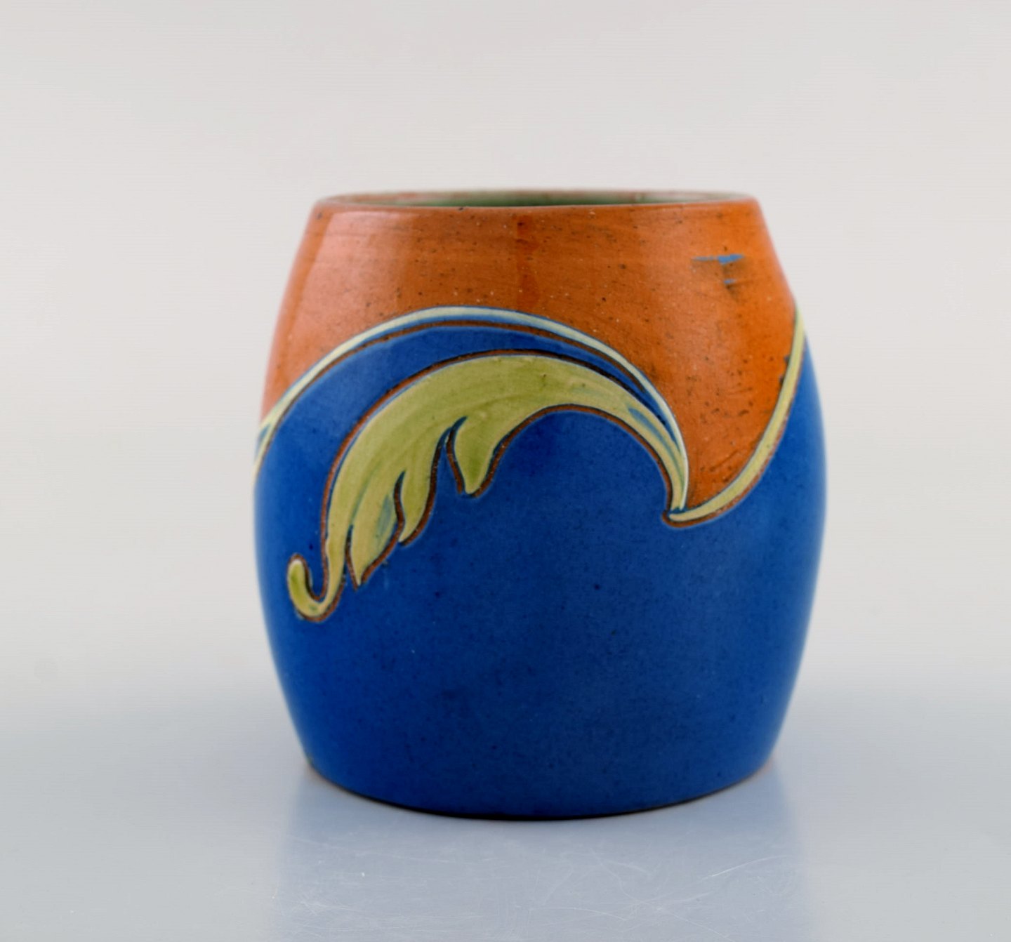 Antik Höganäs art nouveau vase i glaseret keramik. Snirkler og blade på blå og rødbrun på baggrund. Tidligt 1900-tallet. Måler: 9,5 x 9 cm. I flot stand. Stemplet.