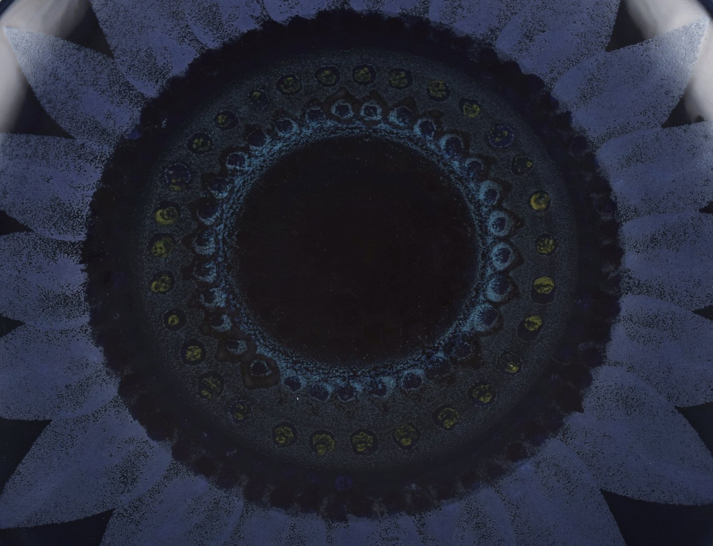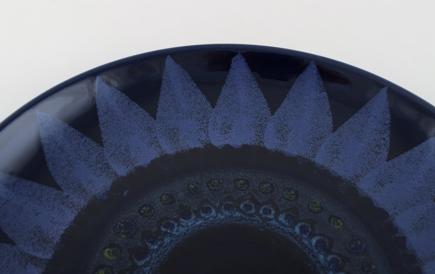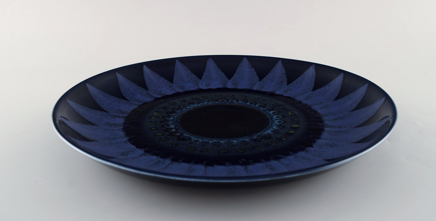 Hilkka-Liisa Ahola (1920-2009) for Arabia. Stort modernistisk unika fad i glaseret keramik med blomstermotiv i blå nuancer. 1960/70'erne. Måler: 31,5 x 3,5 cm. I flot stand. Signeret.