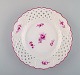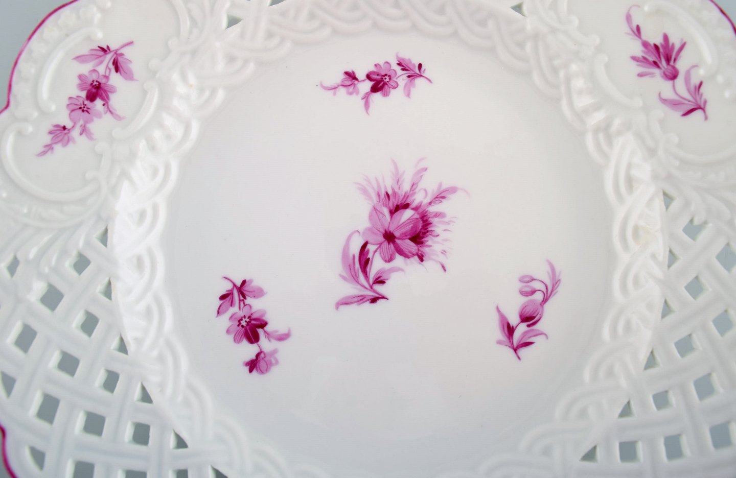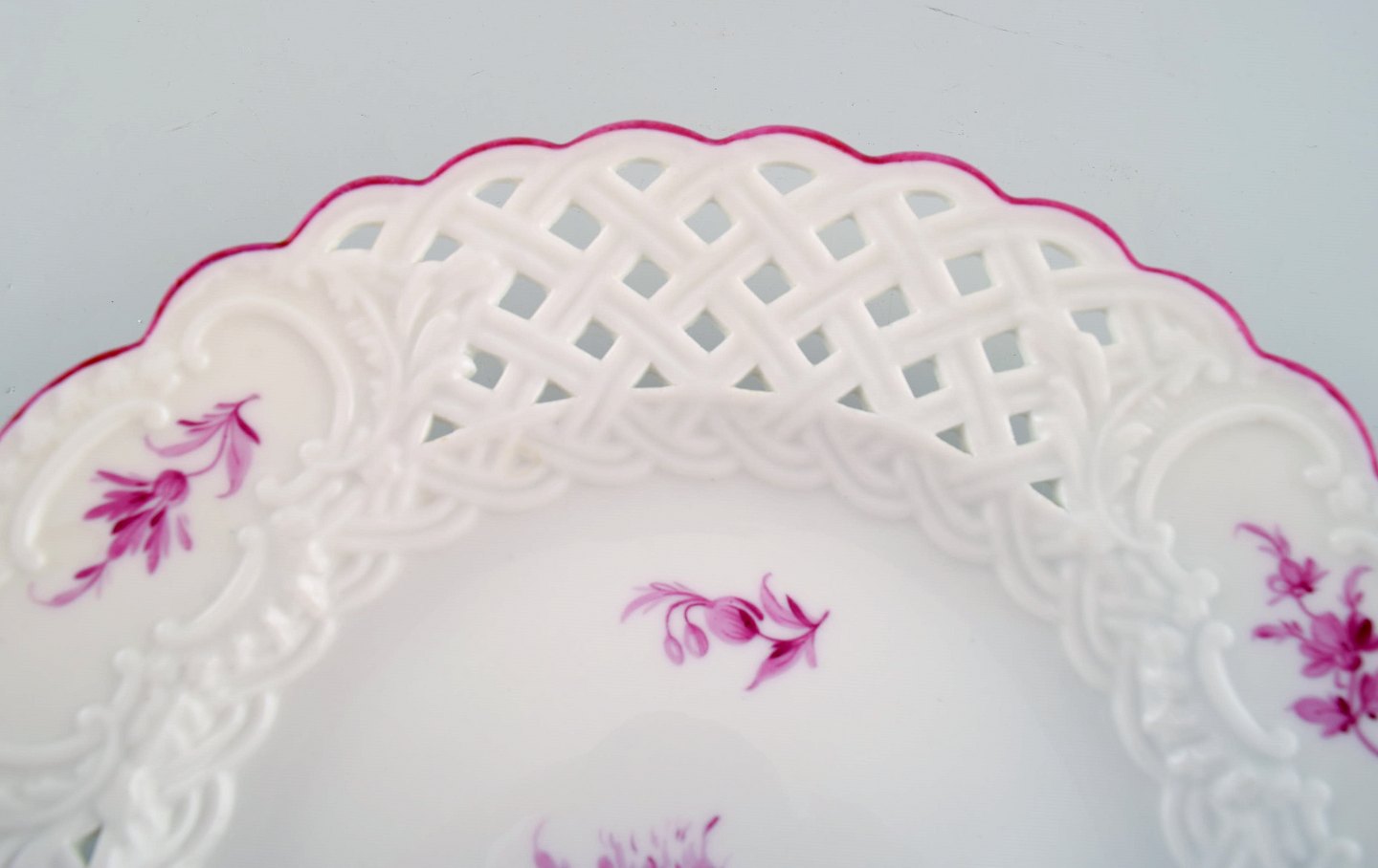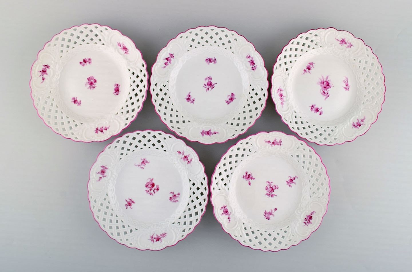 Fem antikke gennembrudte Meissen tallerkener i håndmalet porcelæn med lyserøde blomstermotiver. 1800-tallet. Diameter: 20,5 cm. Stemplet. I flot stand. 2. Sortering.