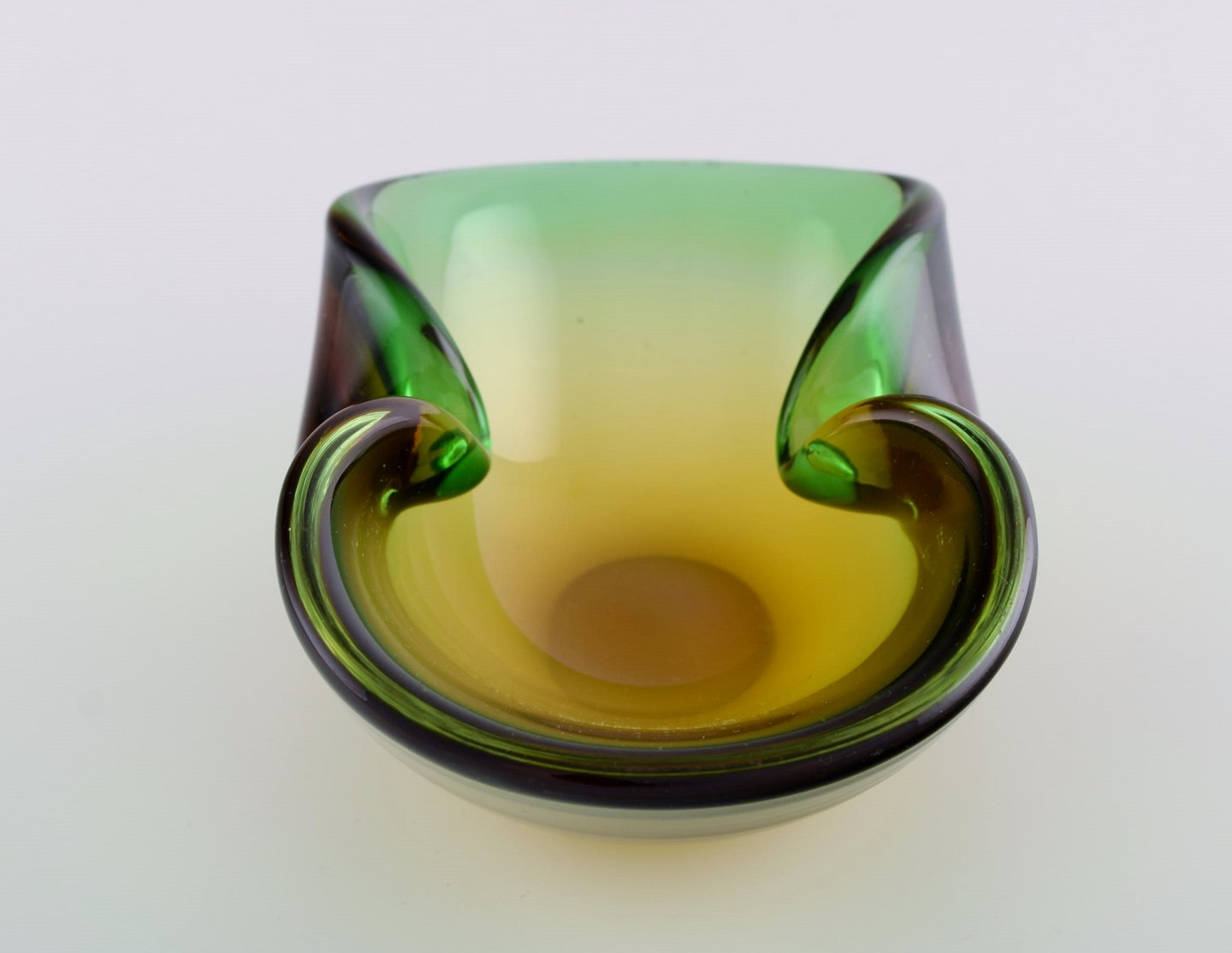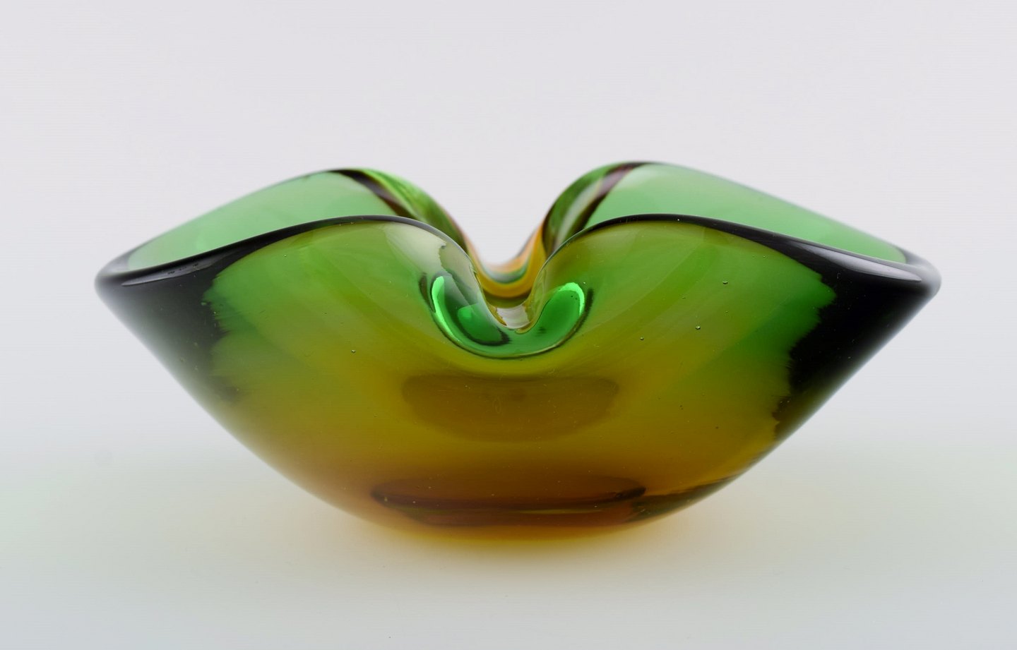 Murano skål i grønligt mundblæst kunstglas. Italiensk design, 1960'erne. Måler: 18 x 7,2 cm. I perfekt stand.