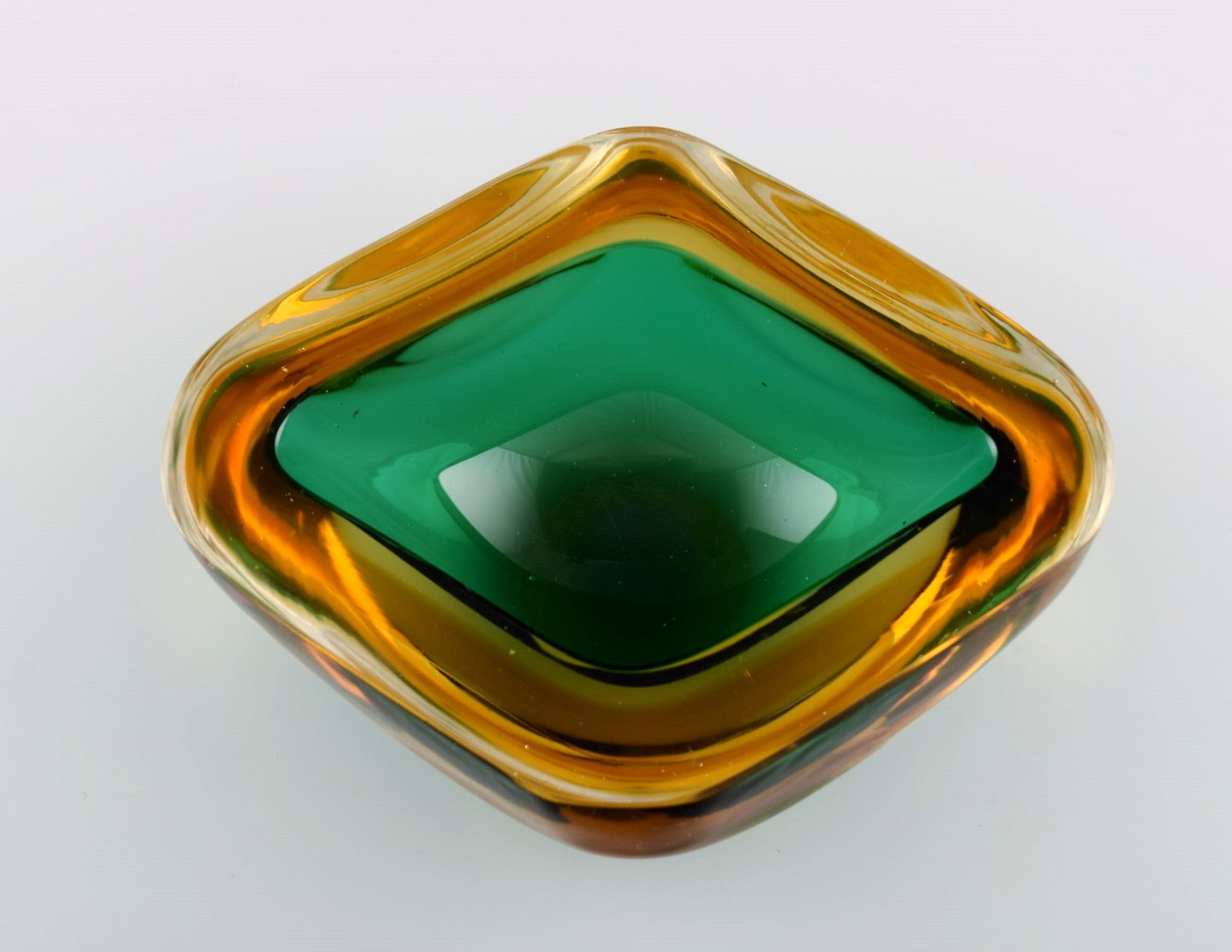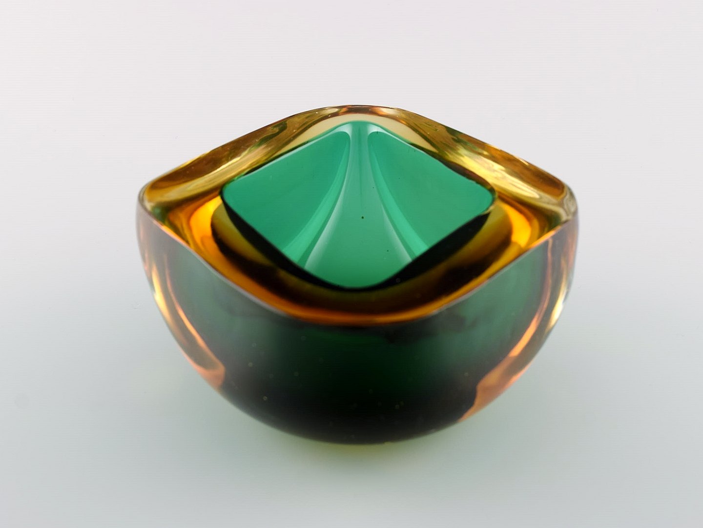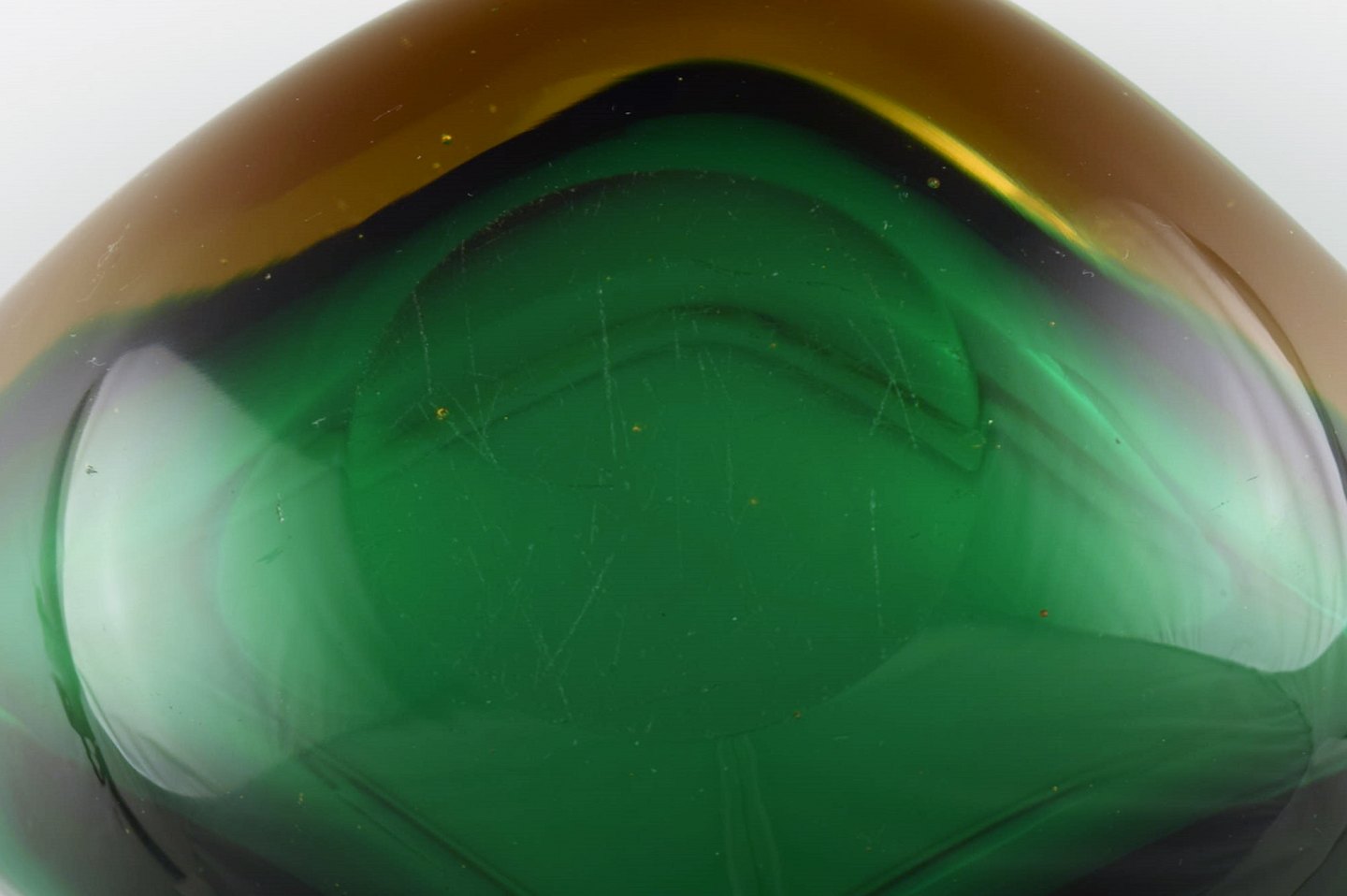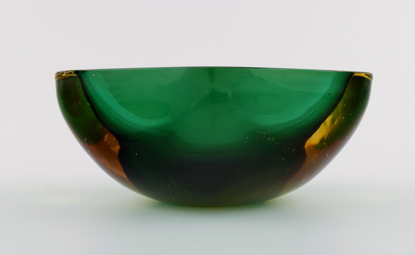 Murano skål i grønt og ravfarvet mundblæst kunstglas. Italiensk design, 1960'erne. Måler: 16,5 x 7 cm. I perfekt stand.