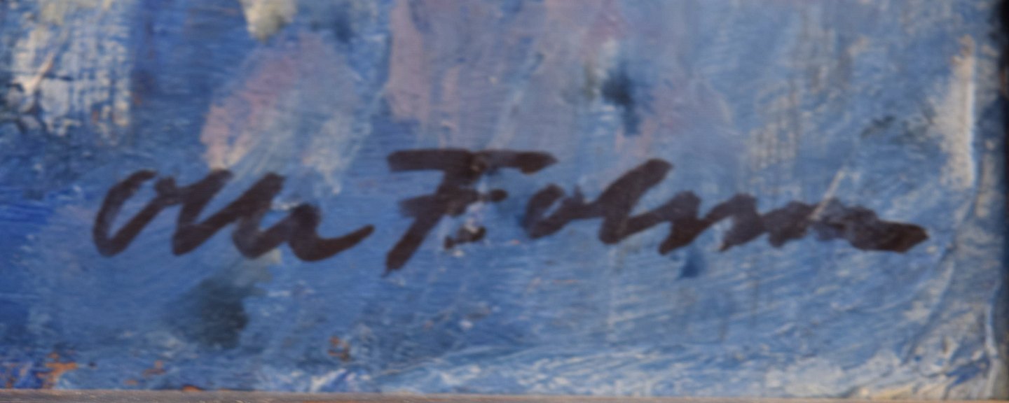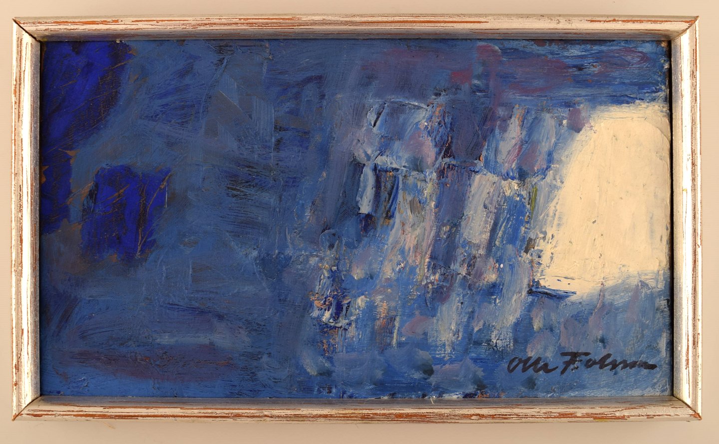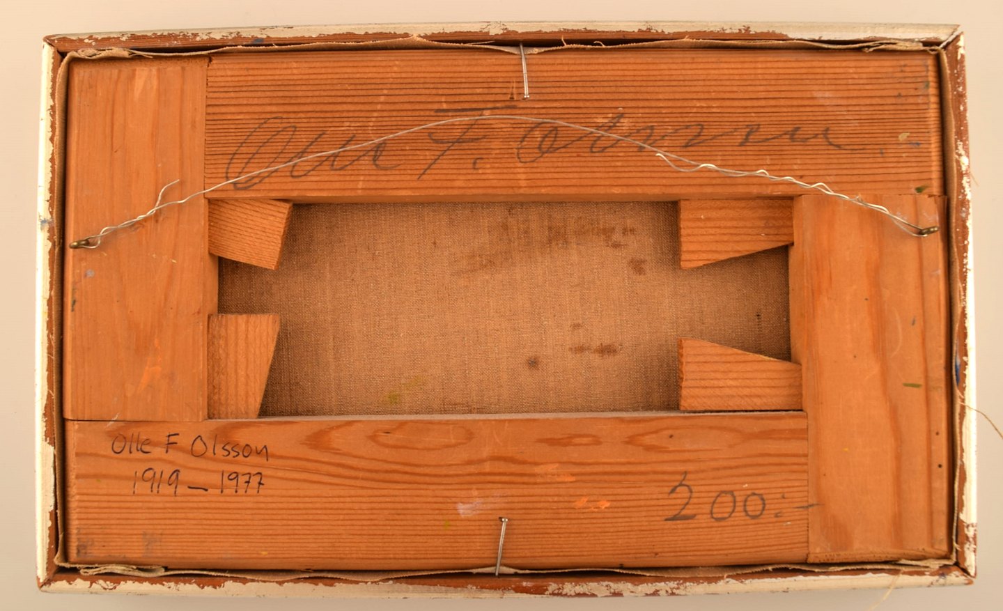 Olle Folke Olsson (1919-1977), svensk kunstner. Olie på lærred. Modernistisk komposition. 1950/60'erne. Lærredet måler: 26 x 14,5 cm. Rammen måler: 1 cm. Signeret. I flot stand.